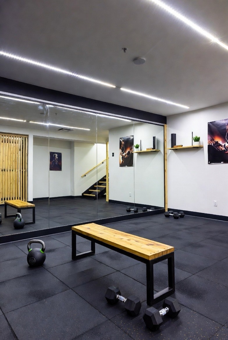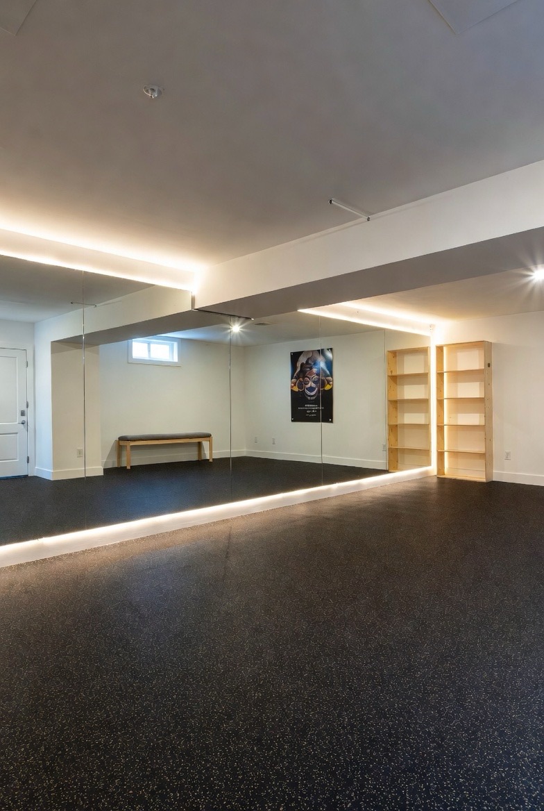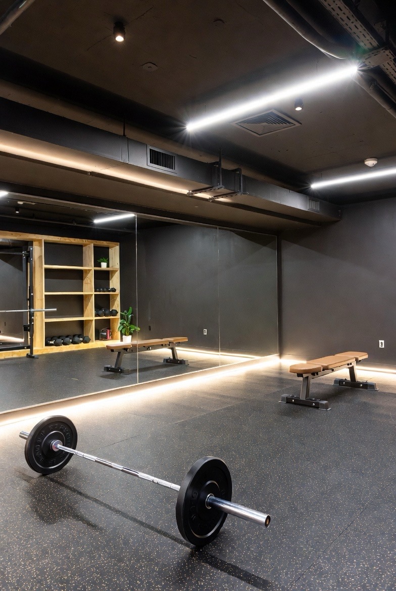 Transform your basement into a fitness retreat with mirrored walls, rubber flooring, and minimal decor. Use LED strip lights and natural wood shelving to keep it sleek, motivational, and stylish.