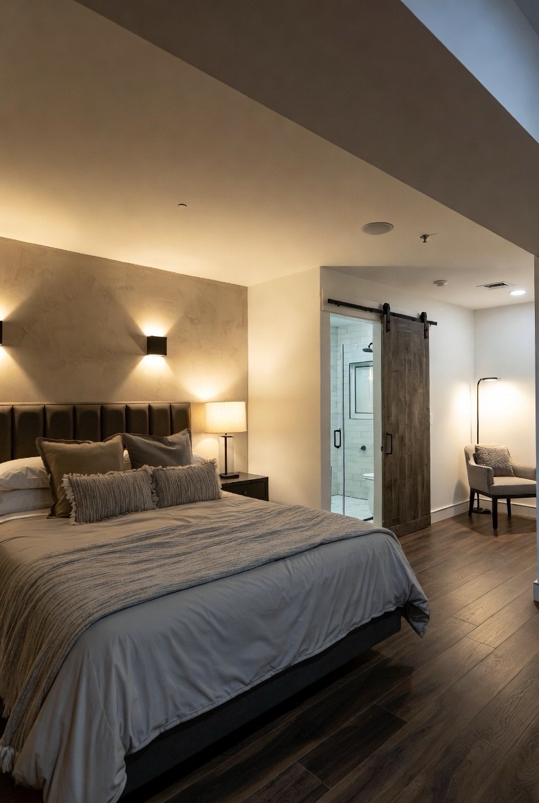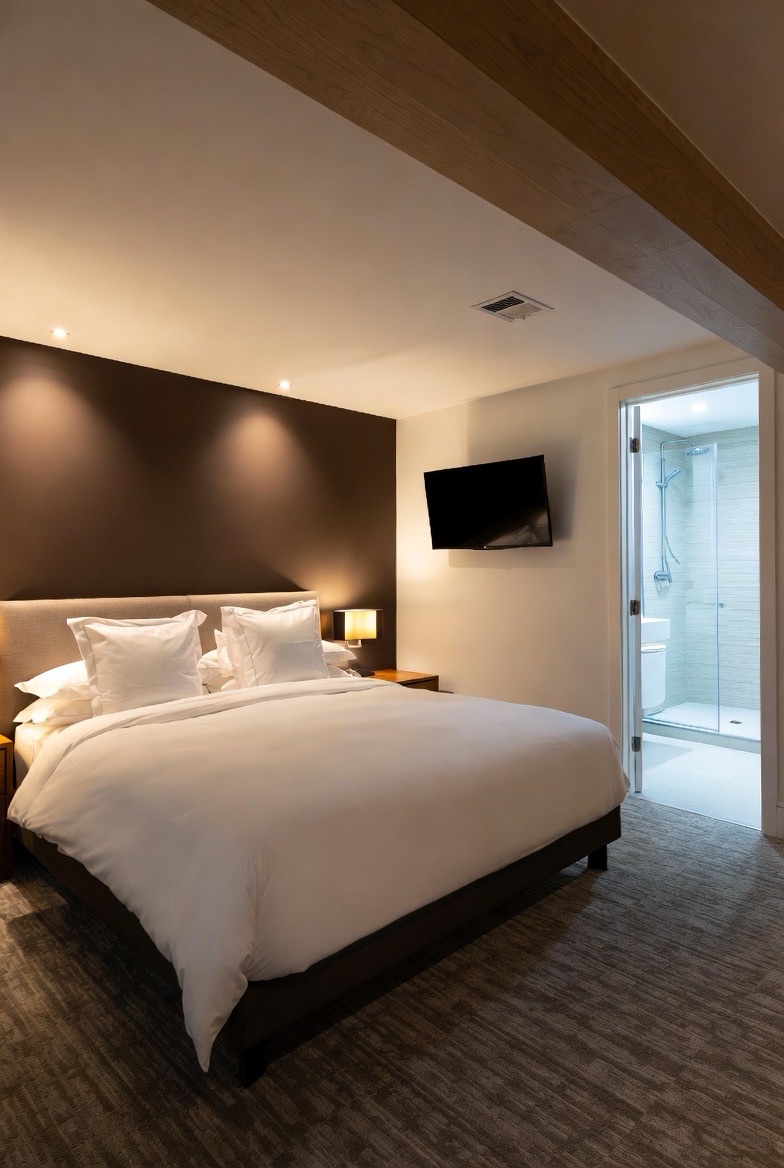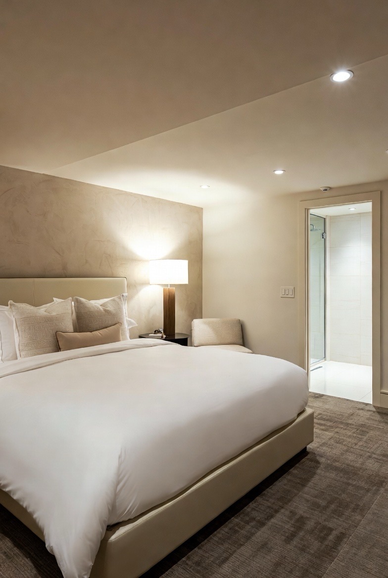Turn your basement into a hotel-style guest suite with plush bedding, warm lighting, and modern decor. Add an en-suite bathroom and subtle textures for an upscale, private retreat.