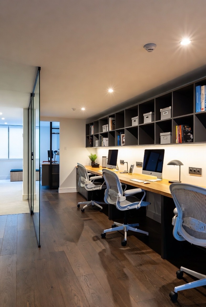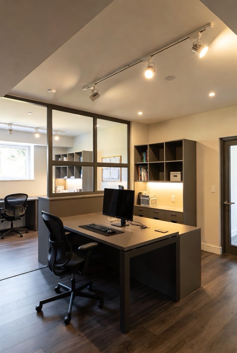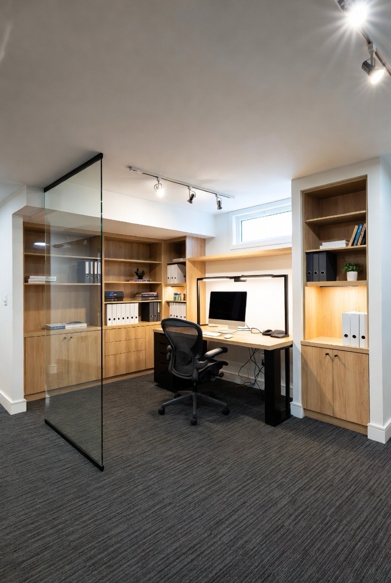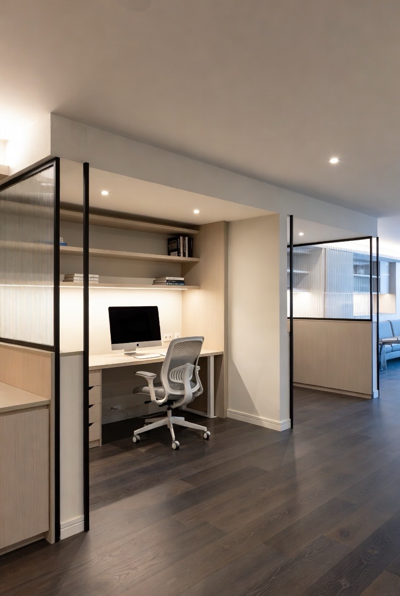 Design a productive workspace with clean lines, ergonomic furniture, and built-in shelving. Add accent lighting and glass partitions to create a modern office that feels open yet defined.