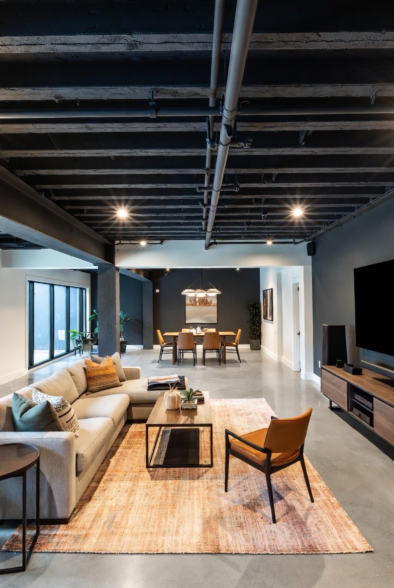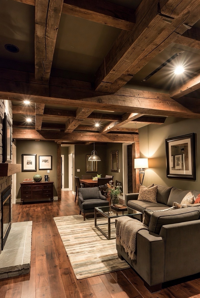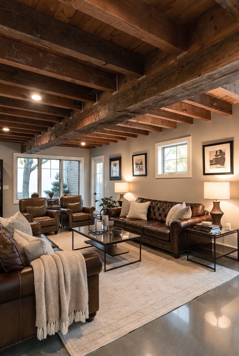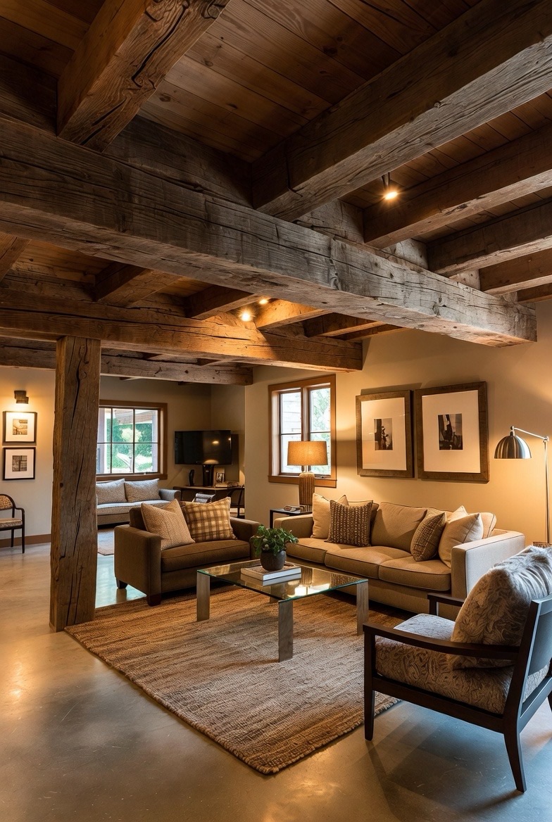 Blend rustic charm with modern design by pairing reclaimed wood beams with sleek furnishings. Add cozy textiles and warm lighting to create a basement that feels both refined and inviting.