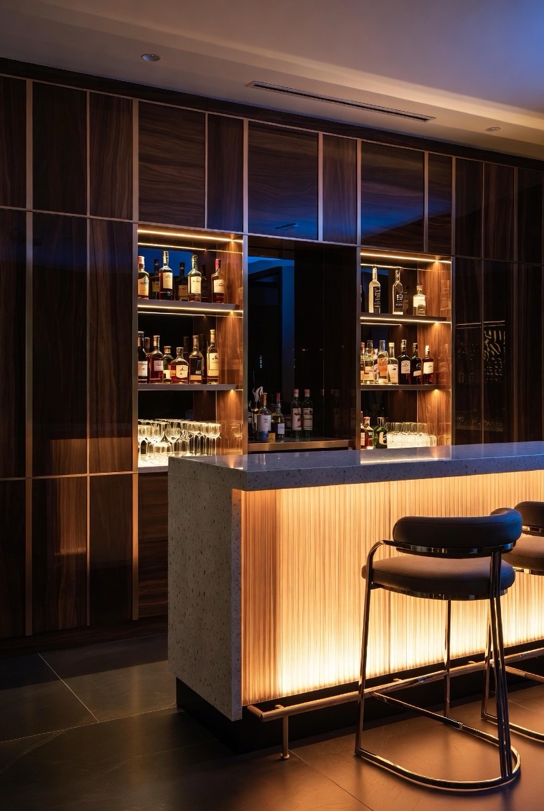 Create a striking home bar with quartz counters, backlit shelving, and high-gloss finishes. Pair metallic accents with moody lighting for a luxurious, after-dark ambiance.