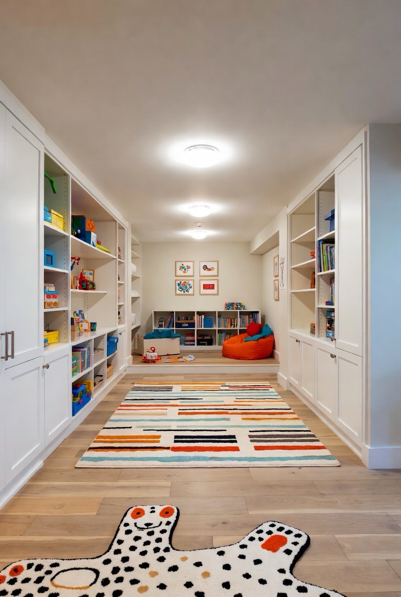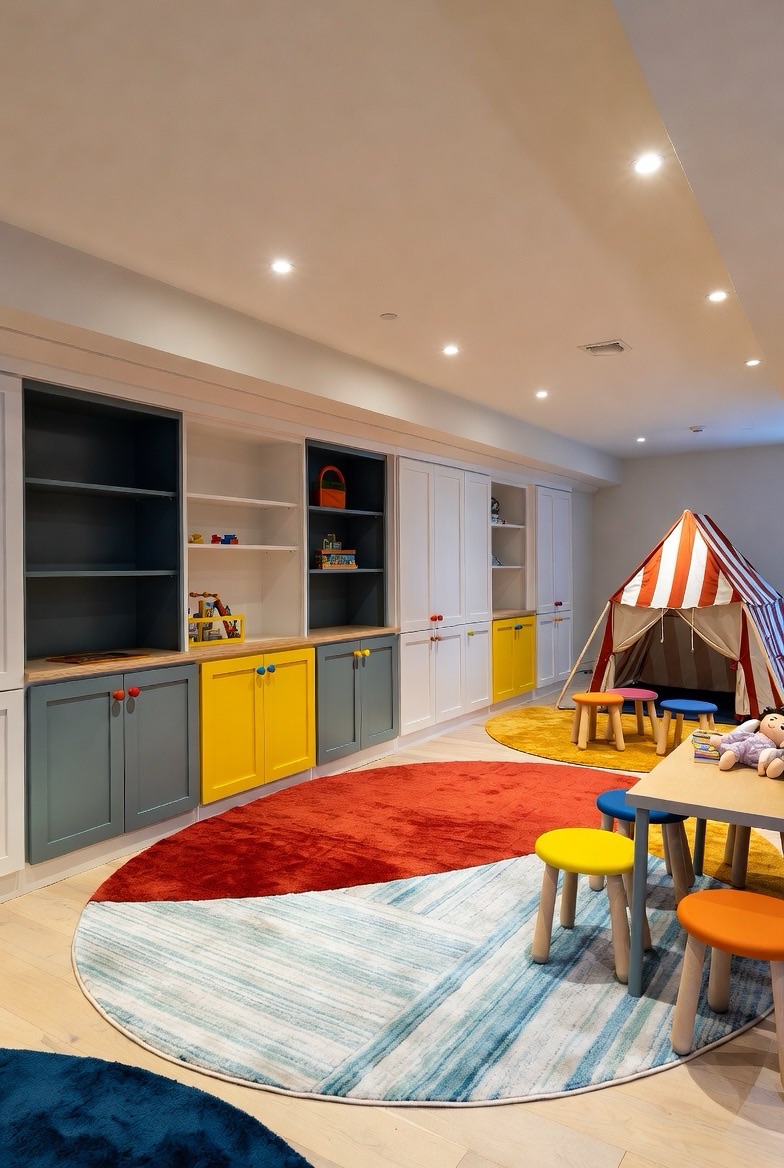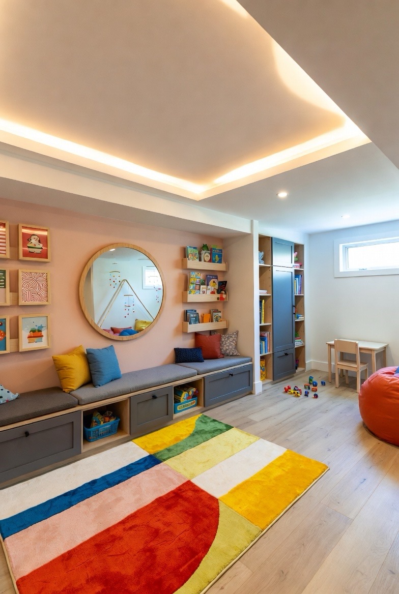 Design a playful yet polished space for kids featuring built-in storage, bright rugs, and activity zones. Use soft lighting and fun decor for a stylish area that sparks imagination.