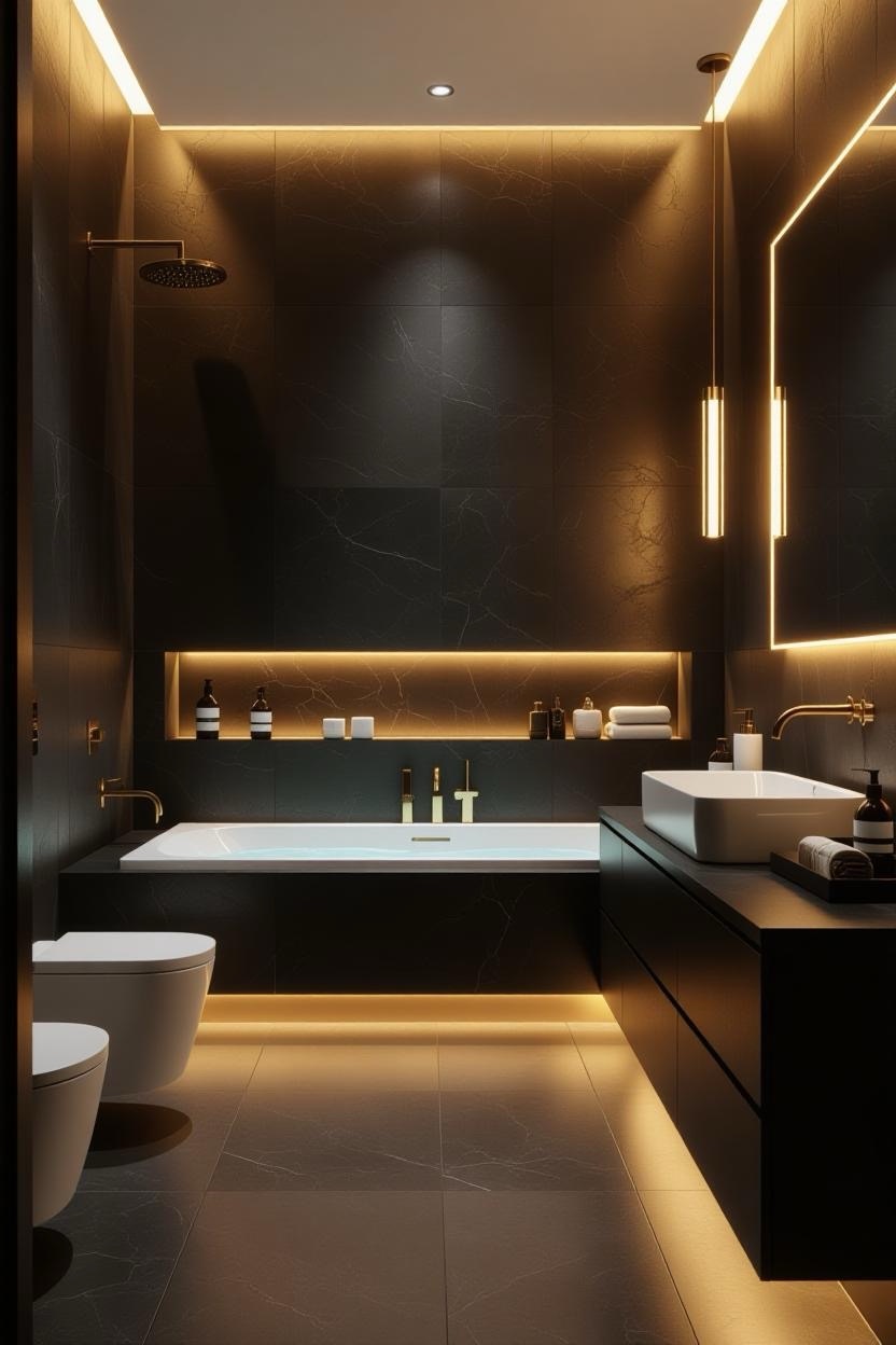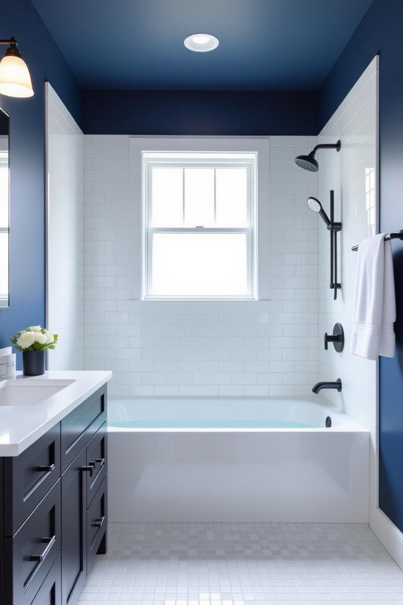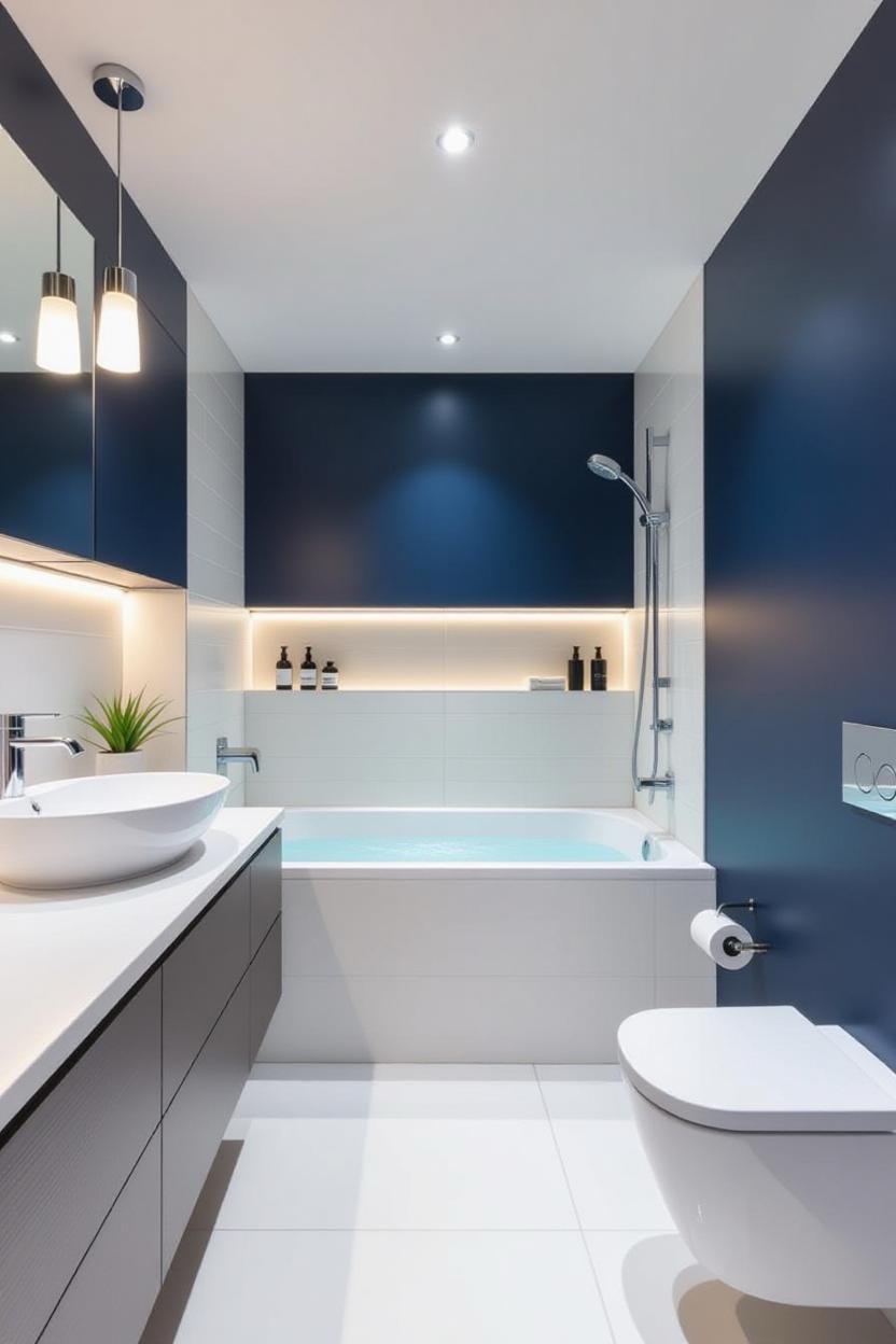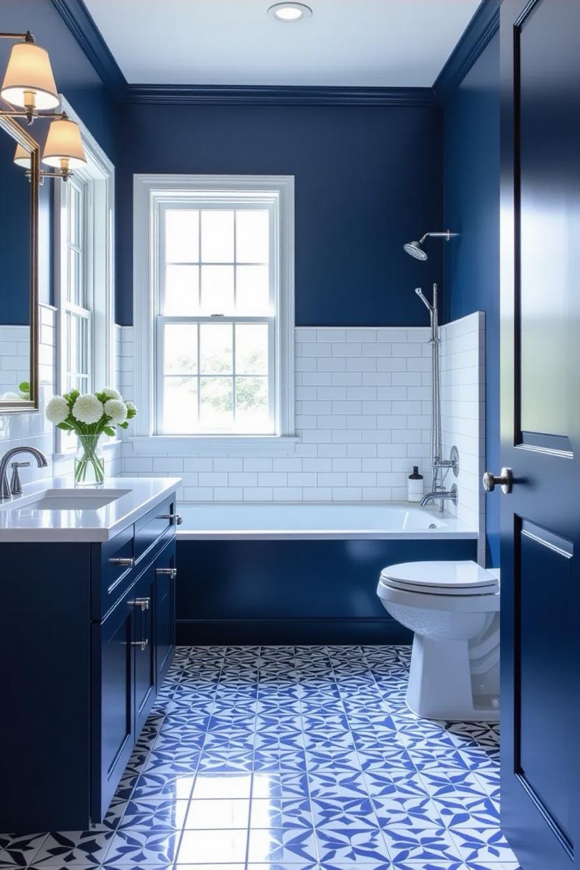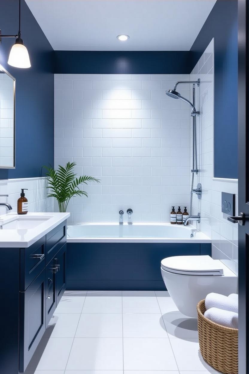 Navy blue adds richness and timeless style to bathrooms, especially when balanced with crisp white tiles and sleek fixtures. It’s perfect for a bold yet refined look.