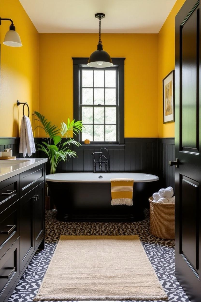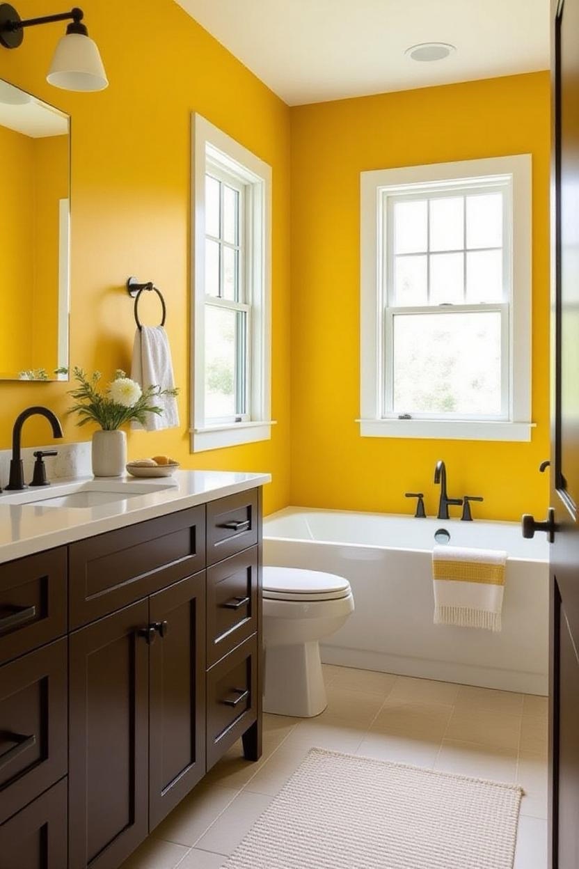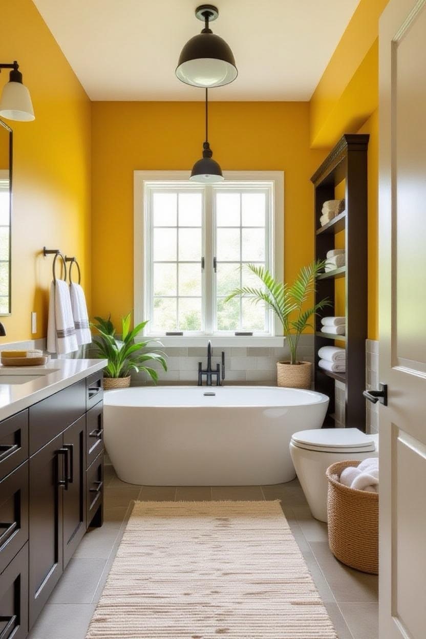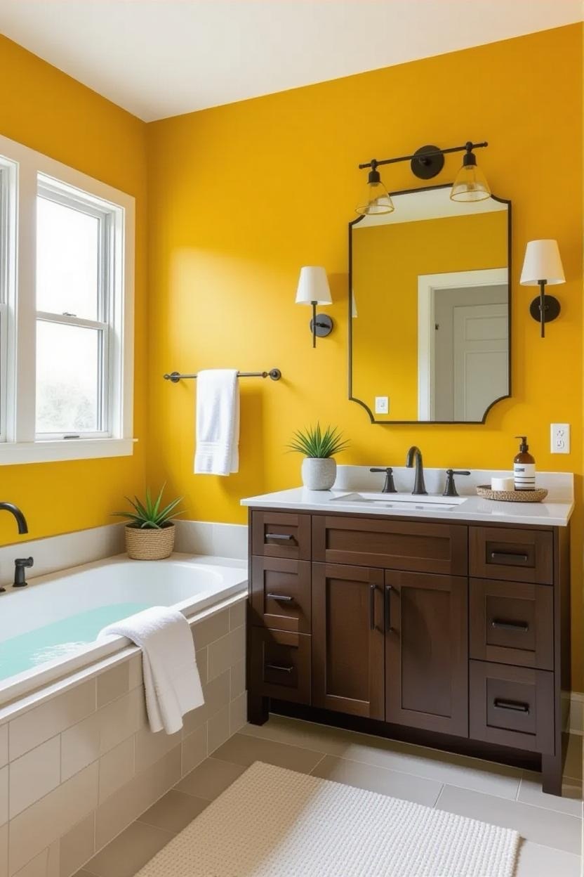 Mustard yellow is vibrant and stylish, perfect for bathrooms that need a touch of personality. It pairs beautifully with dark wood tones and matte black hardware.