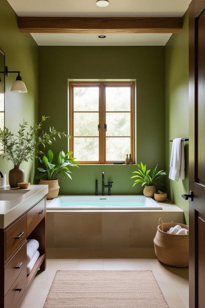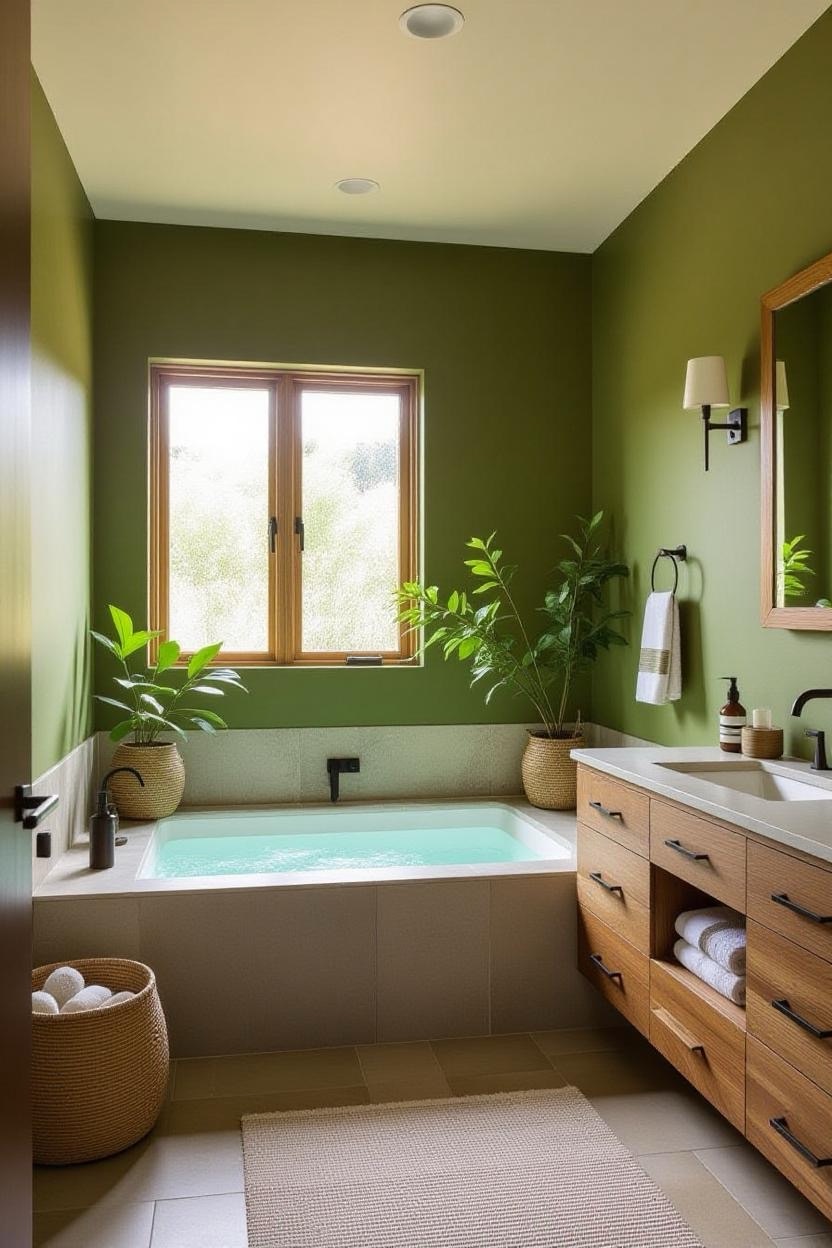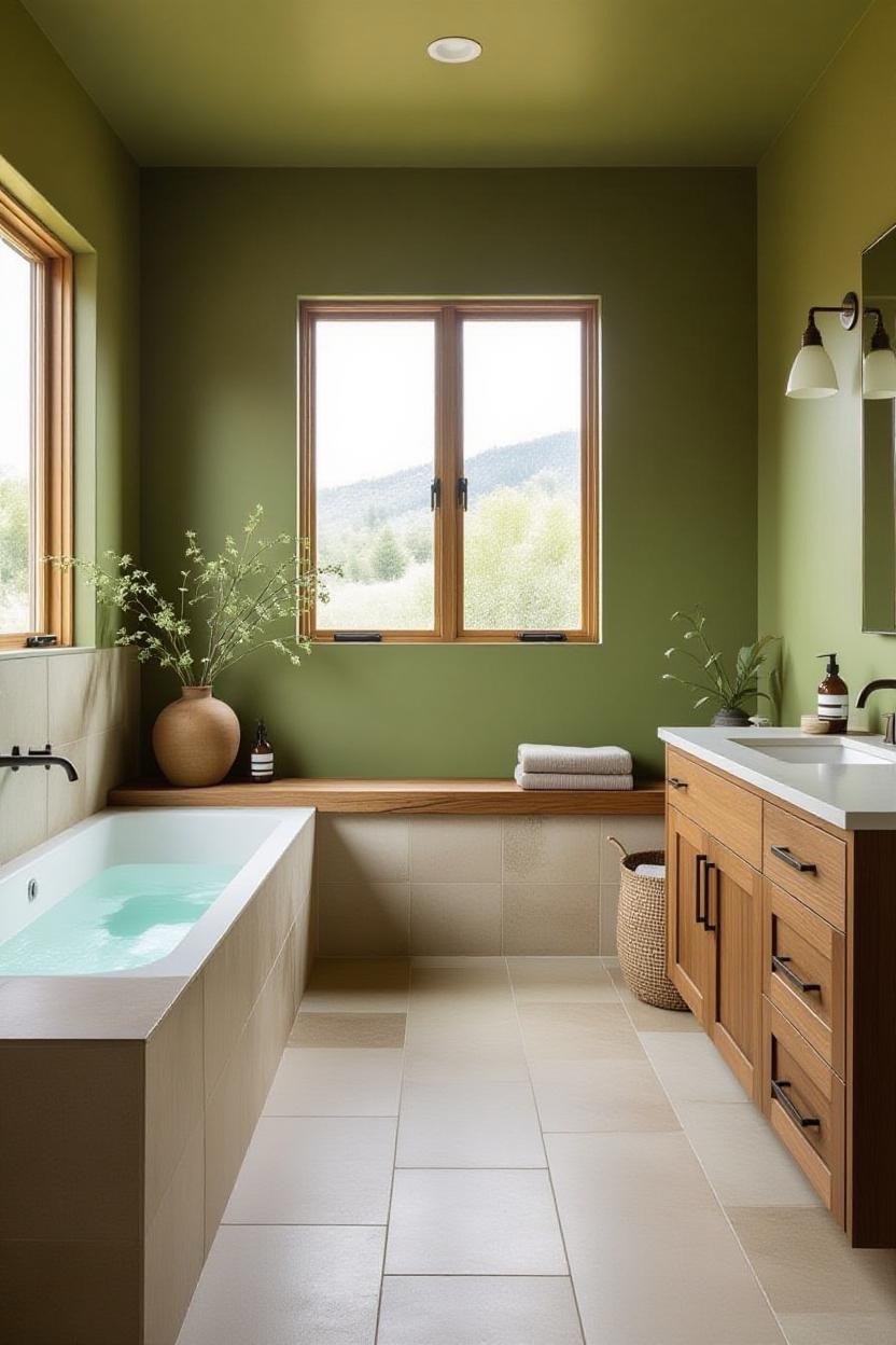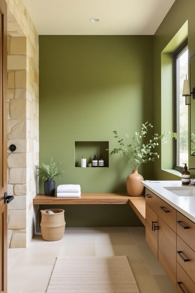 Olive green offers a rich, earthy tone that works beautifully in modern bathrooms with natural materials such as stone and wood.