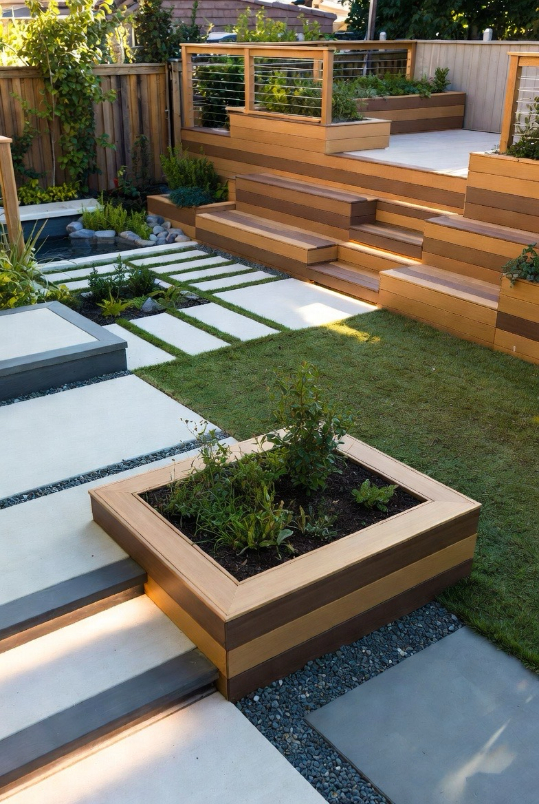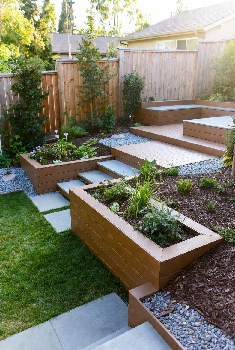 Raised planters define the perimeter of the yard while keeping the center open. They add greenery without shrinking usable space. Built-in planters also double as seating or visual borders for different zones.