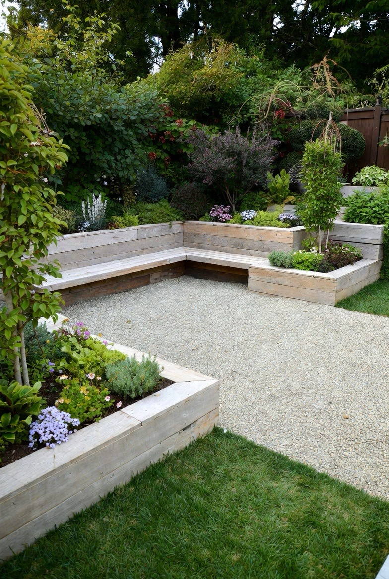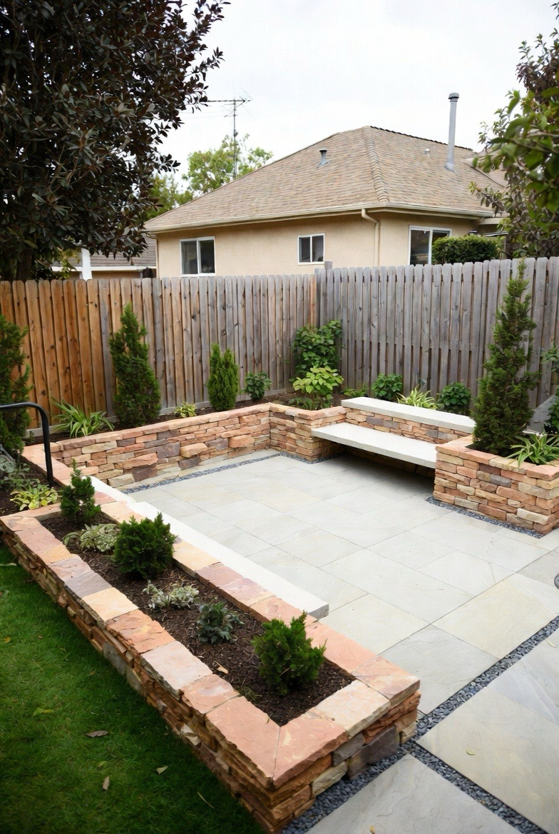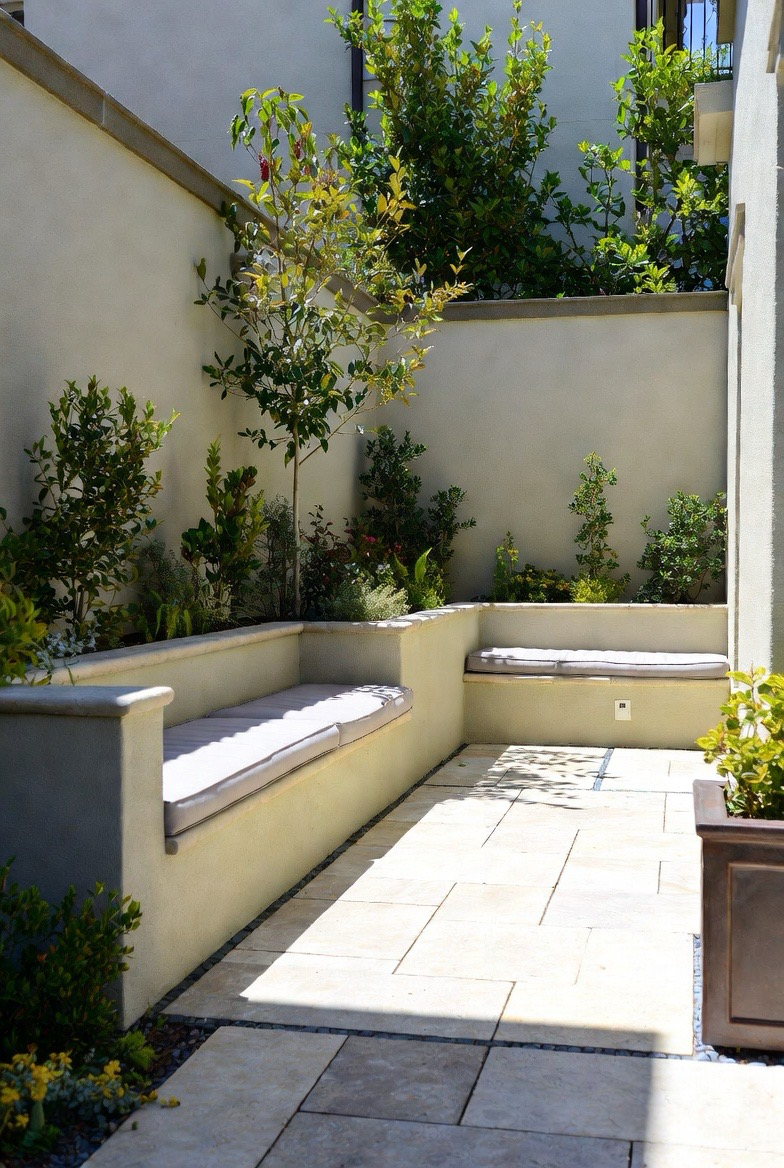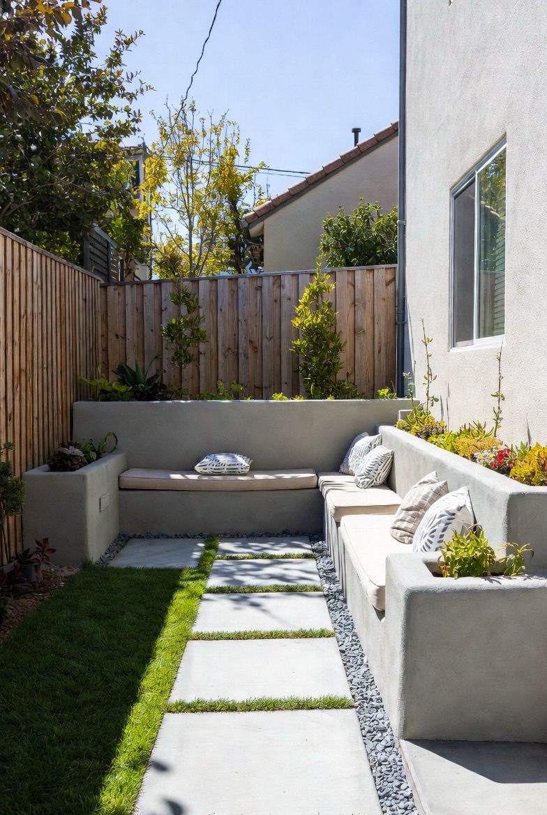 Built-in seating maximizes space by eliminating bulky furniture. Benches along walls or planters provide comfortable seating while maintaining clean lines. This solution keeps pathways clear and enhances the yard’s structure. Add outdoor cushions to soften the look and increase comfort.