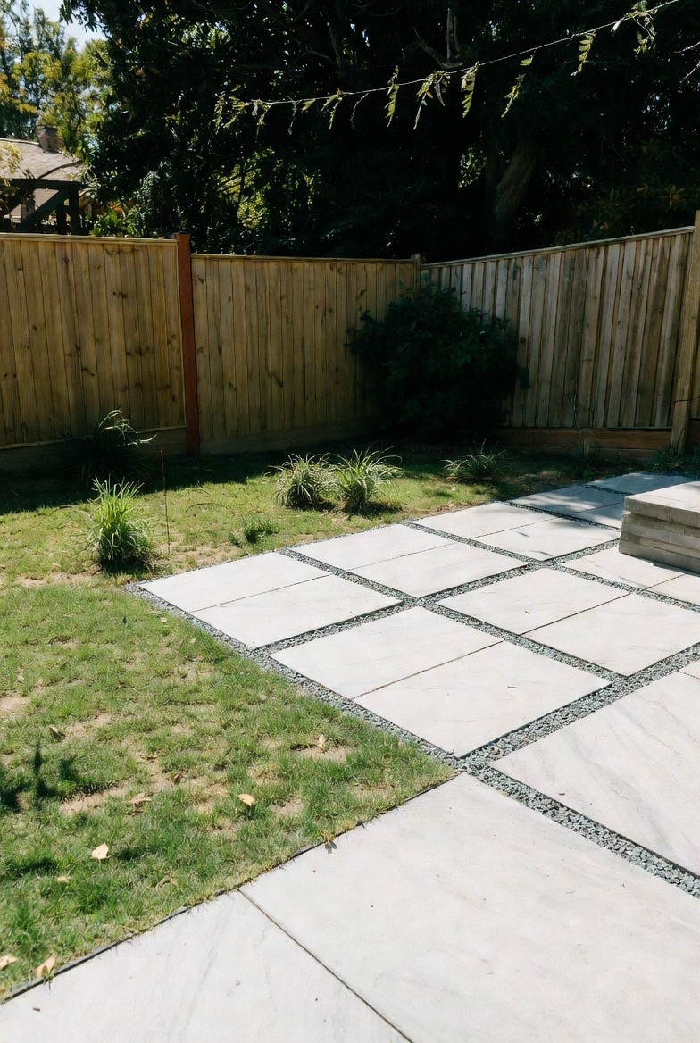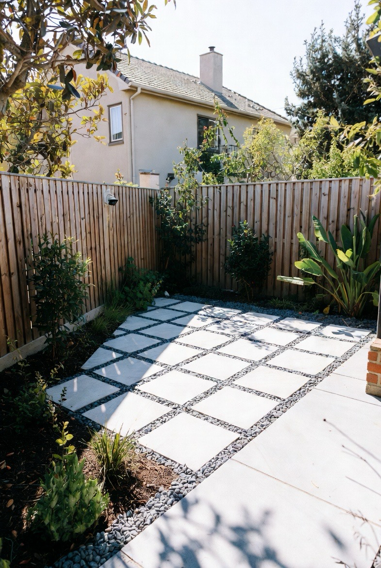 A compact paved patio creates a defined outdoor living area. Large pavers or uniform stone patterns keep the space feeling open and modern. Light-colored materials reflect light, making the yard appear larger. This is an ideal foundation for dining or lounging in small backyards.