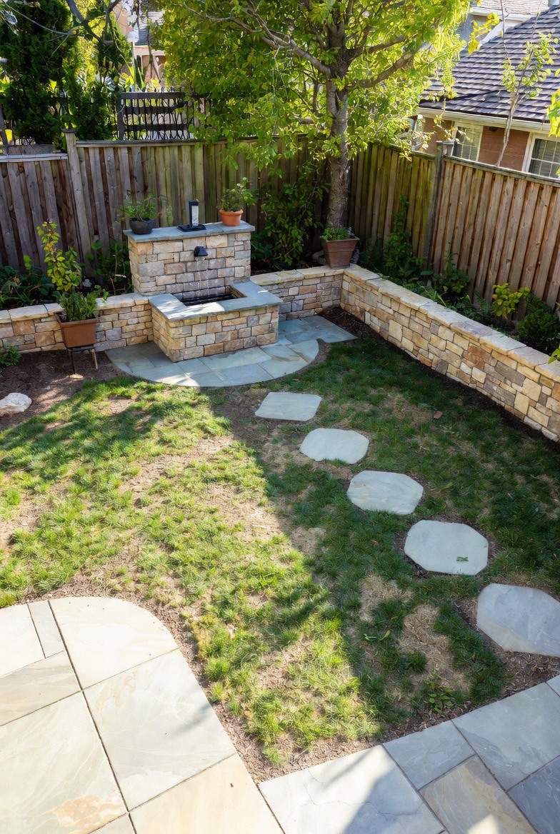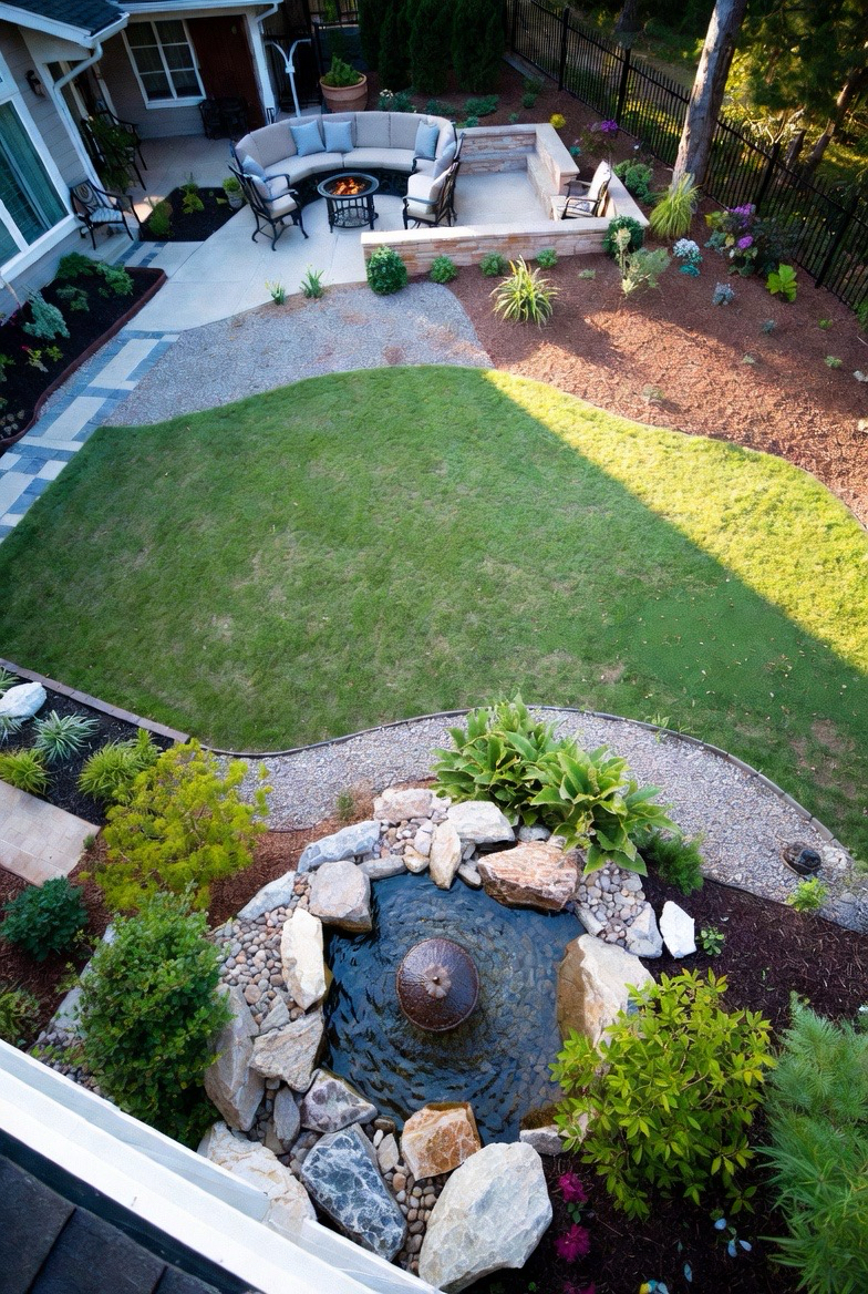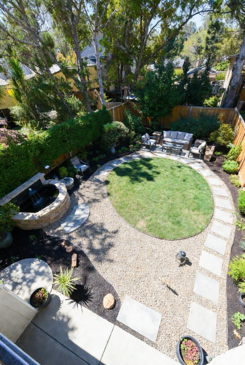 Using corners efficiently frees up central space. A small water feature, fire pit, or seating nook placed in a corner adds function without crowding the yard. This layout keeps the space open and balanced.