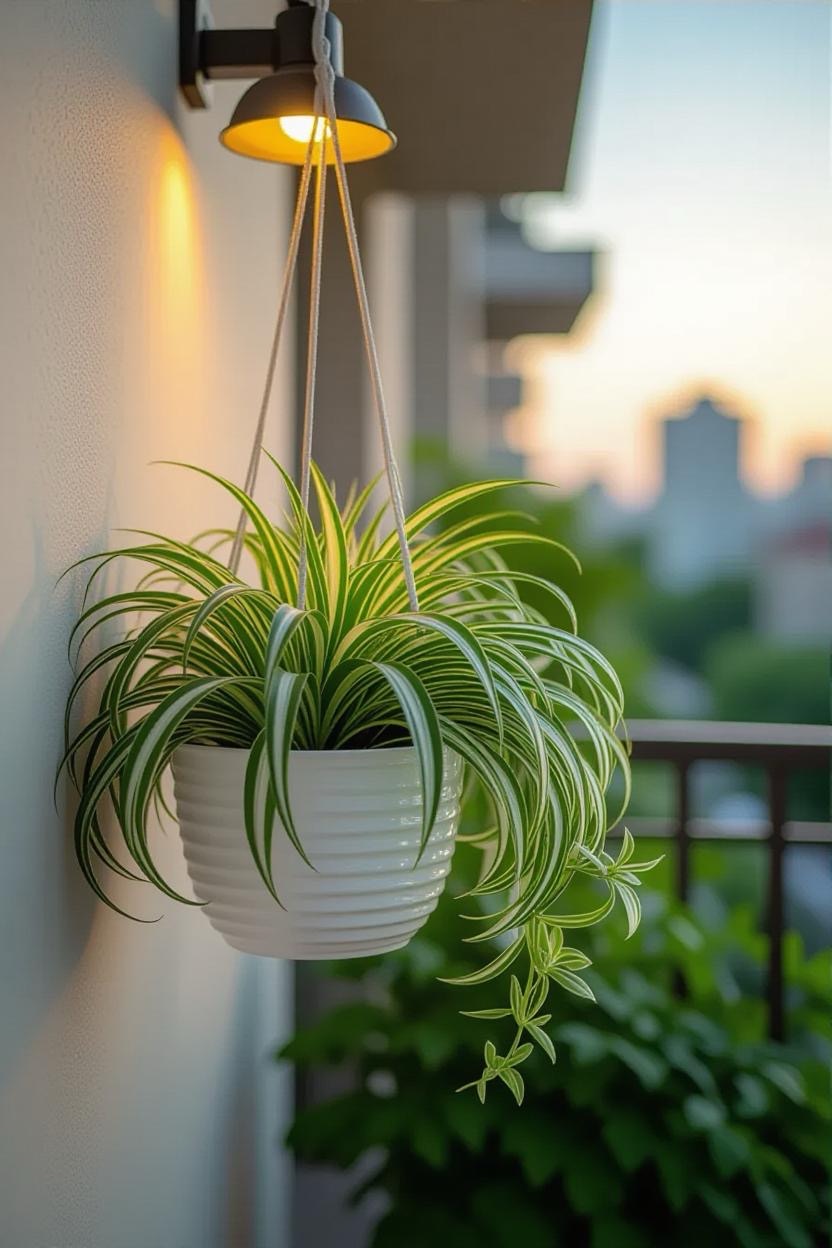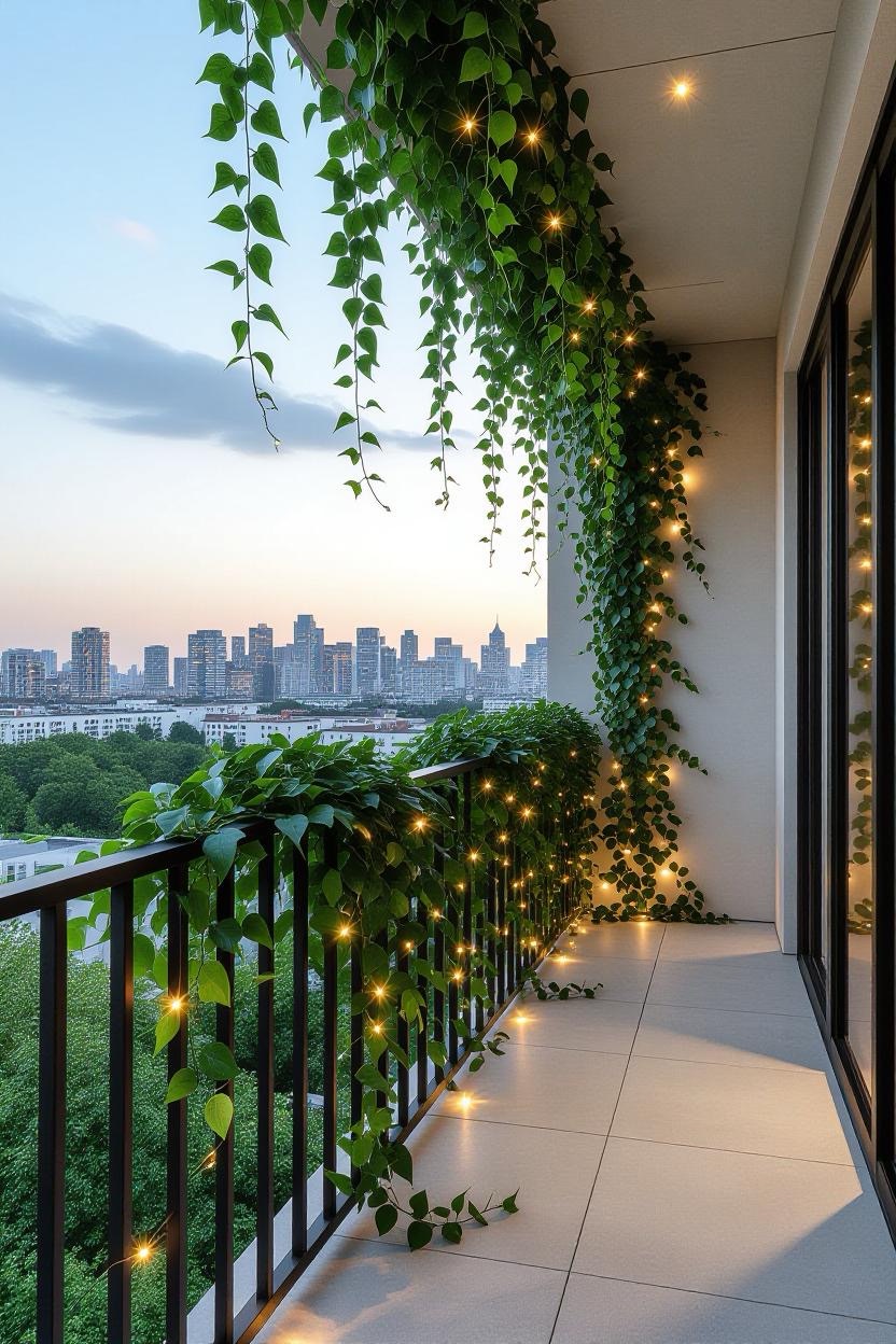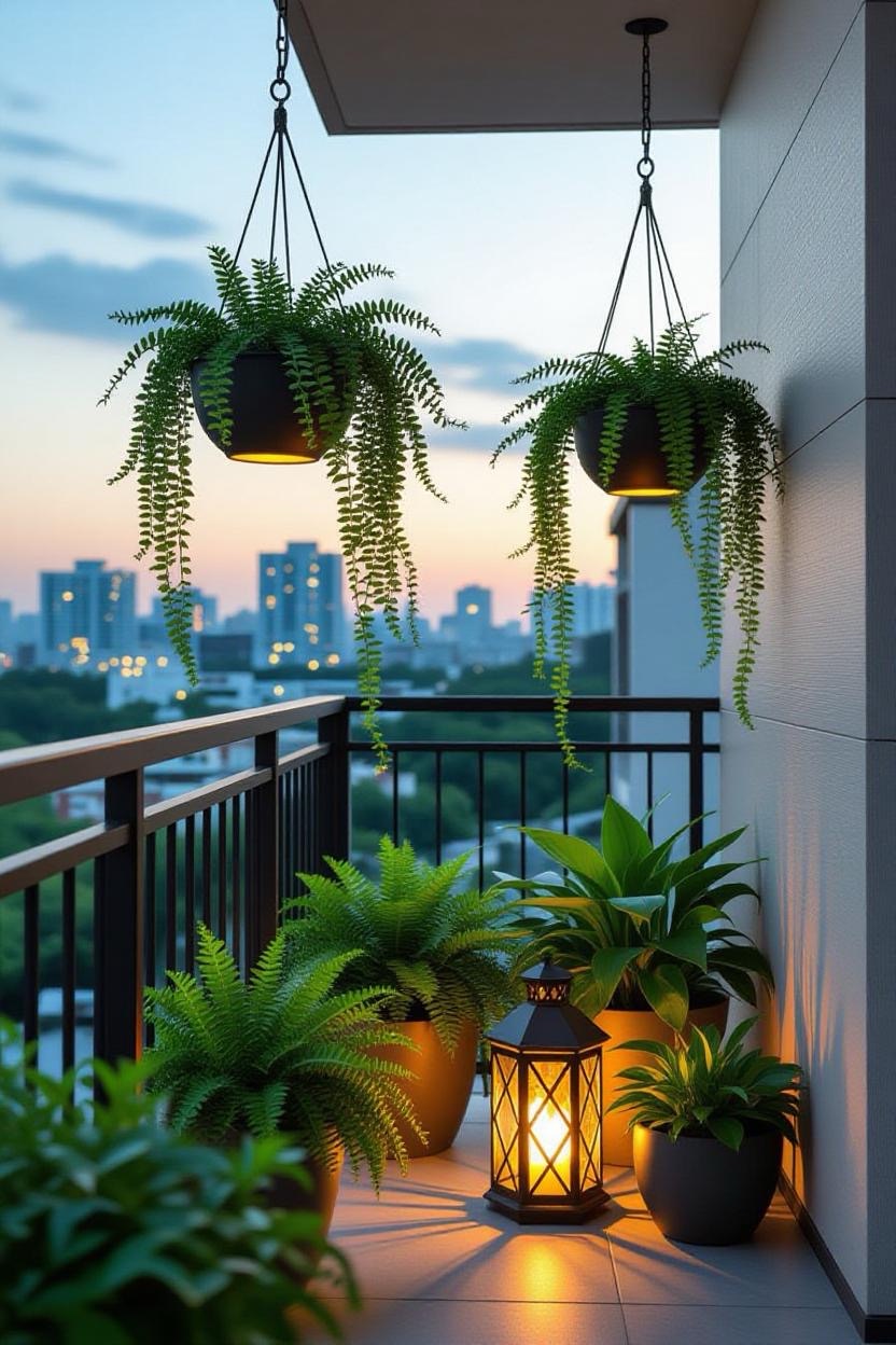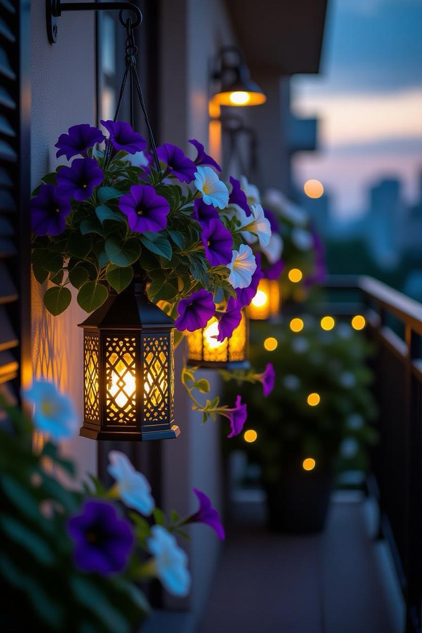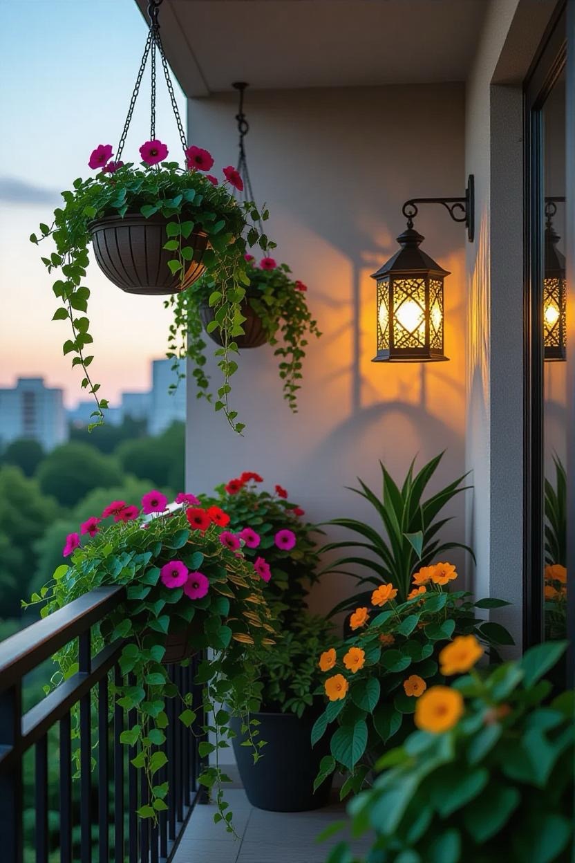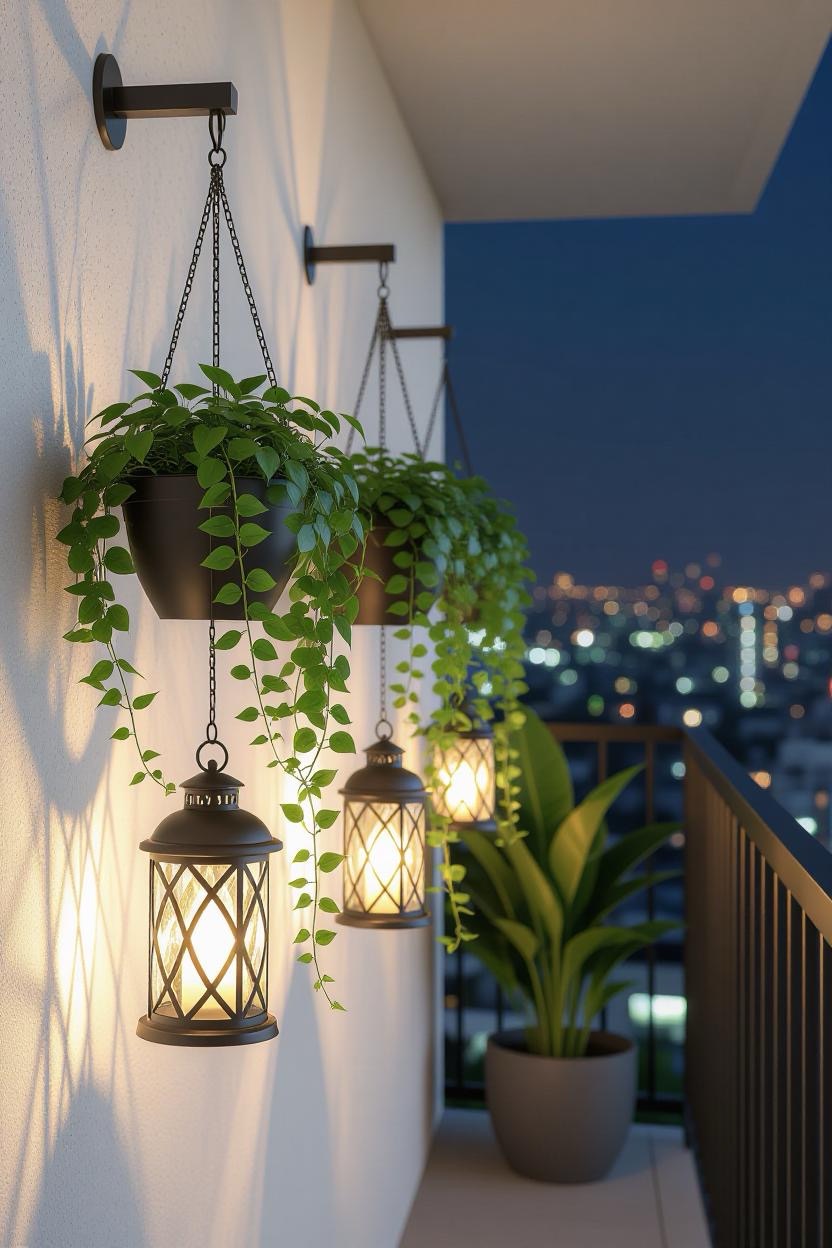 Choose decorative lantern-shaped pots and fill them with trailing greenery. This creates a chic, modern vibe while blending lighting and plants for a cozy nighttime balcony atmosphere.