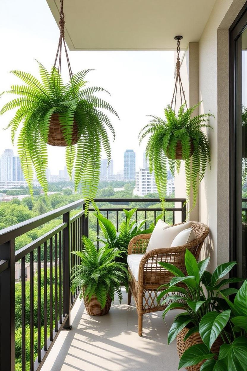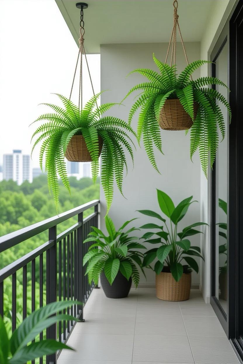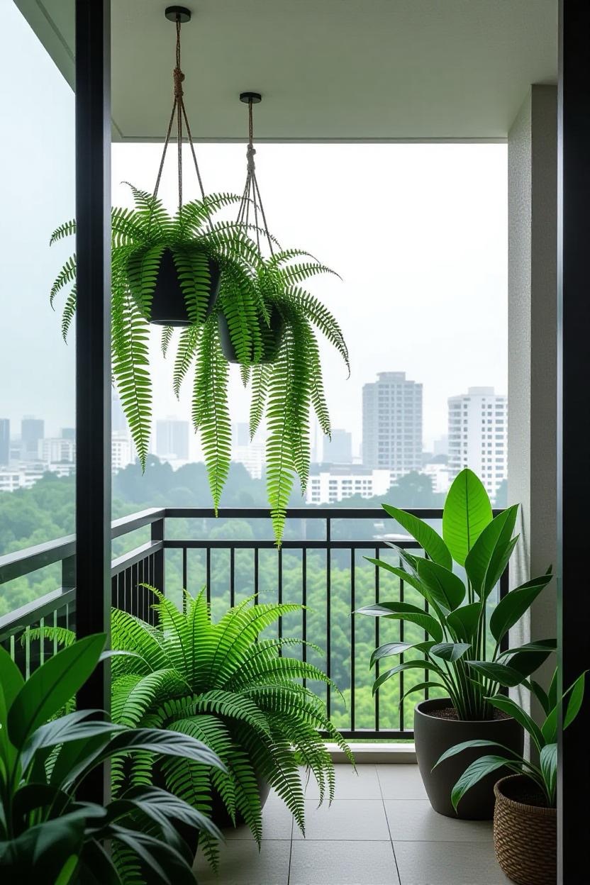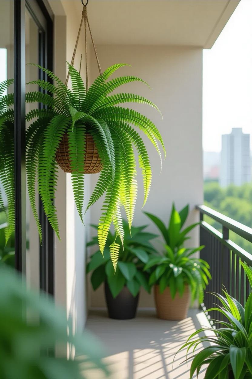 Ferns add lush volume and a tropical vibe that feels cozy and inviting. Place them in hanging baskets and let their delicate fronds spill gracefully down. They love humidity, so they’re a great choice if you want your balcony to feel like a private jungle retreat.