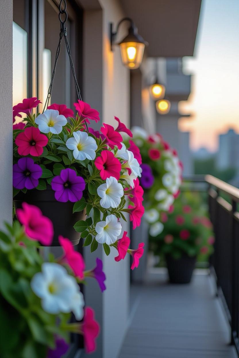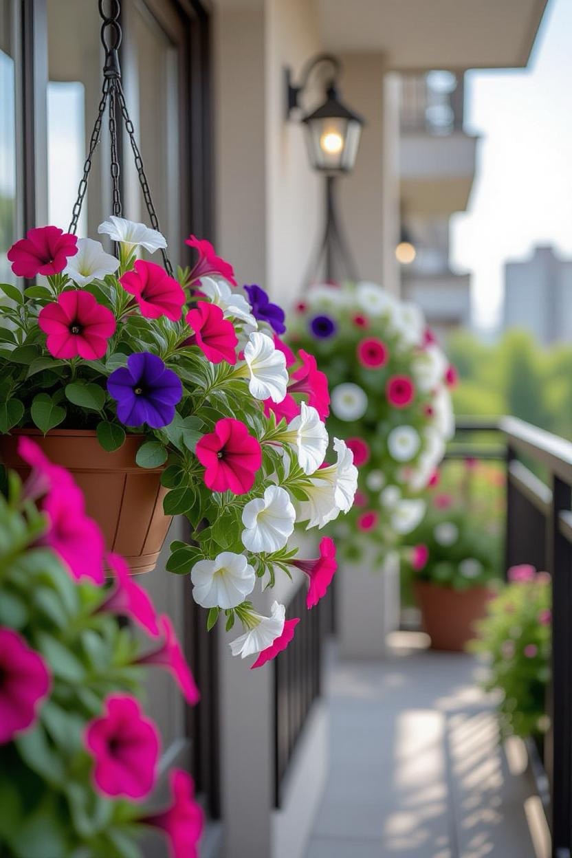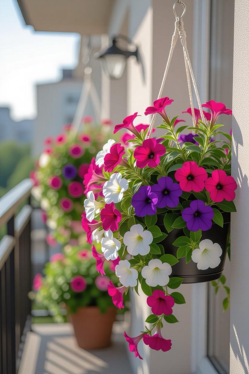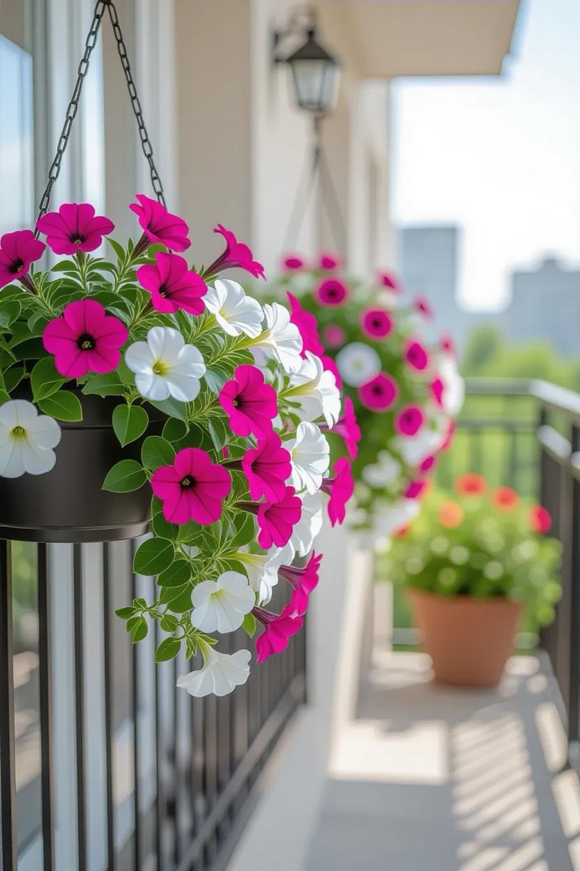 Add bursts of color with petunias in vibrant shades of pink, purple, and white. Their full blooms cascade beautifully from hanging pots, bringing a cheerful, romantic charm to any urban balcony.