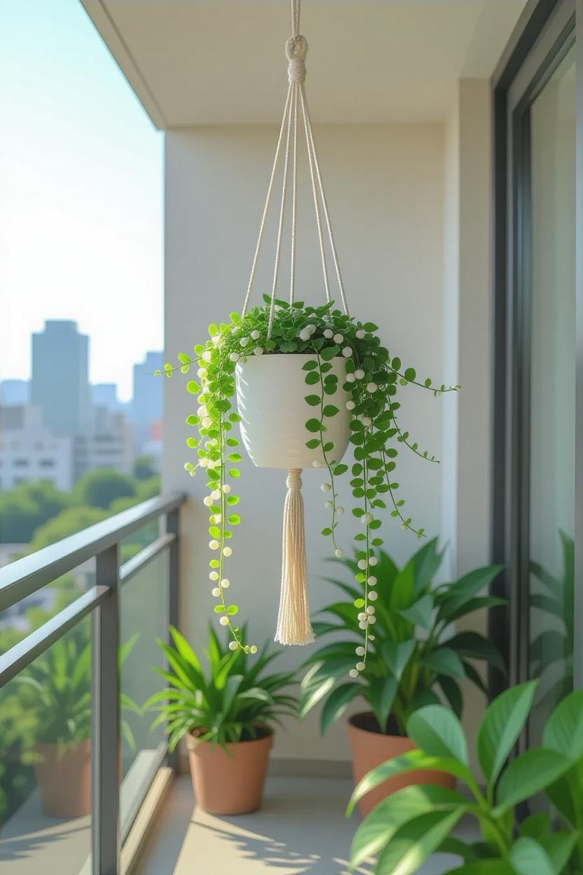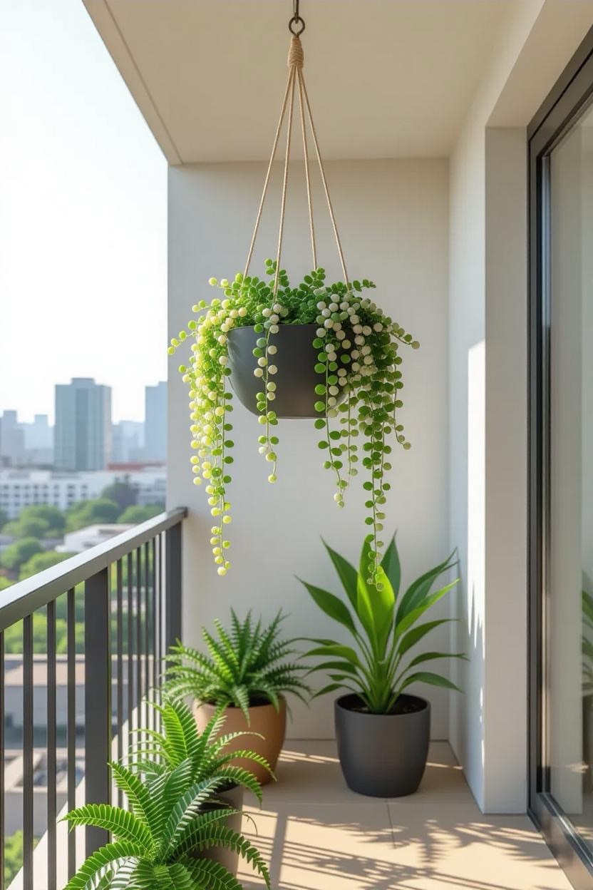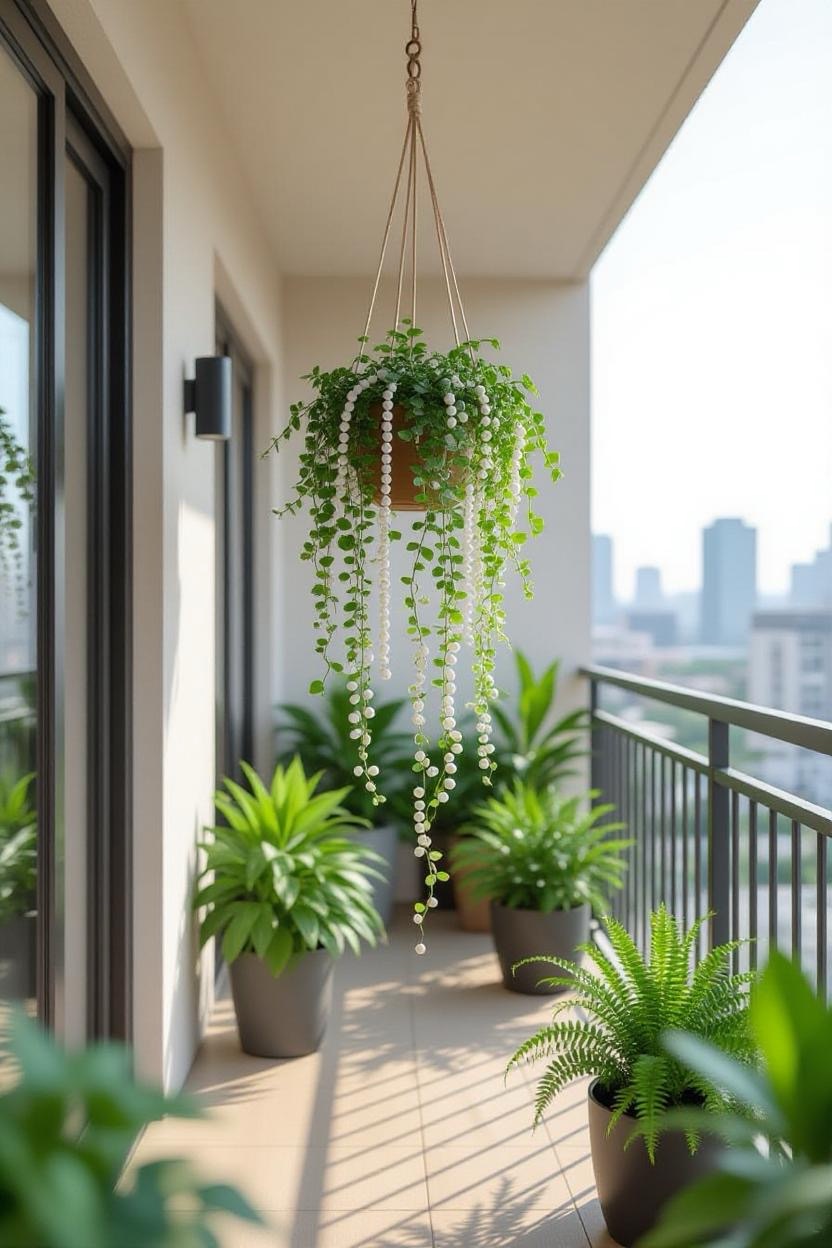 For a modern and stylish touch, the string of pearls is unmatched. Its unique bead-like leaves create a striking visual effect, especially when hung at different heights. This plant thrives in bright indirect light, making it ideal for contemporary city balconies.