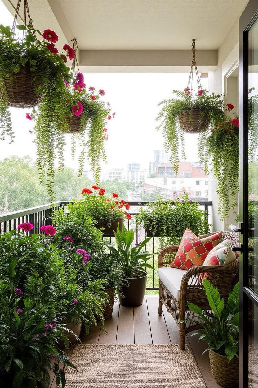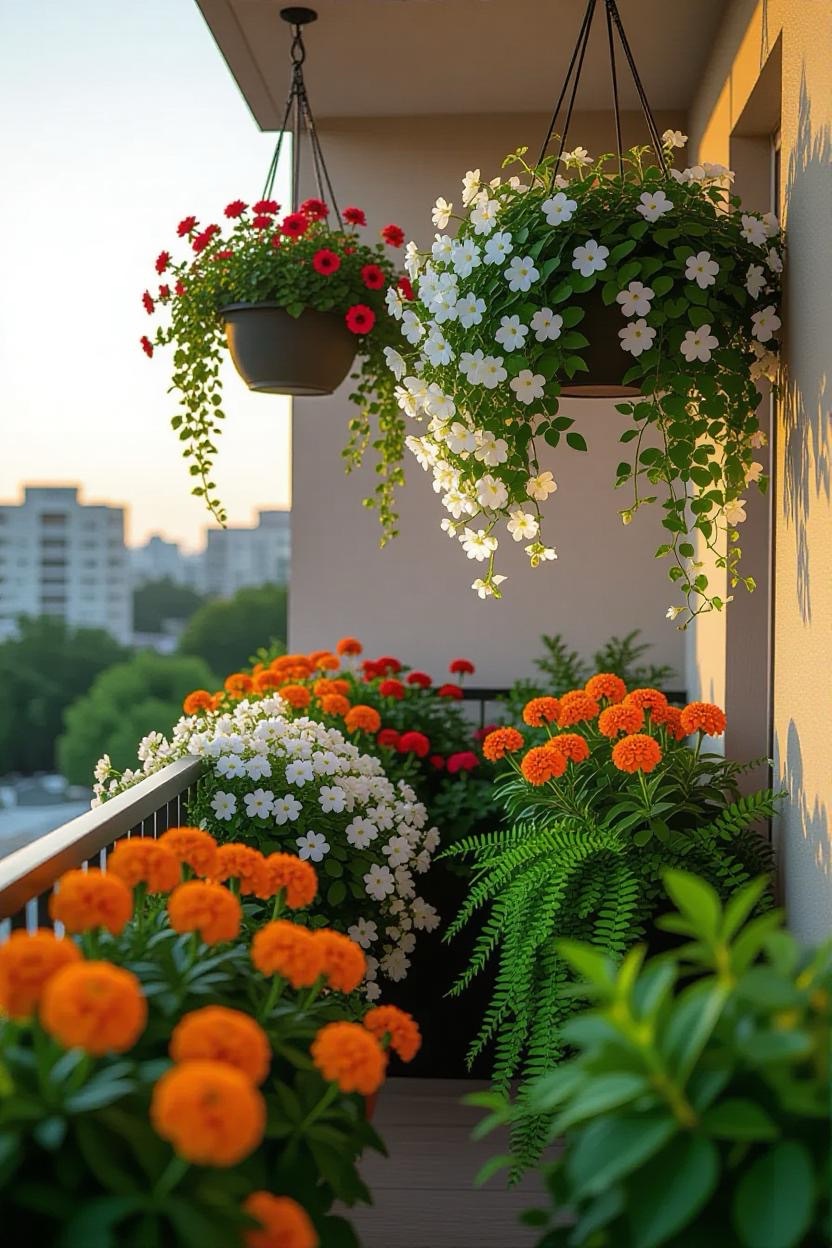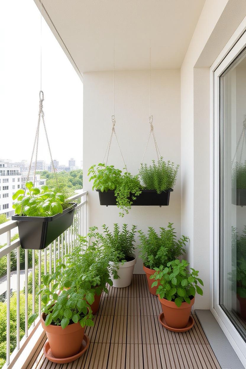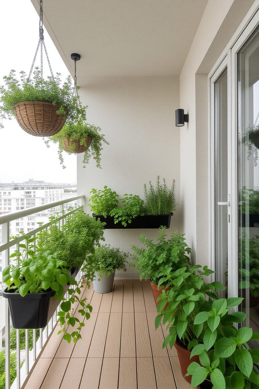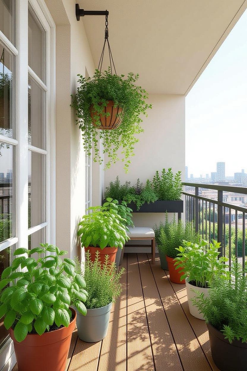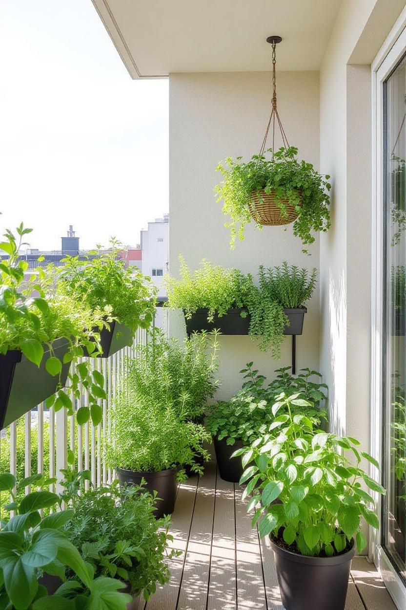Why not make your balcony both beautiful and functional? Hanging baskets of herbs like basil, rosemary, and mint not only look charming but also fill the air with refreshing scents while being useful for cooking.