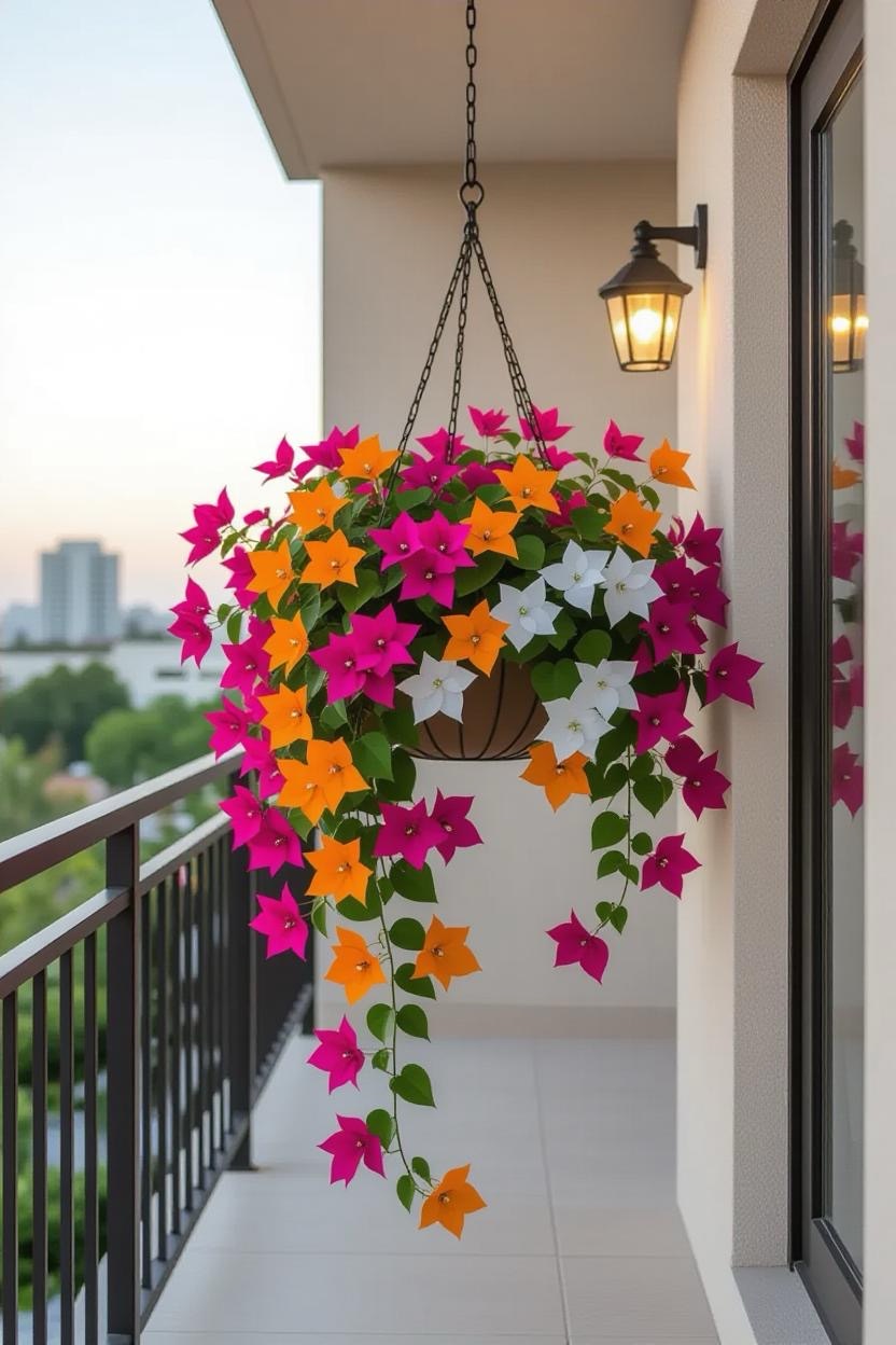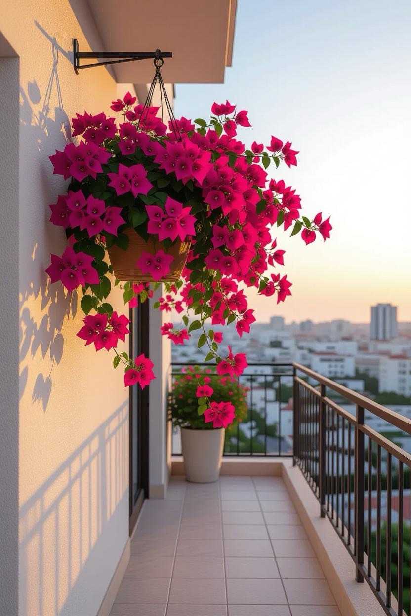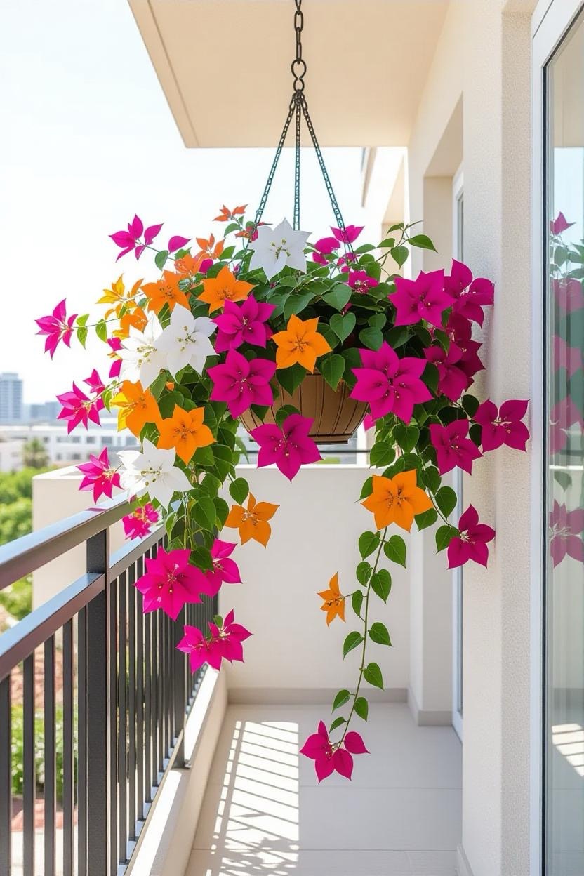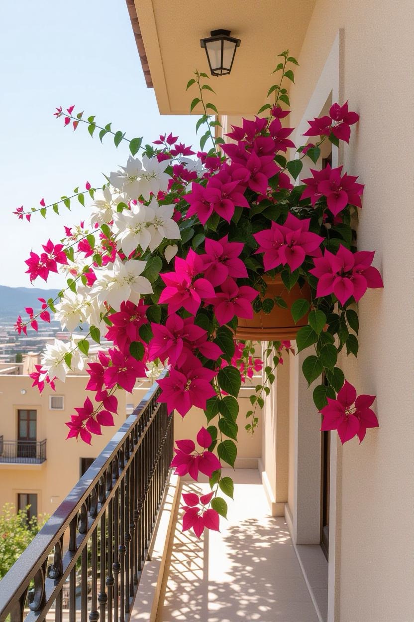 If you want bold, vibrant color, bougainvillea is your go-to. Their cascading magenta, orange, or white blooms make balconies stand out and instantly add a Mediterranean vibe.