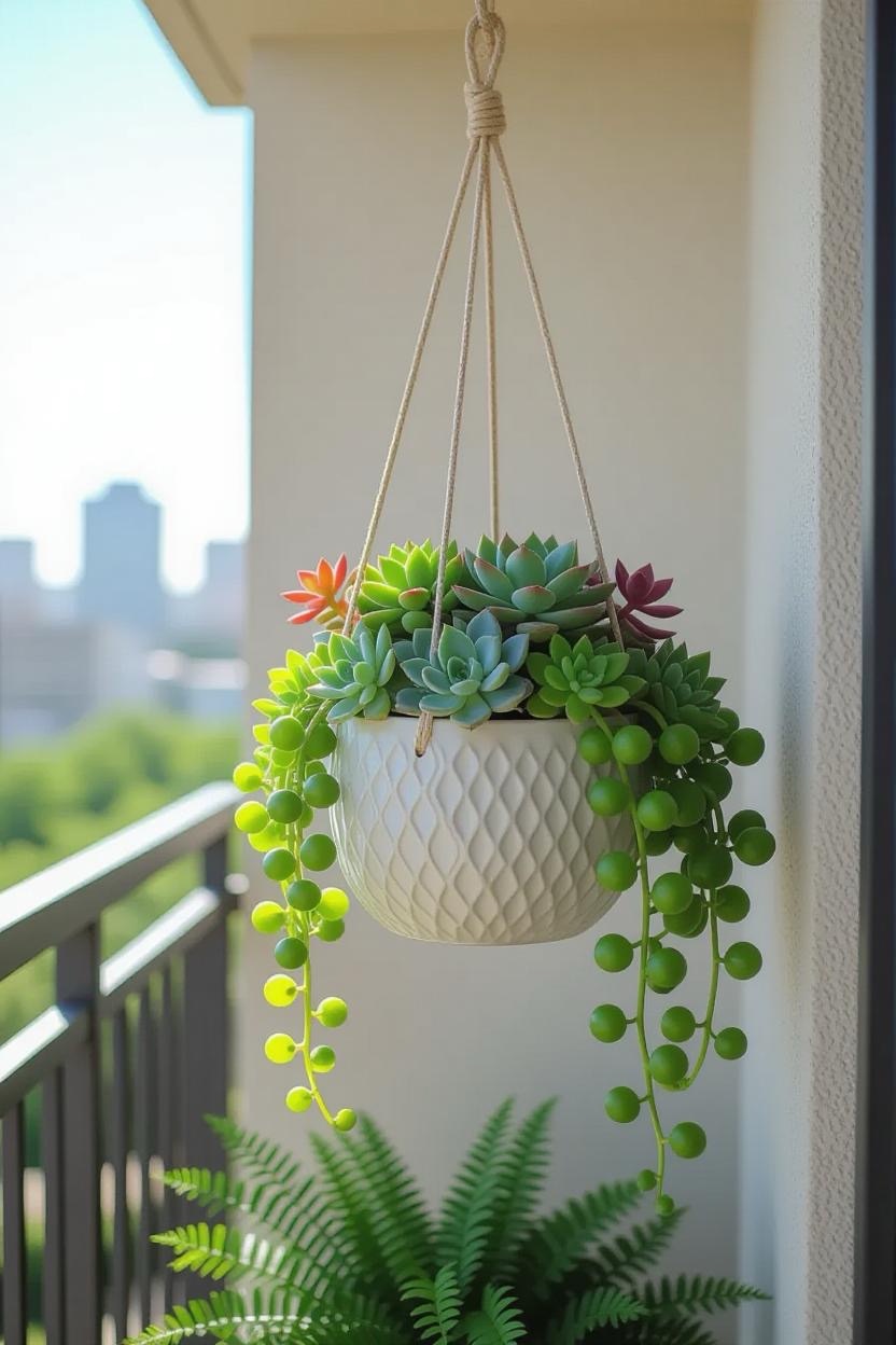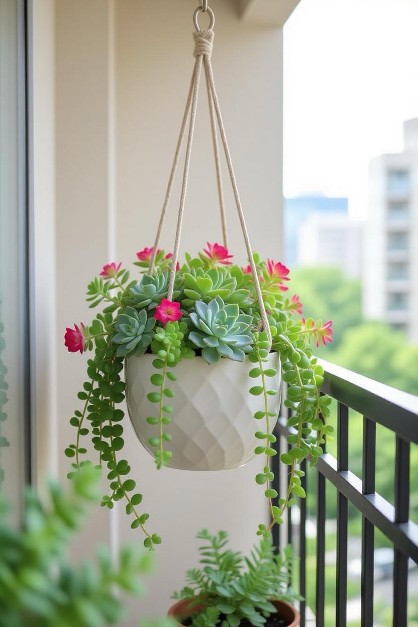 For low-maintenance beauty, hang small succulent arrangements in unique pots. Their sculptural forms add a modern edge, and they require very little care, perfect for busy city lifestyles.