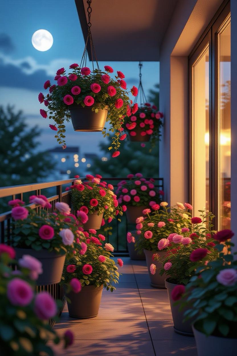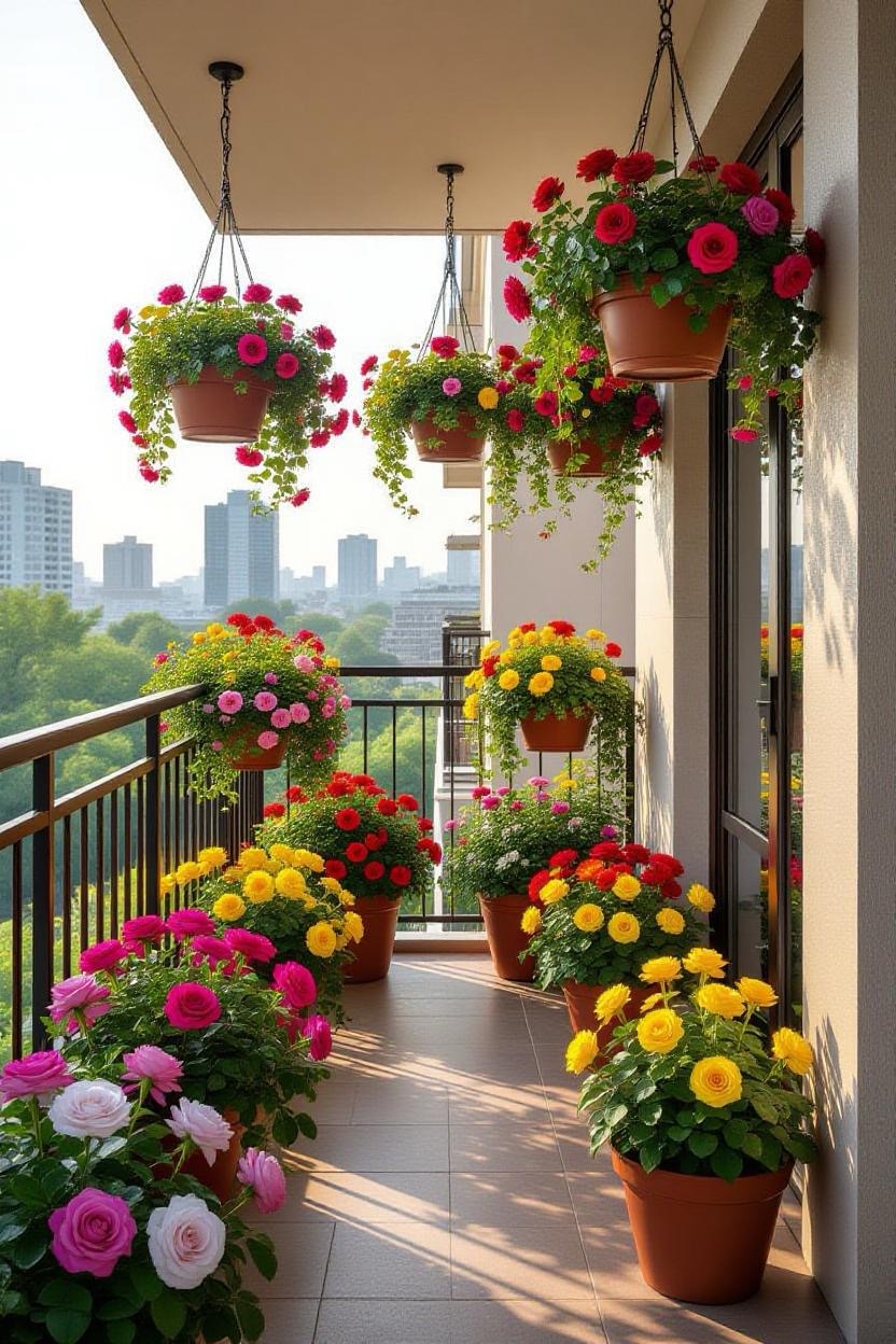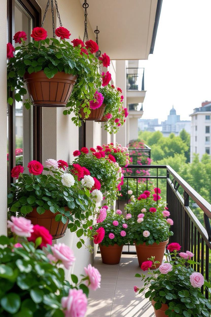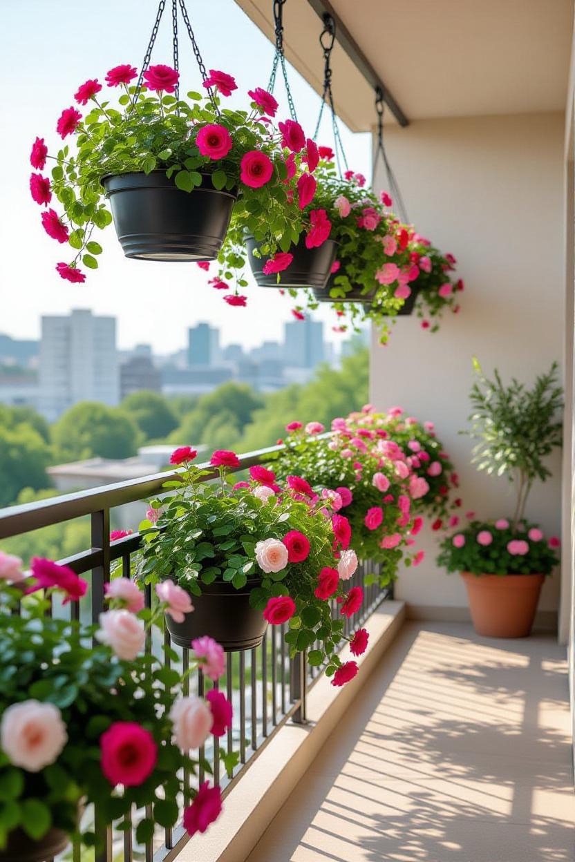 Miniature rose plants can thrive in hanging containers, creating a dreamy balcony filled with color and fragrance. This is a perfect choice if you want your space to feel both elegant and romantic.