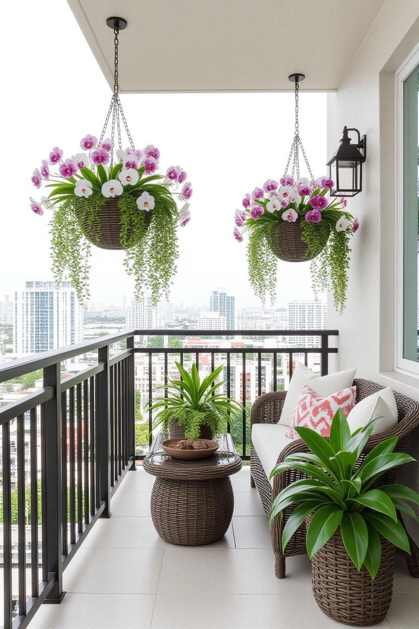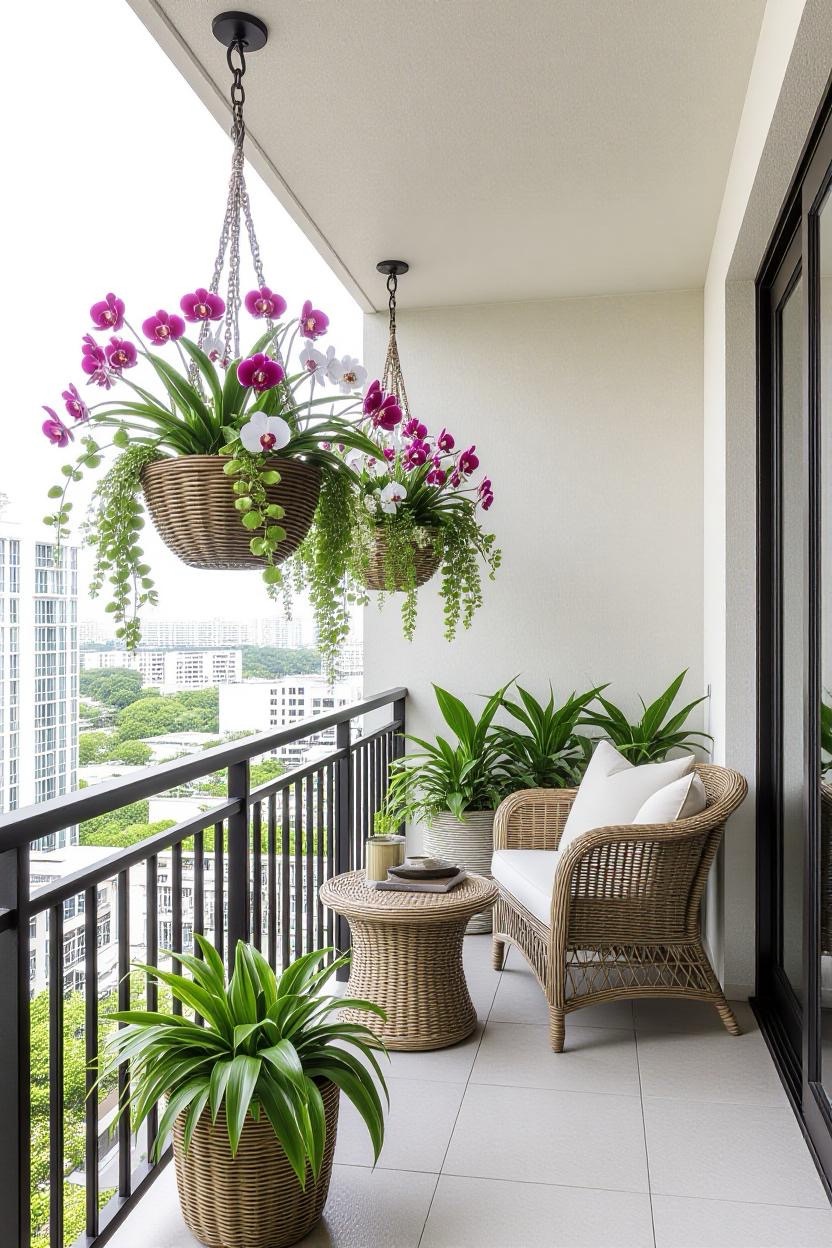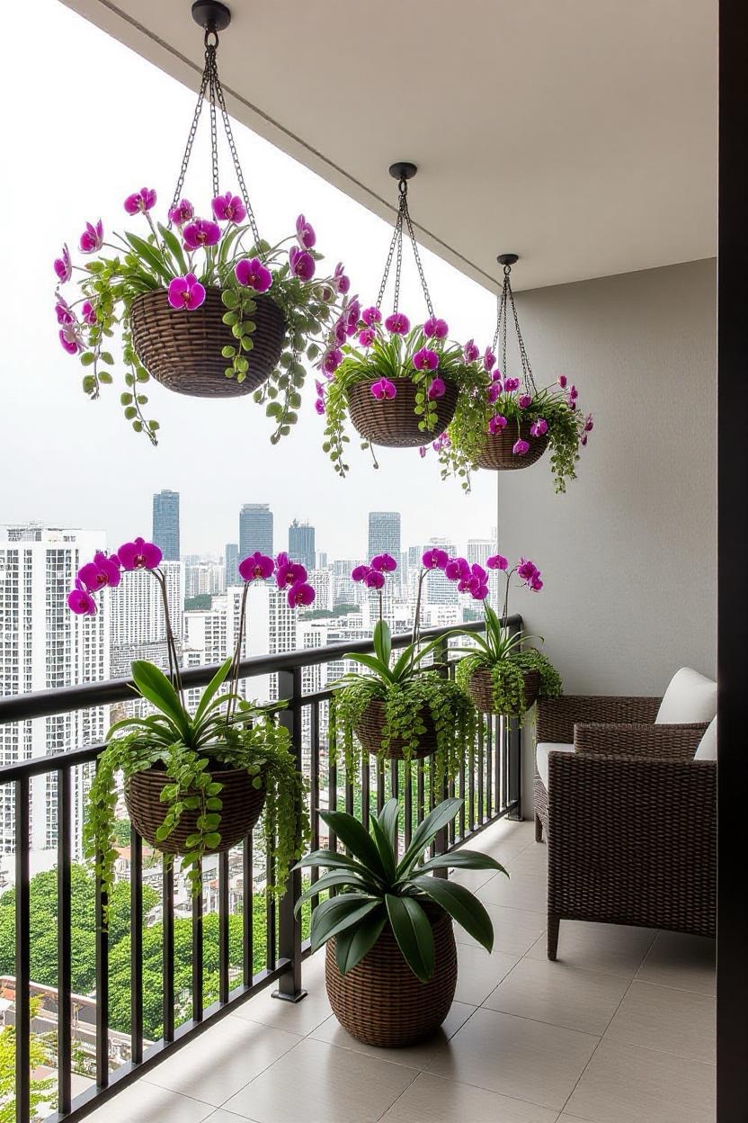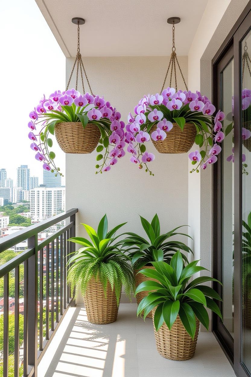For a touch of sophistication, hang orchids in decorative baskets. Their exotic blooms bring a sense of luxury and refinement to your balcony, turning it into a stunning focal point.