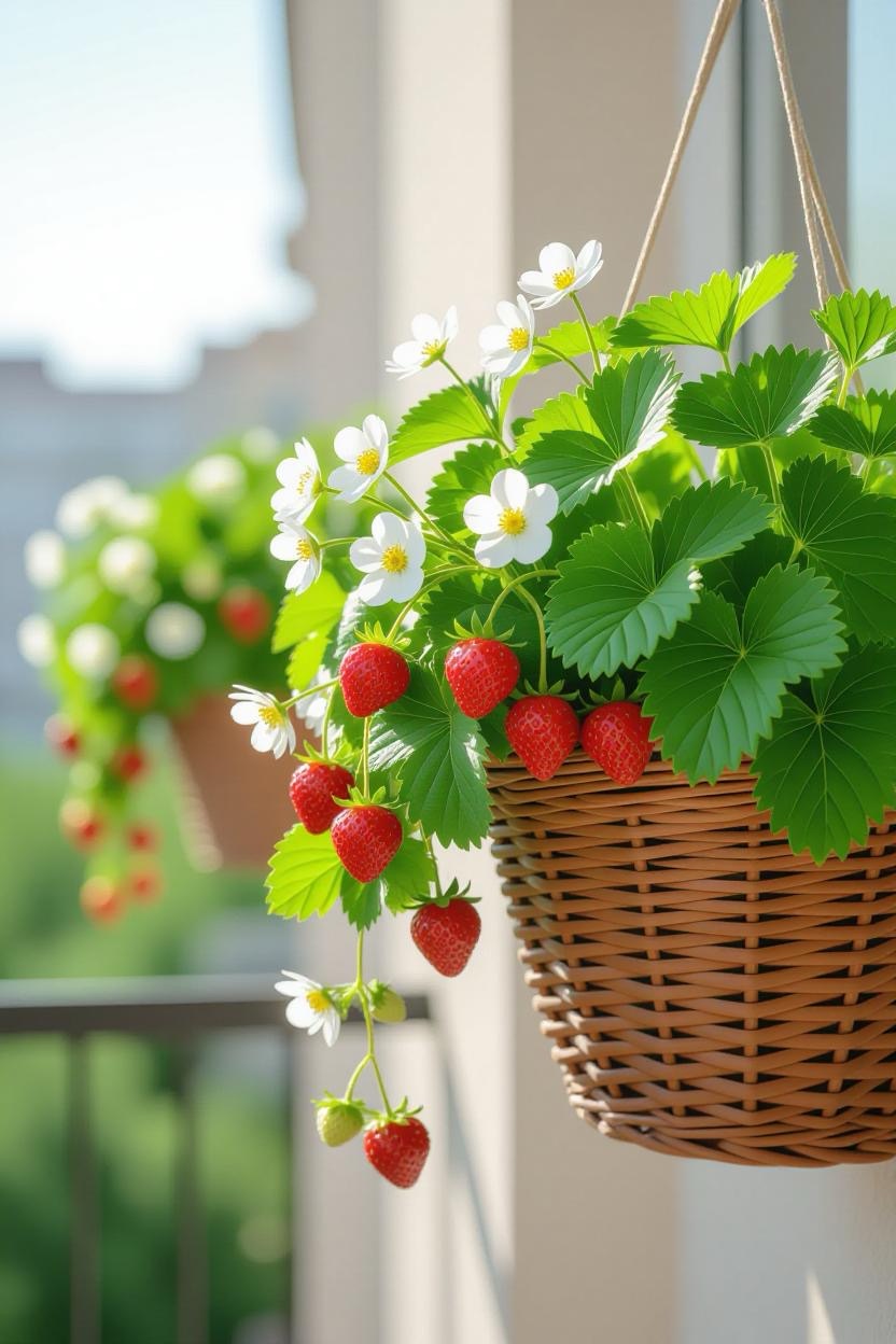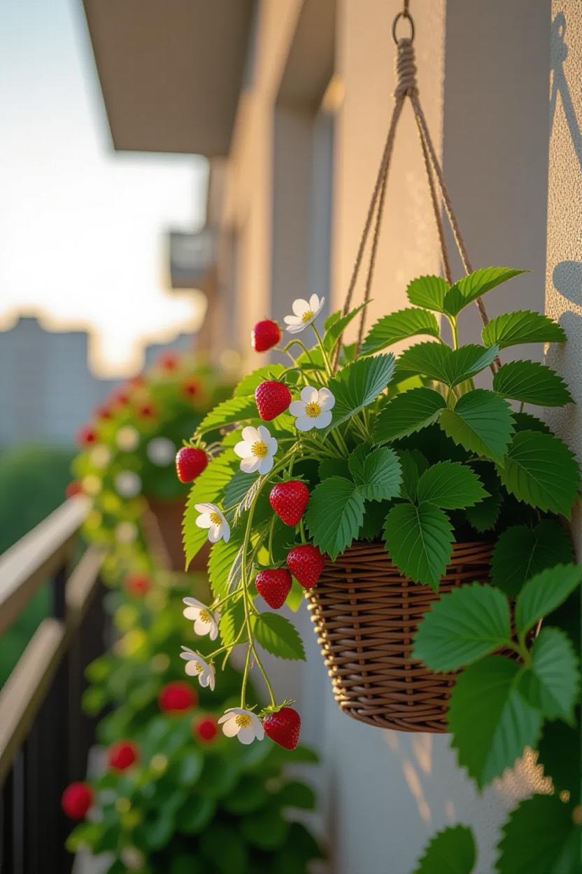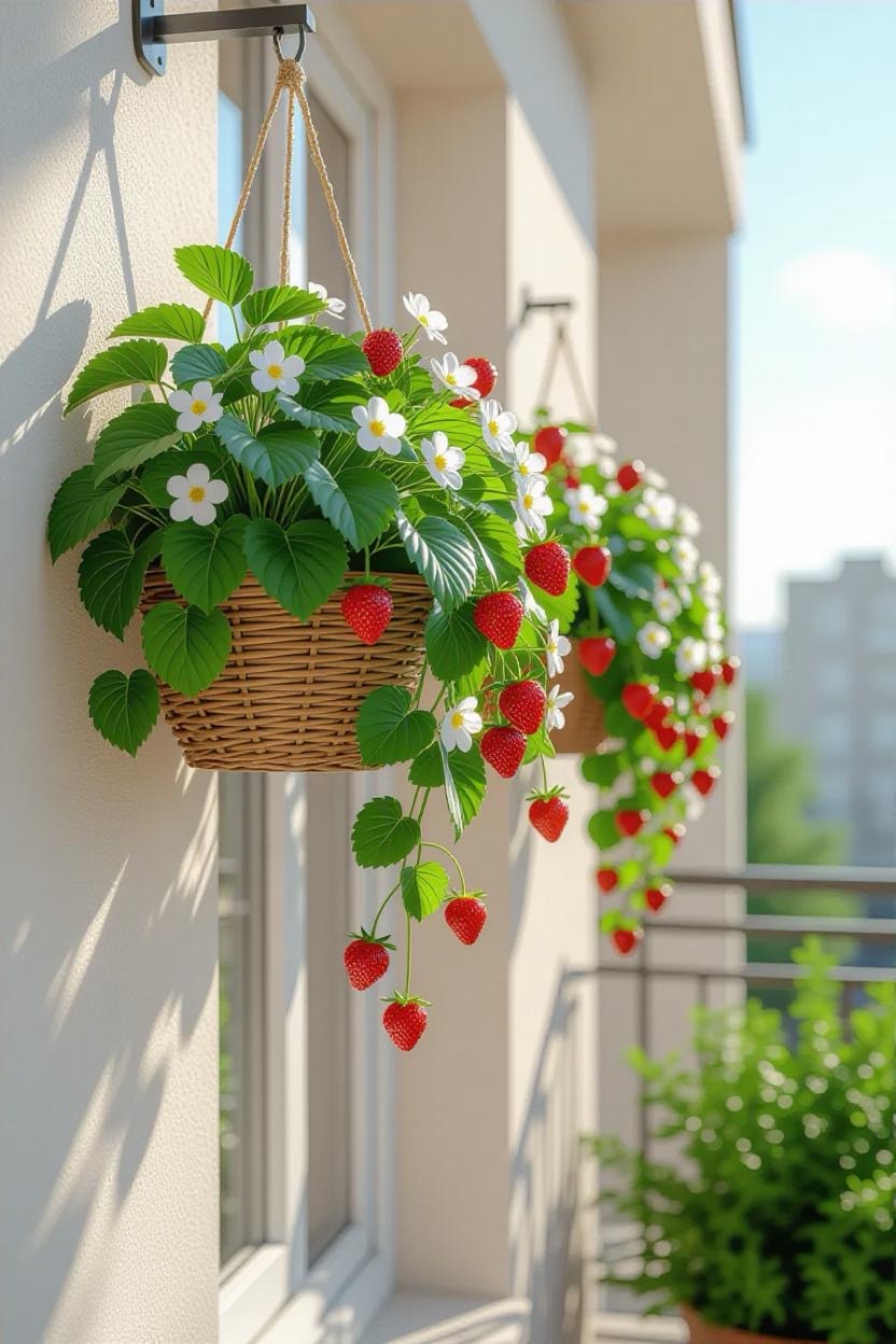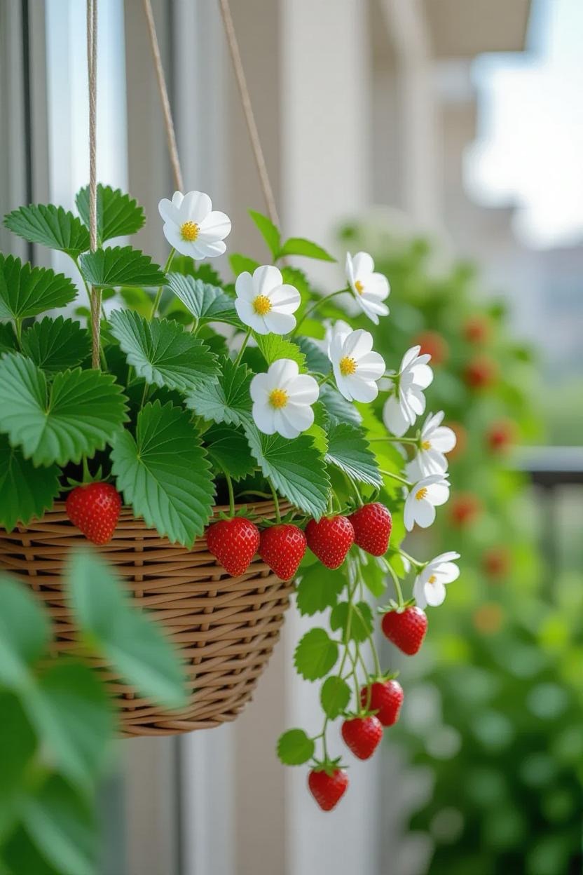 Strawberries make for a delightful choice, beautiful greenery, white blossoms, and sweet fruit all in one. Hanging strawberry baskets are practical and fun, especially in summer.