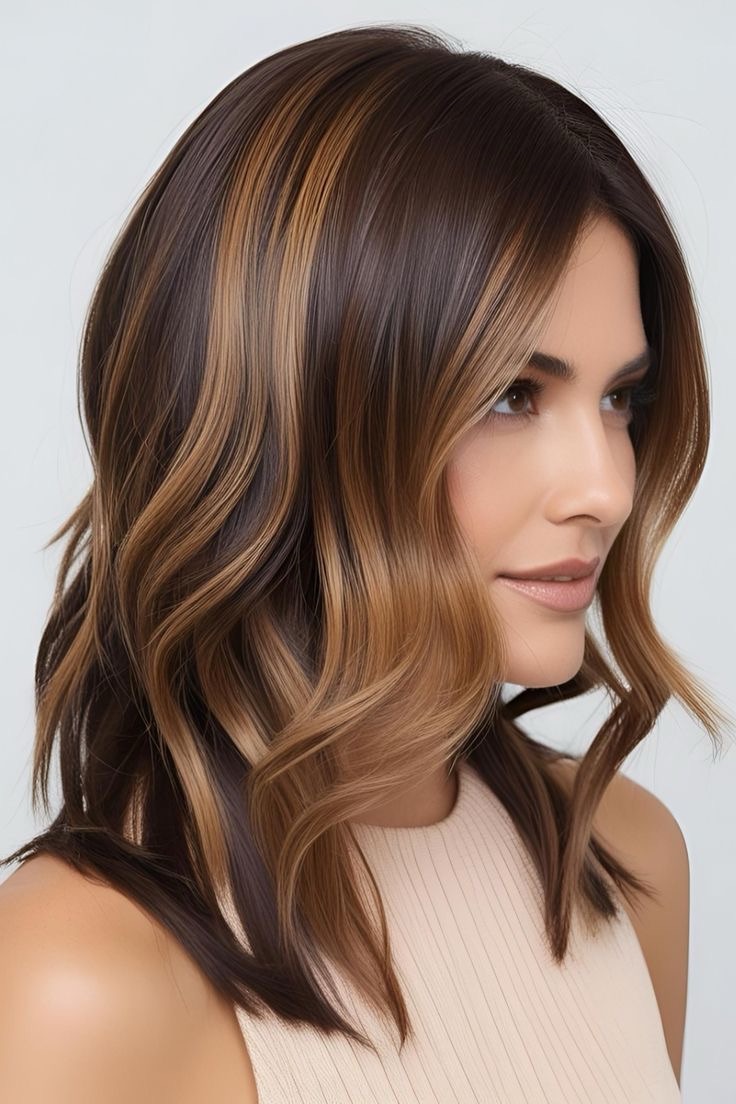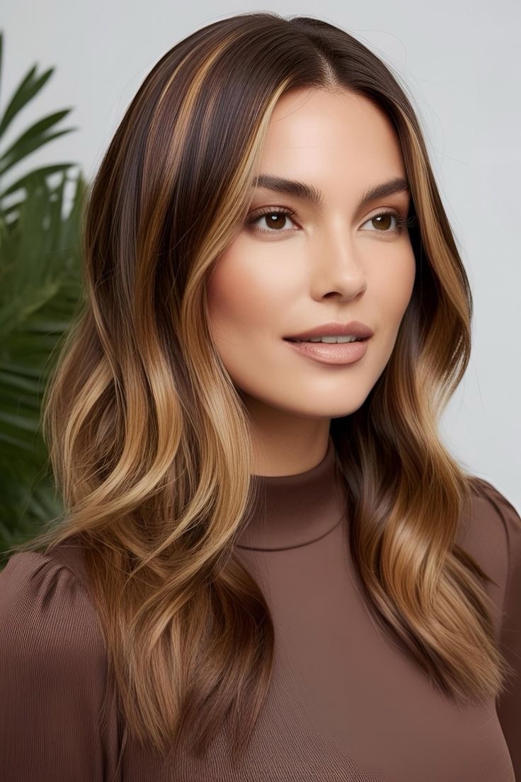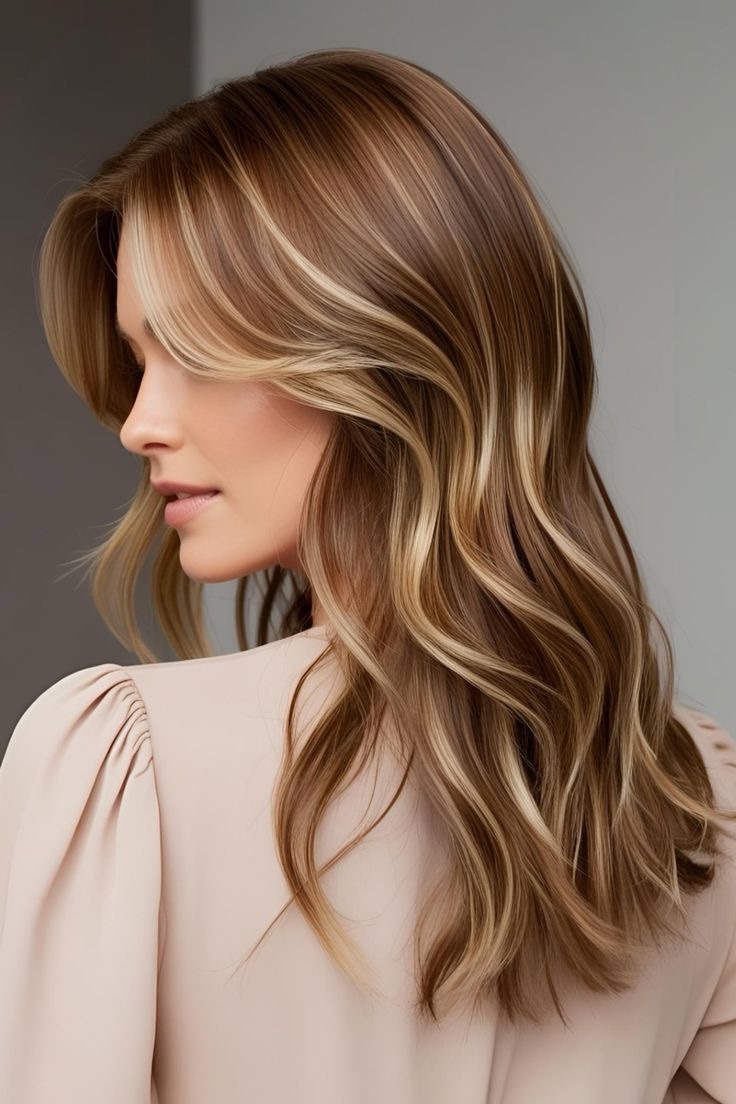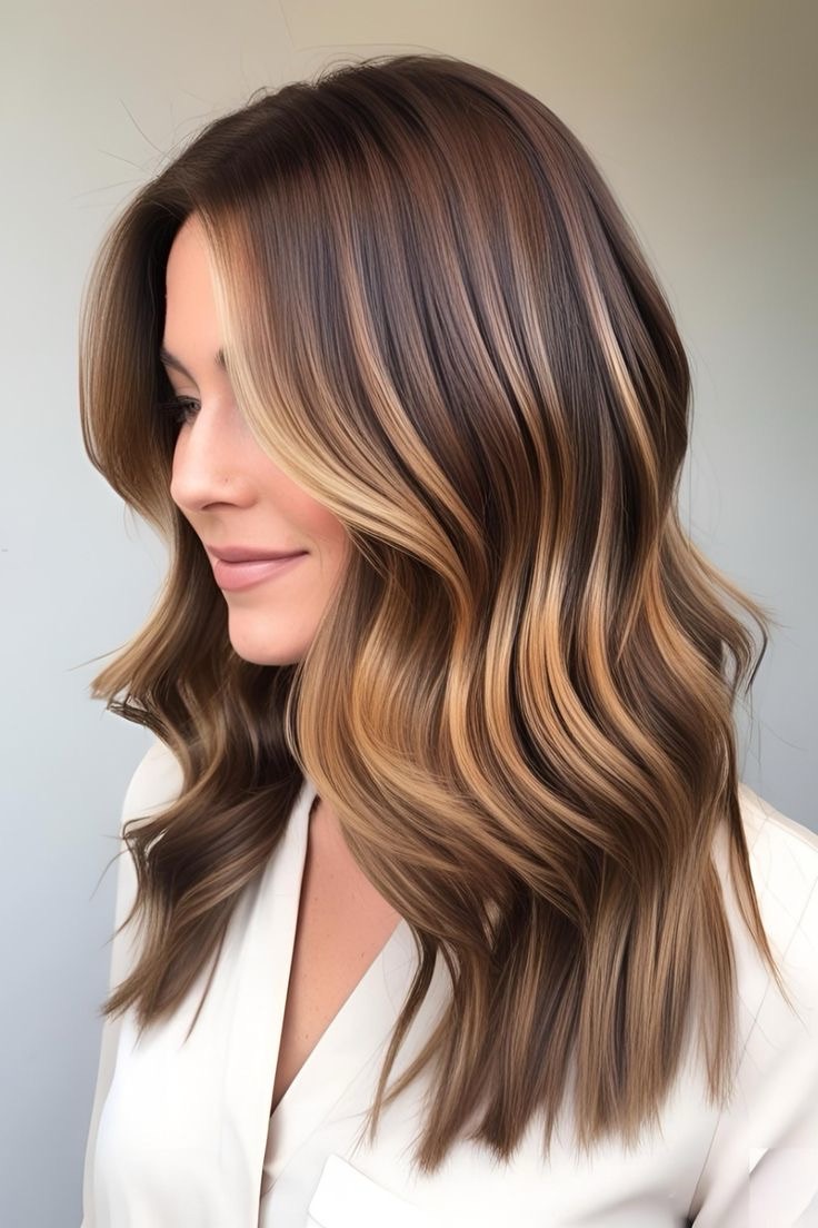 Light brown hair glows—toffee highlights accentuate wavy strands; apply golden streaks to the waves, weave in caramel lowlights, and create a textured, sunlit look with depth.