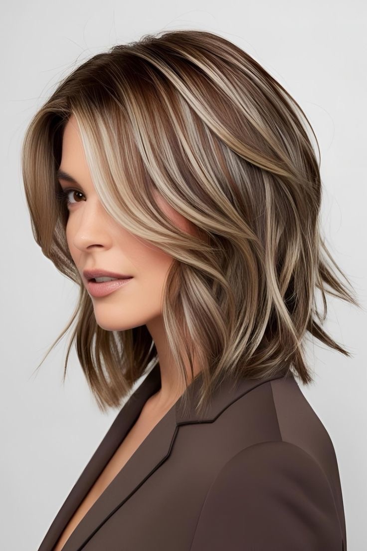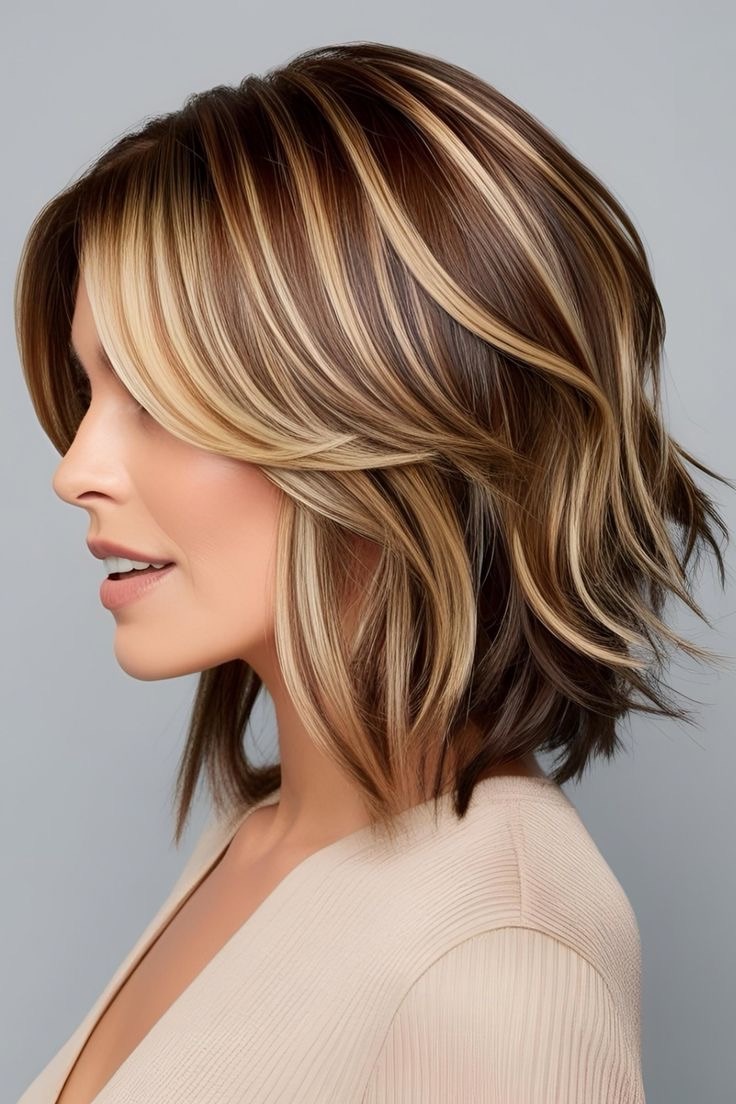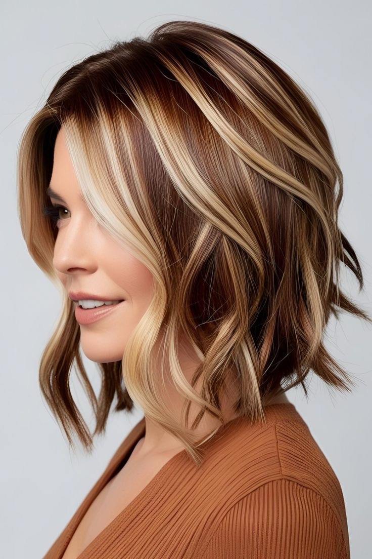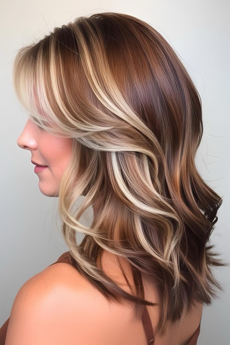 Light brown hair glows—toffee highlights accentuate wavy strands; apply golden streaks to the waves, weave in caramel lowlights, and create a textured, sunlit look with depth.
