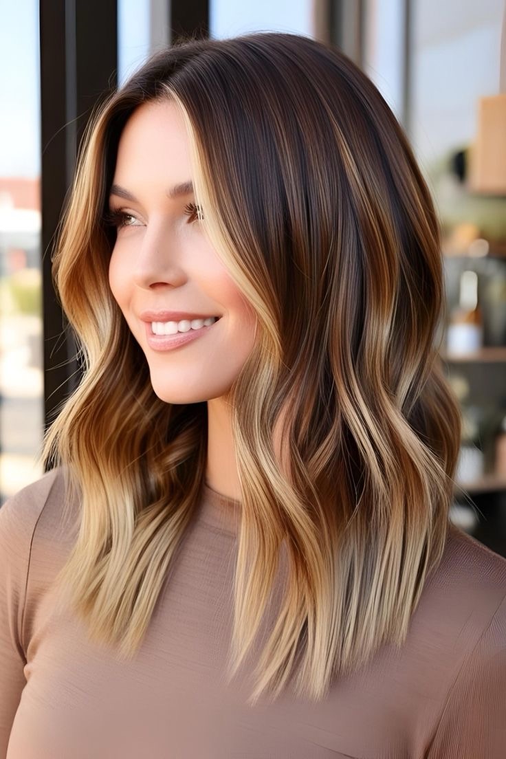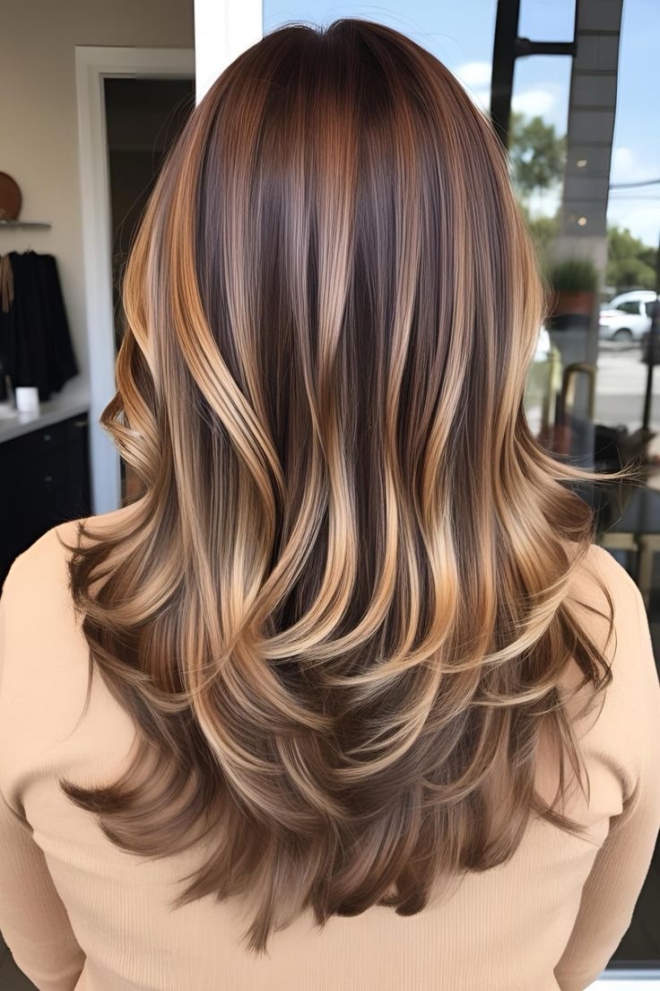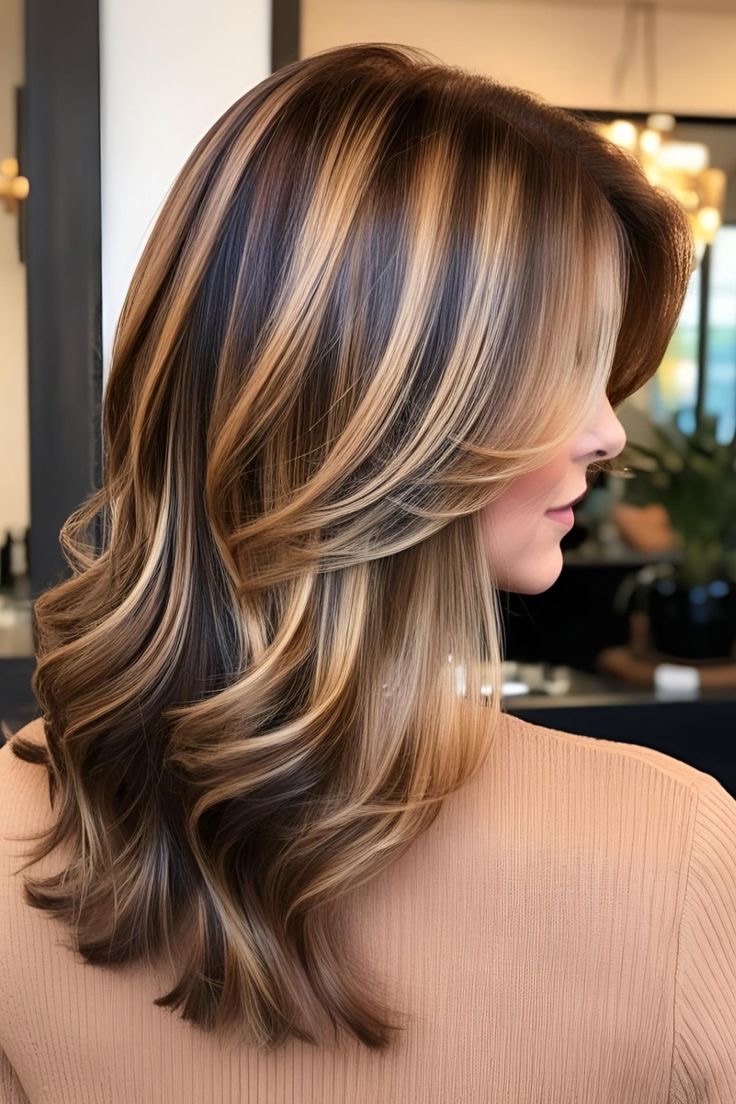 Light brown hair blooms—caramel streaks mix with mocha lowlights; alternate golden and dark tones, blend naturally, and craft a rich, dimensional style with warm undertones.