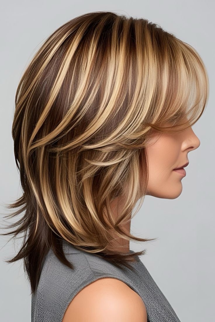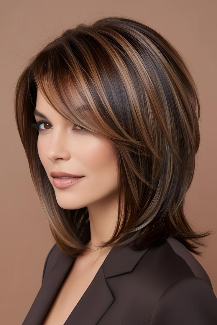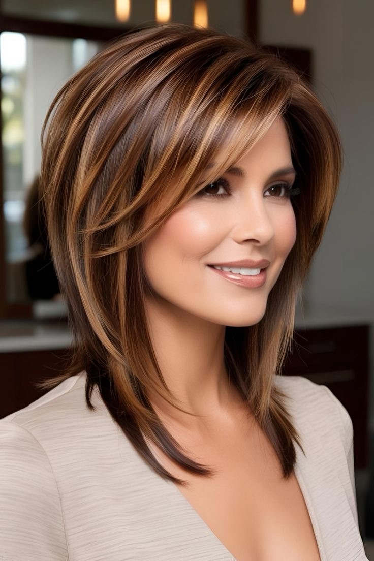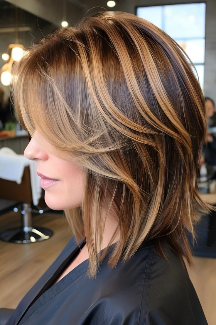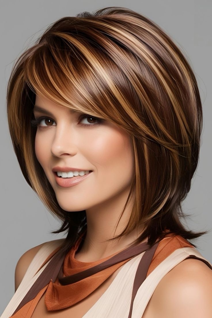 Light brown hair shines—cinnamon highlights brighten layered hair; apply warm streaks to the top layers, weave in chocolate lowlights, and create a dynamic, vibrant style.