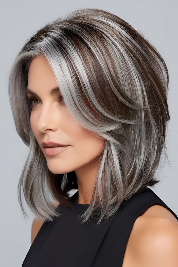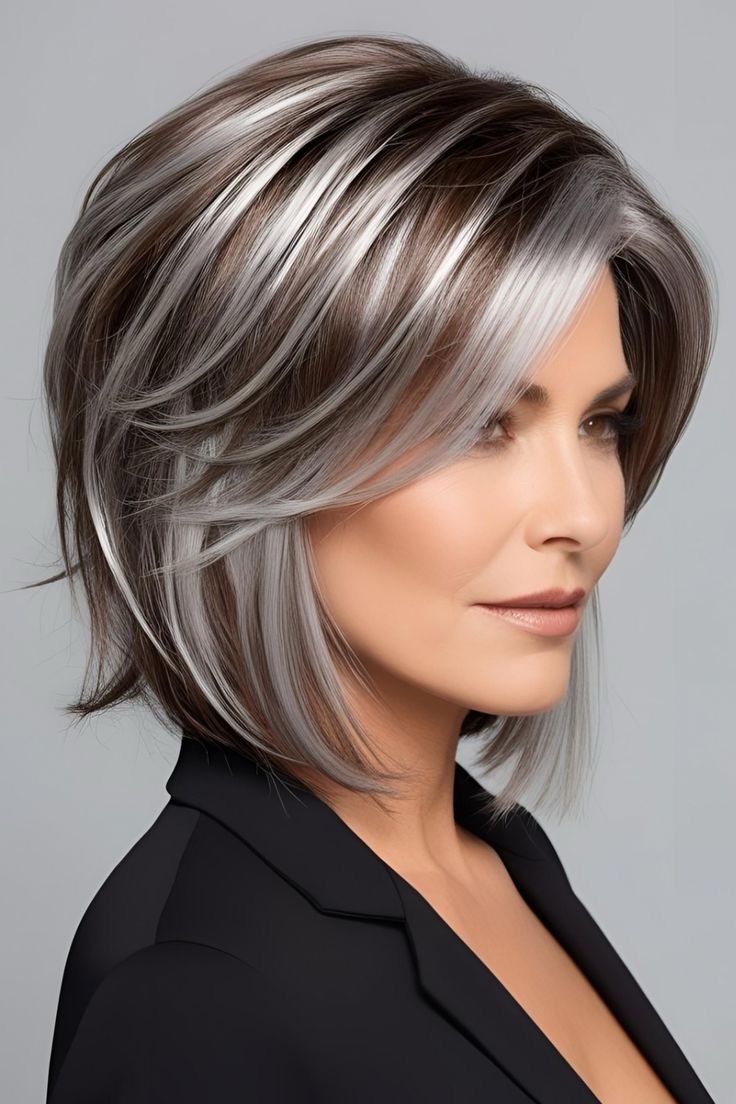 Light brown hair dazzles—platinum highlights mix with gray lowlights; alternate cool tones, focus on the ends, and craft a bold, modern look with a silvery edge.