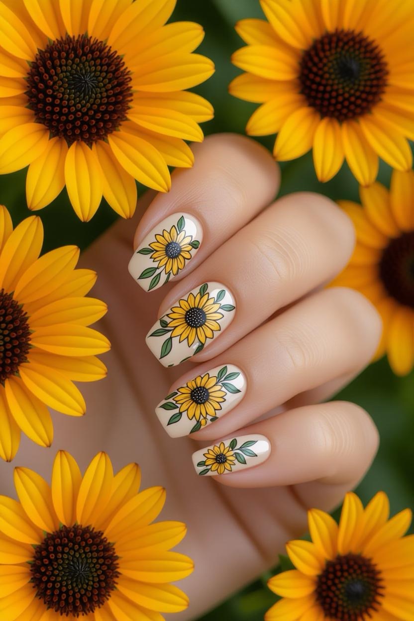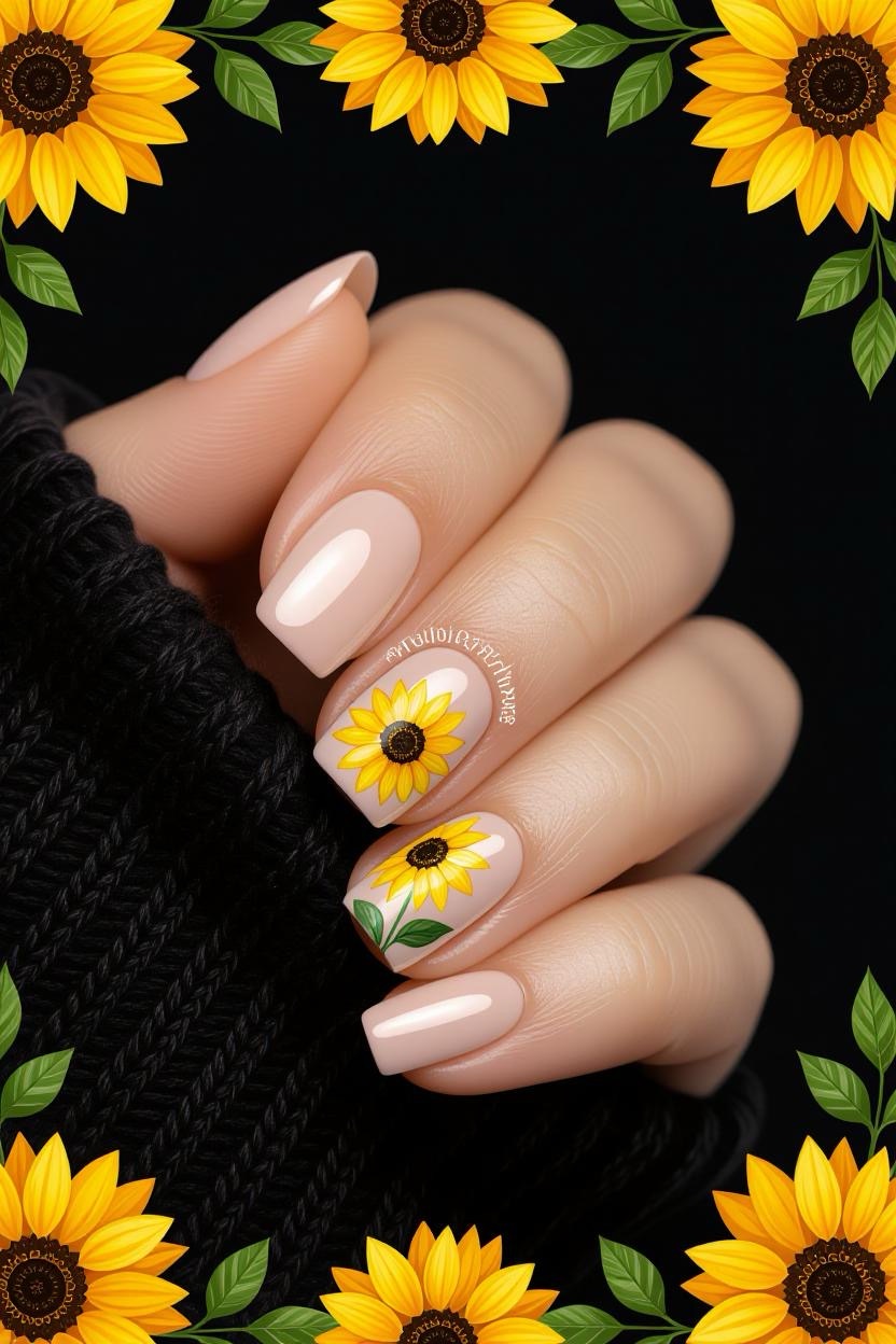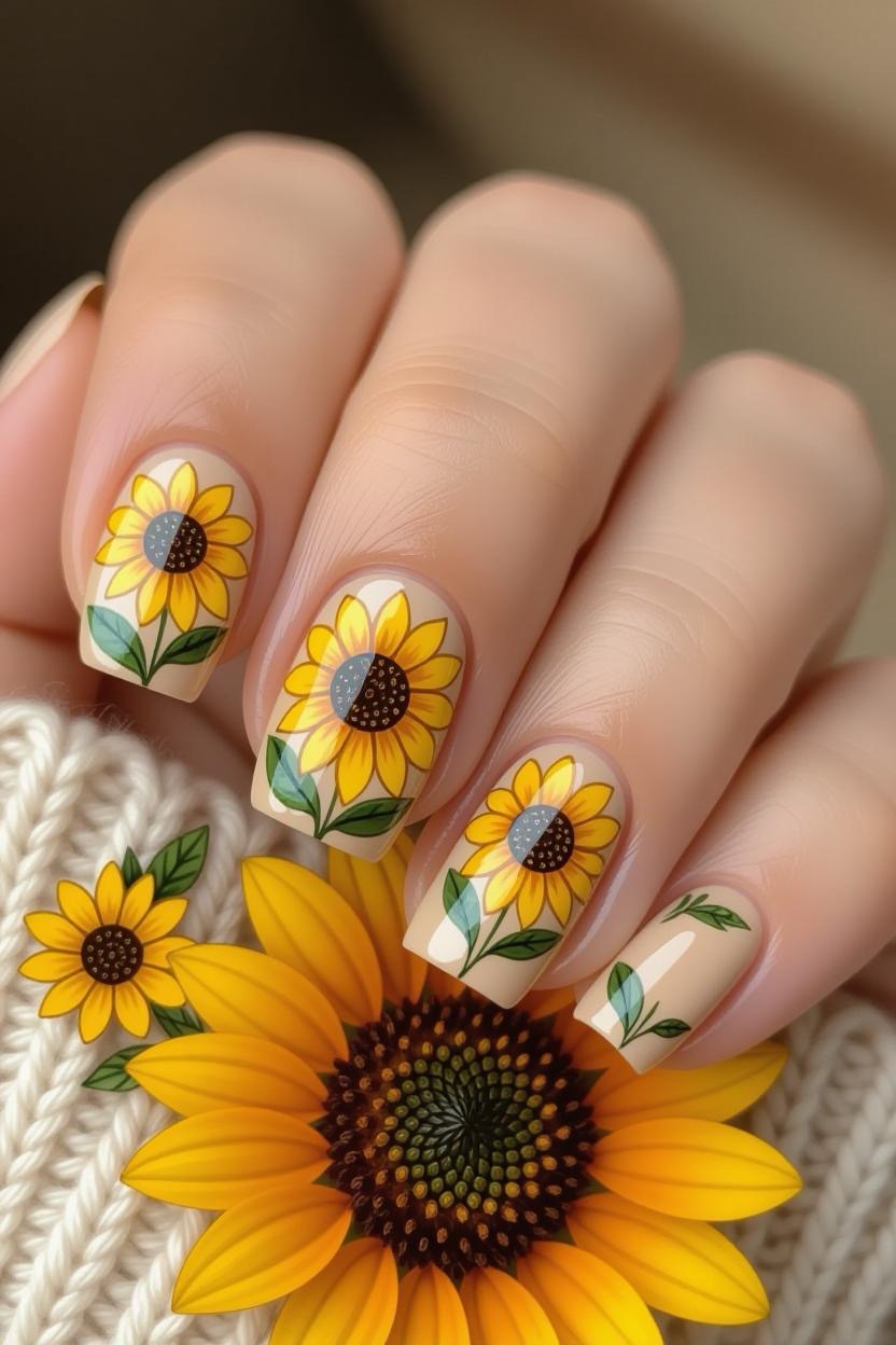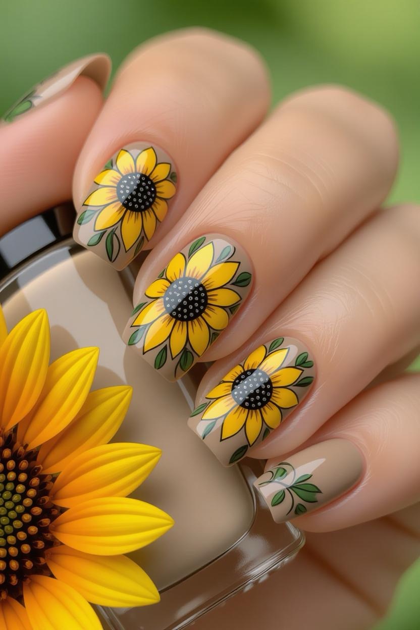 Use earthy brown or beige bases to create a rustic farmhouse-inspired nail design with charming sunflower accents.