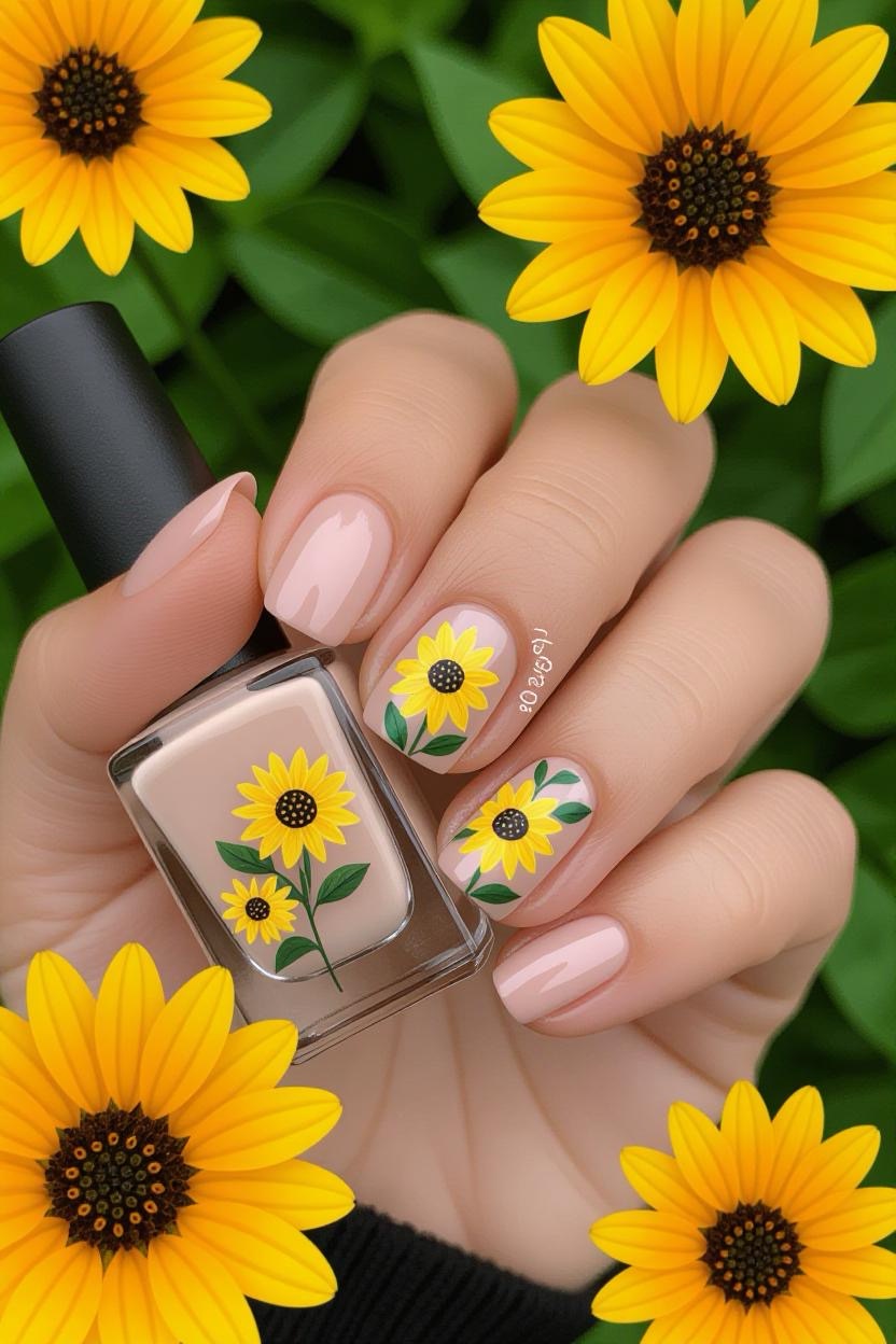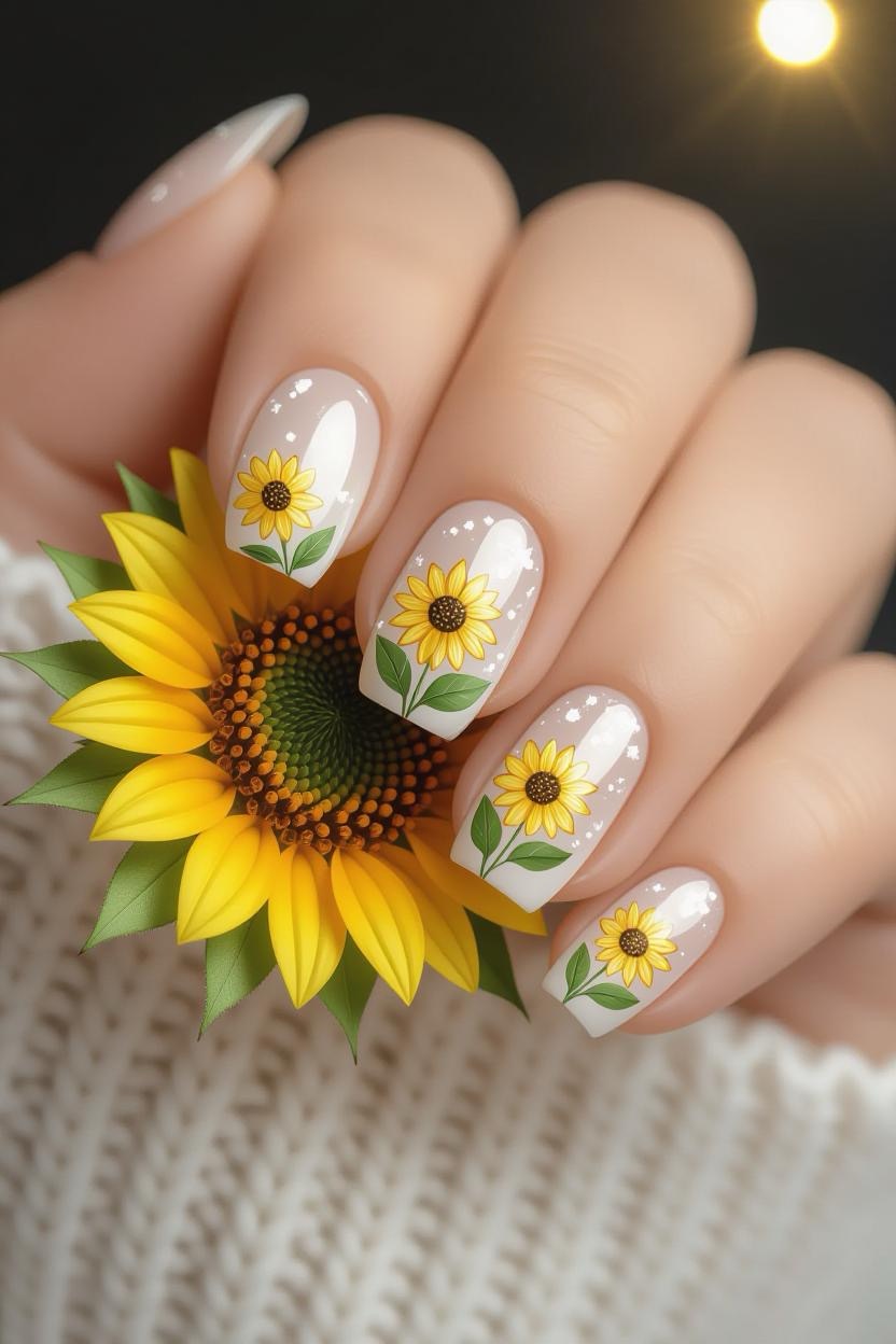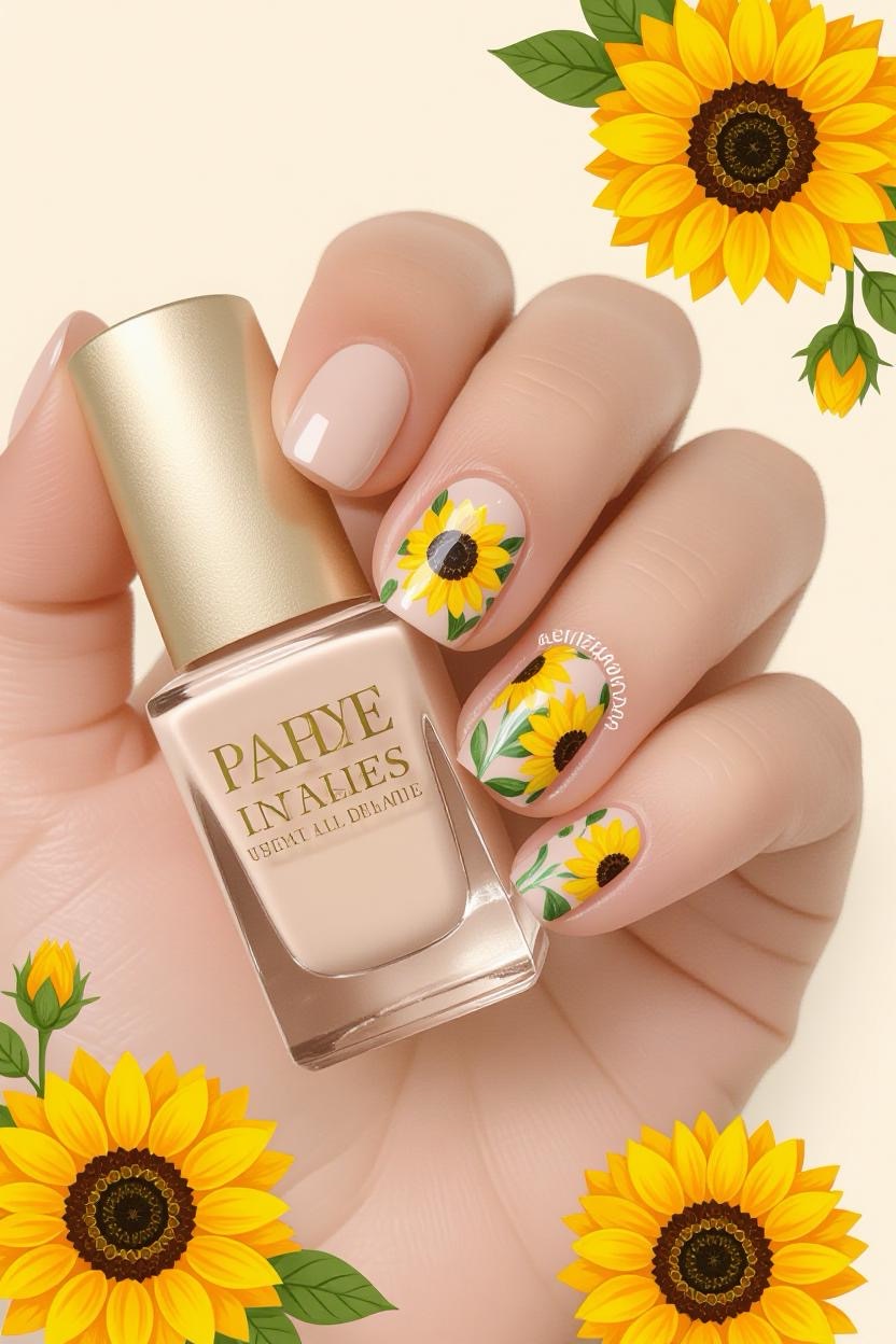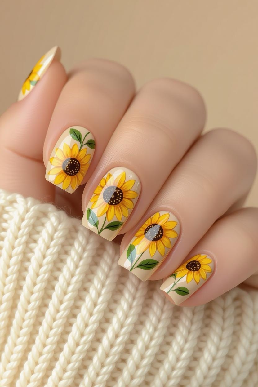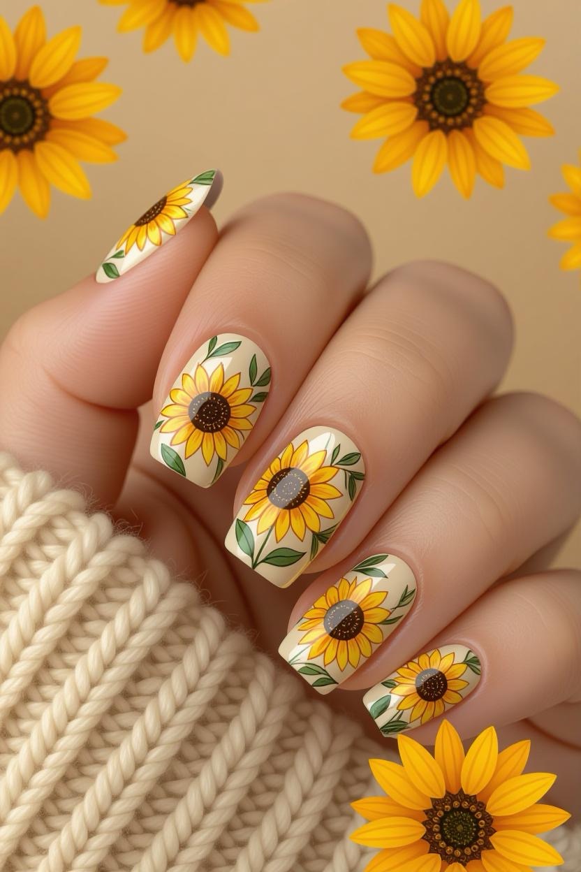 Use earthy brown or beige bases to create a rustic farmhouse-inspired nail design with charming sunflower accents.