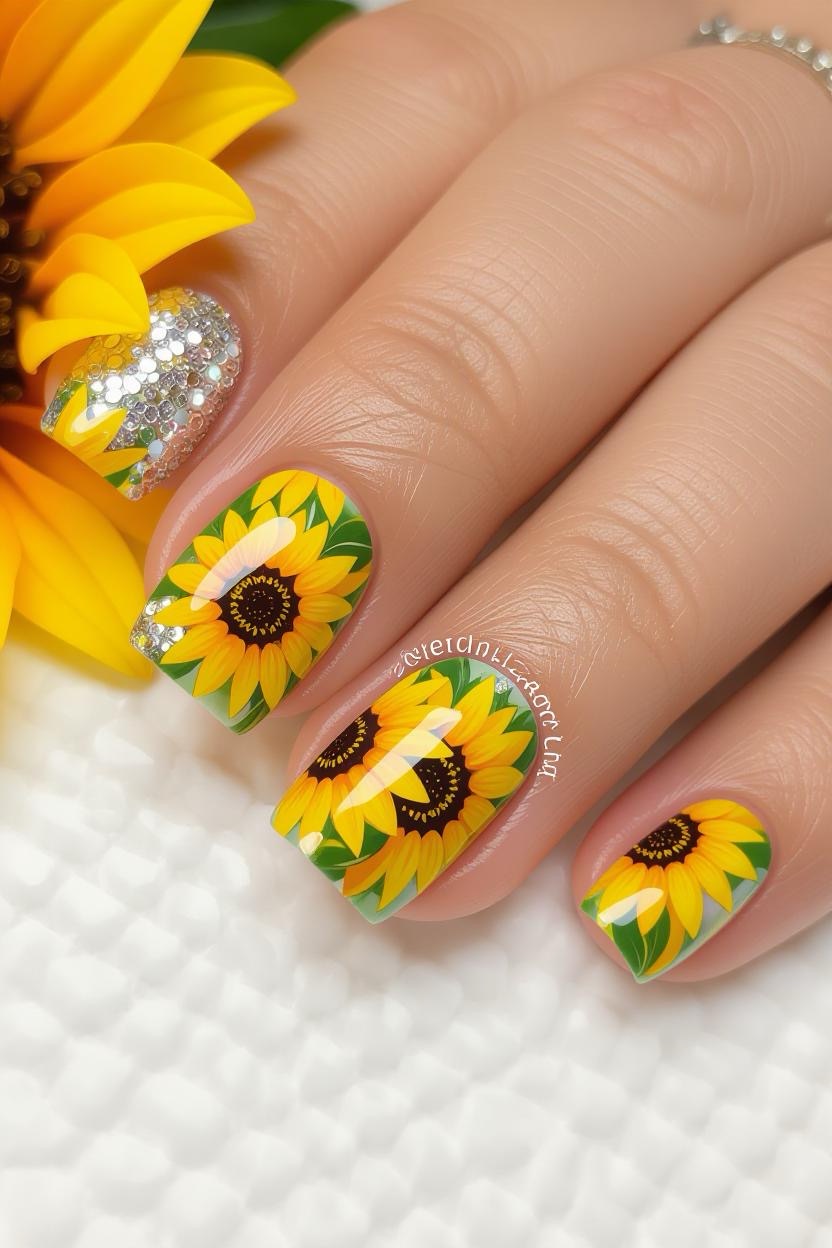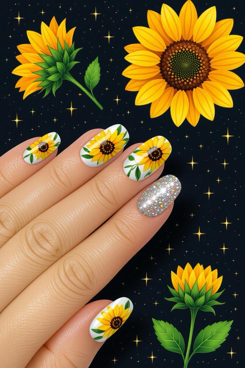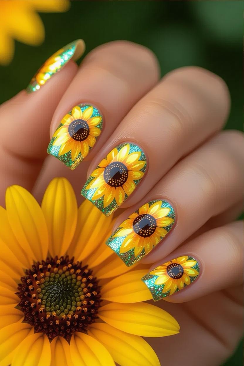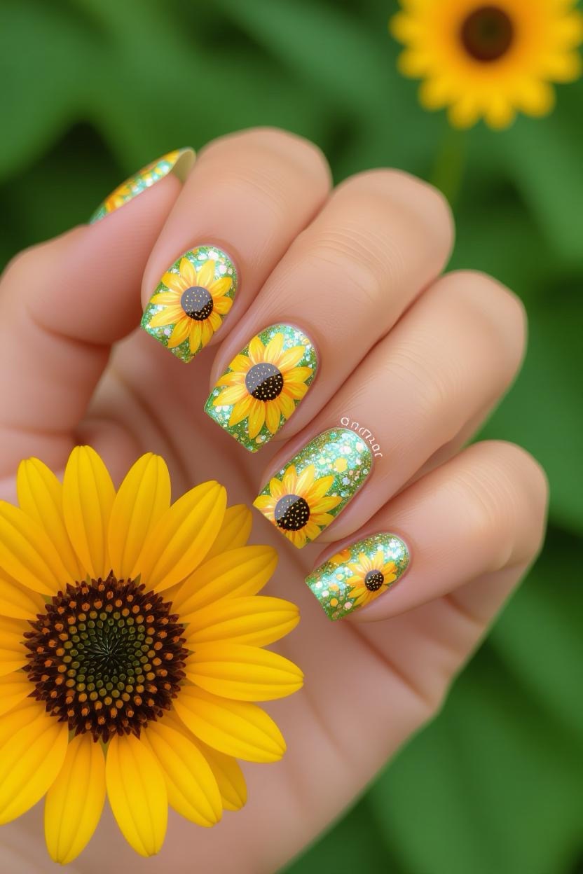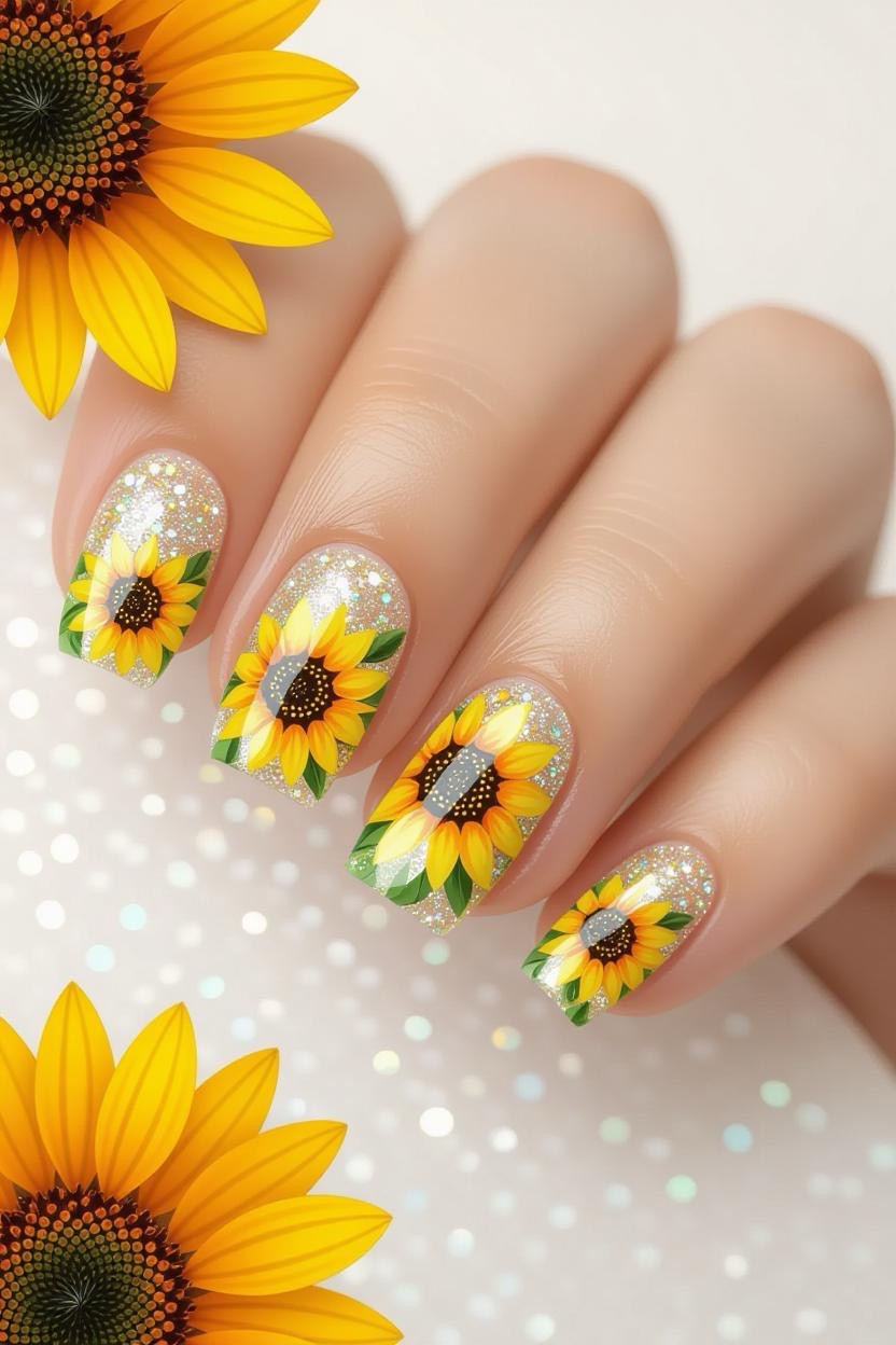 Blend glitter from the cuticle upward and add sunflower art at the tips for a fresh, sparkling style.