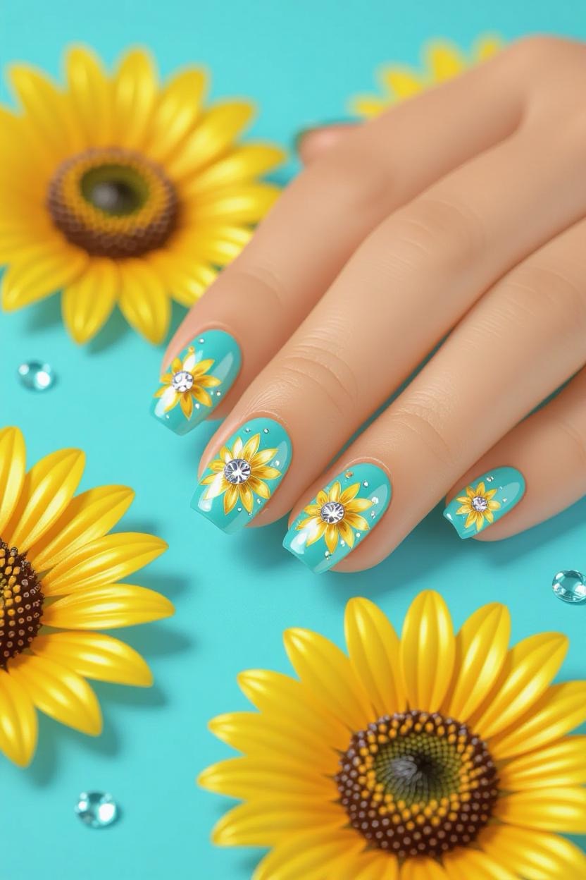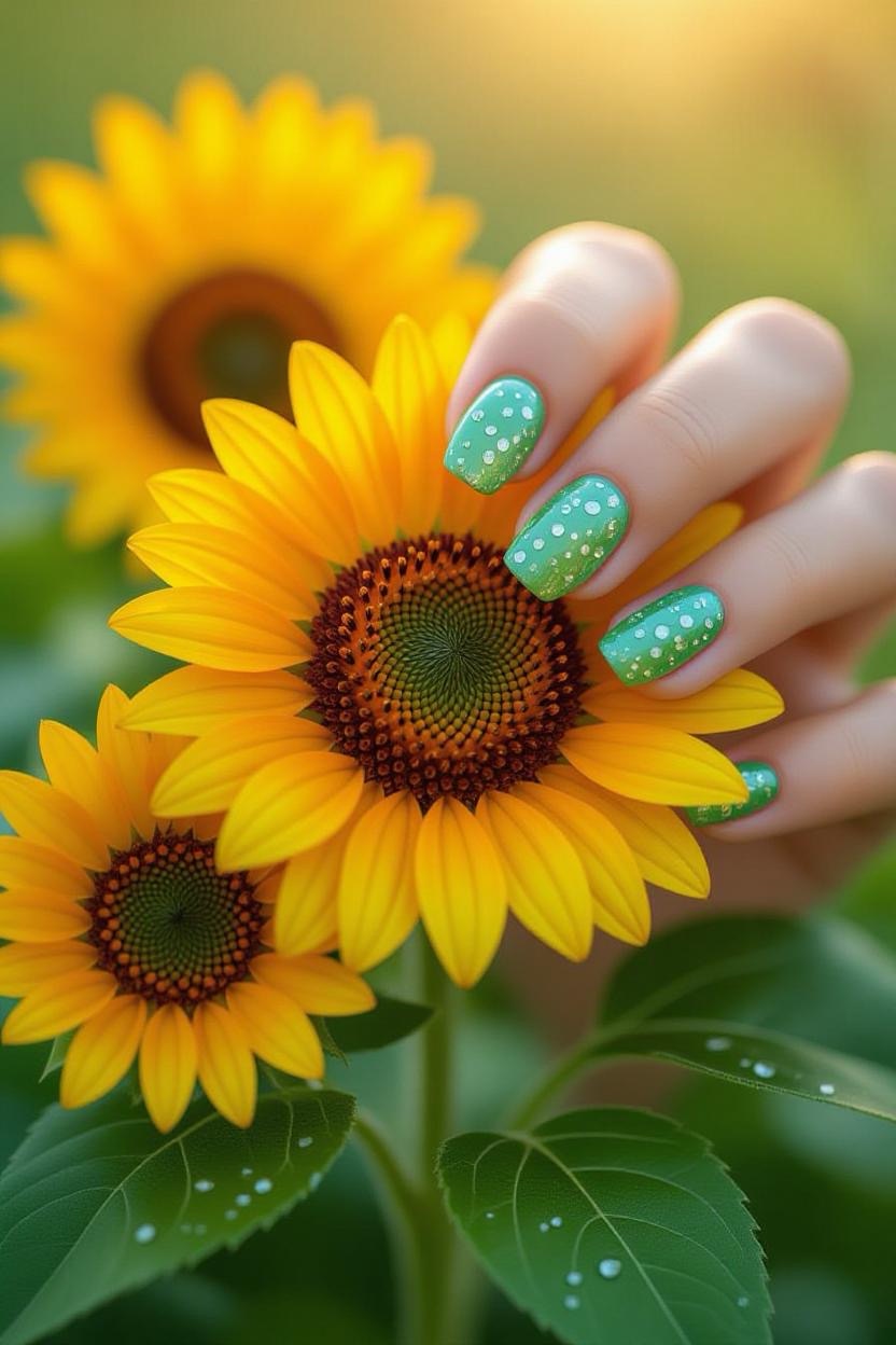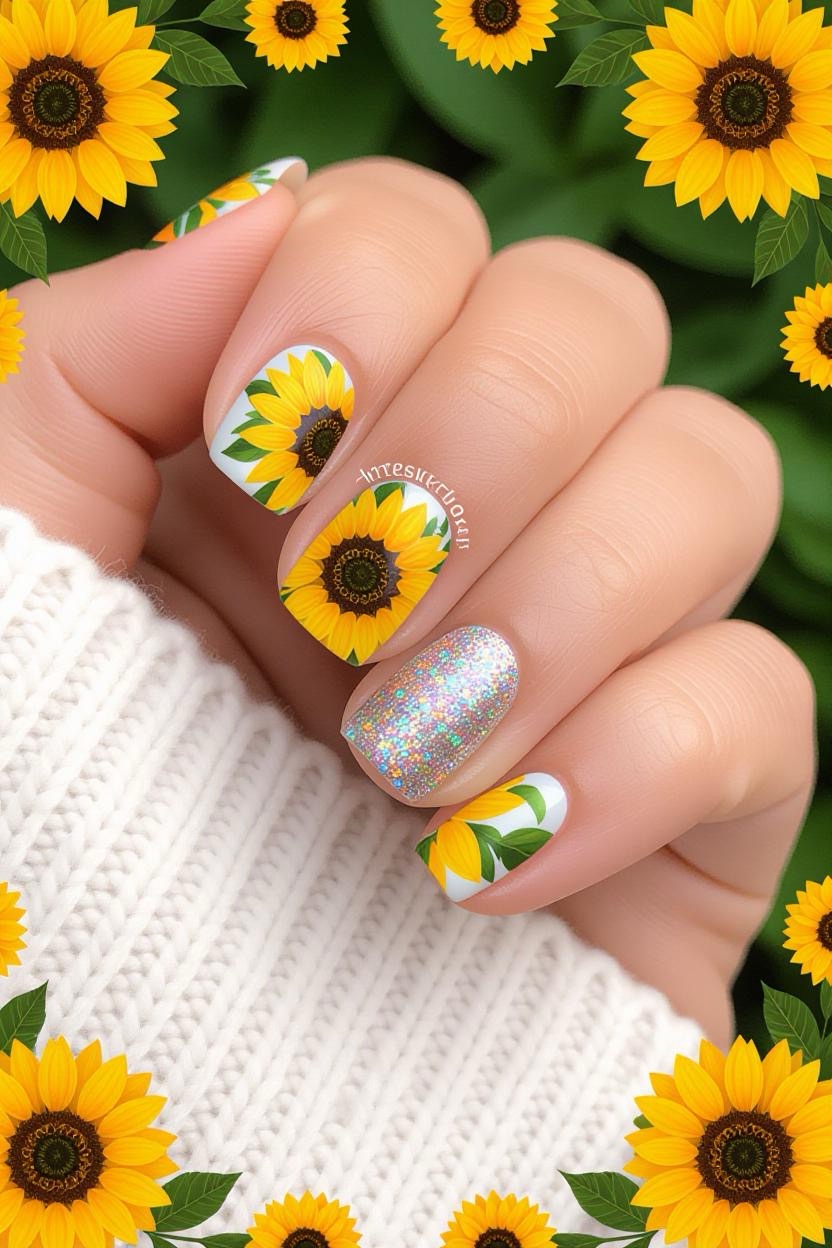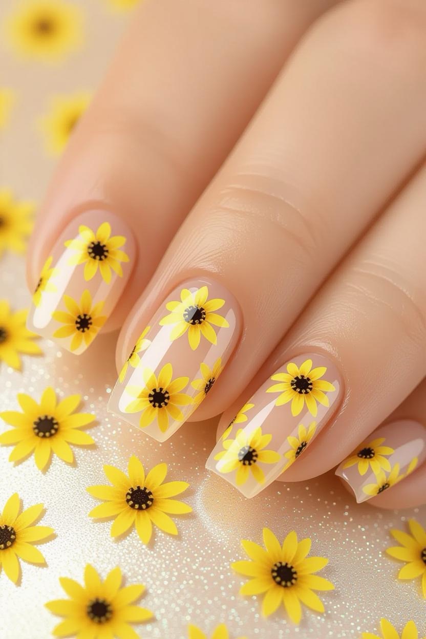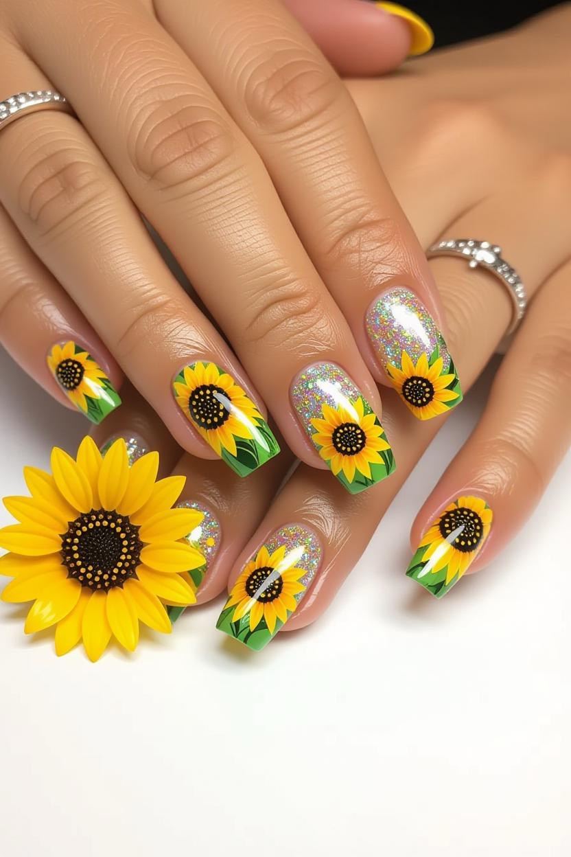 Blend glitter from the cuticle upward and add sunflower art at the tips for a fresh, sparkling style.