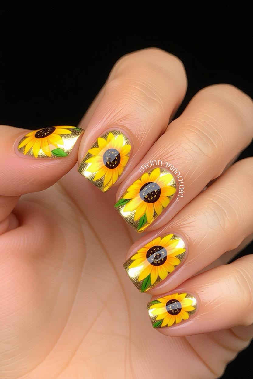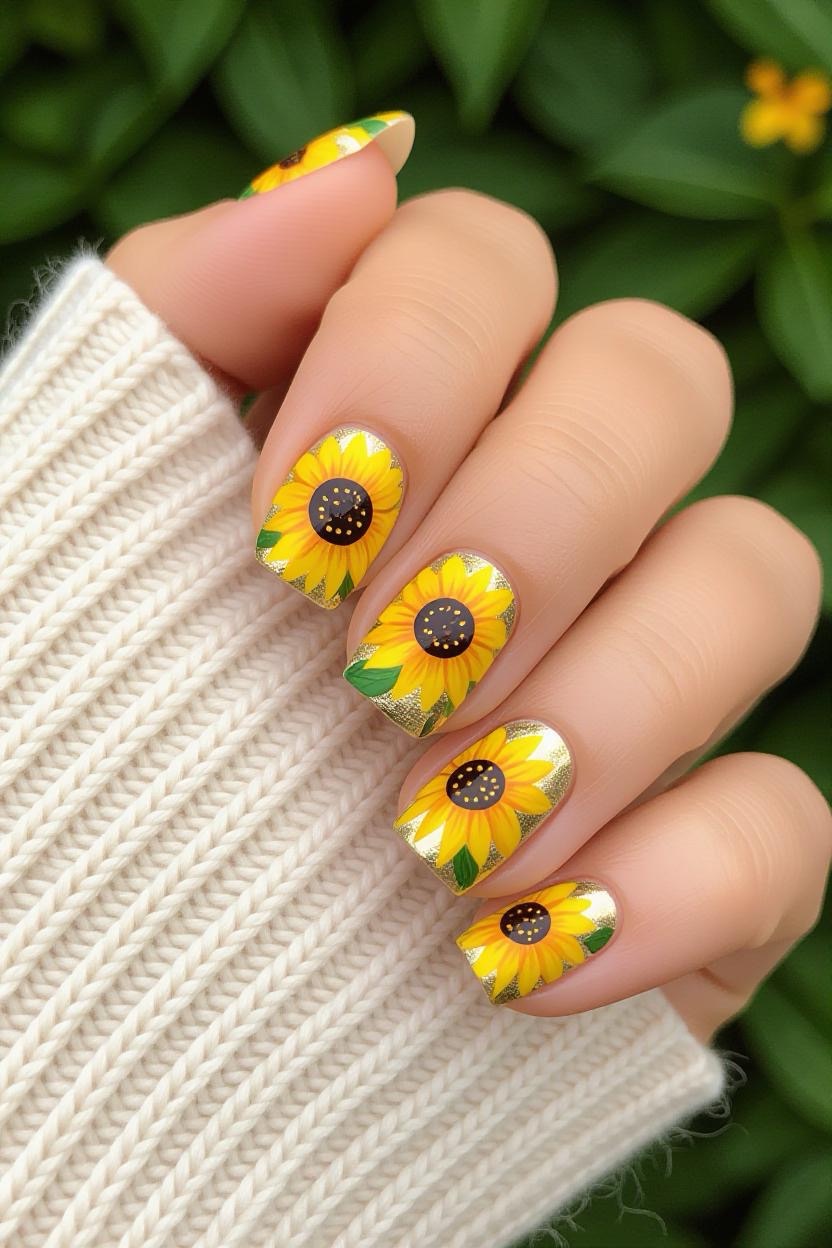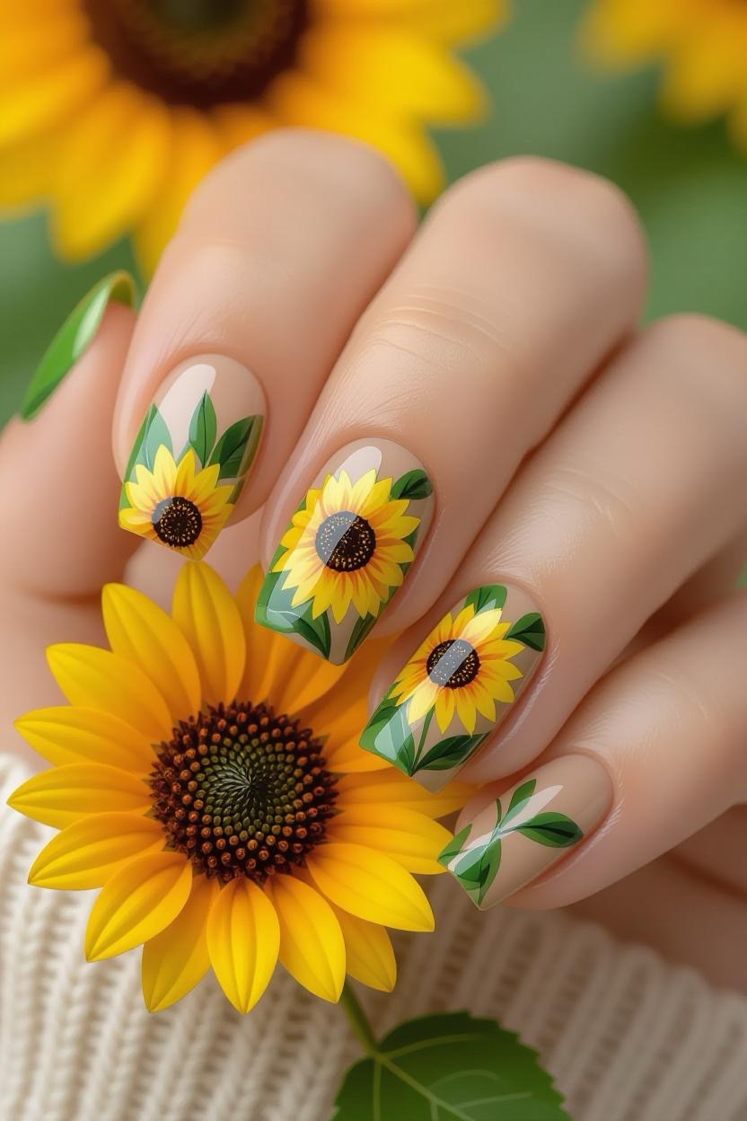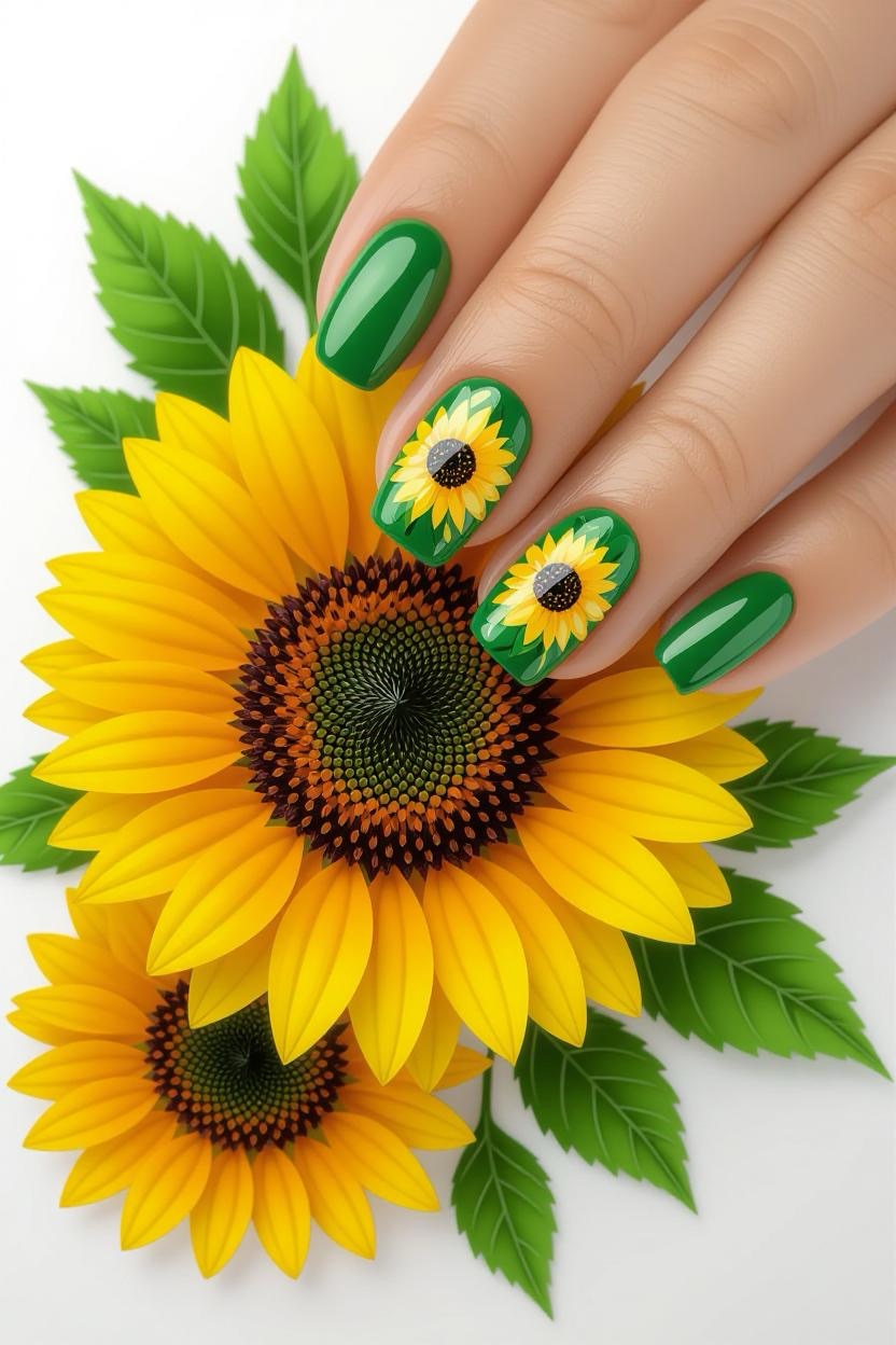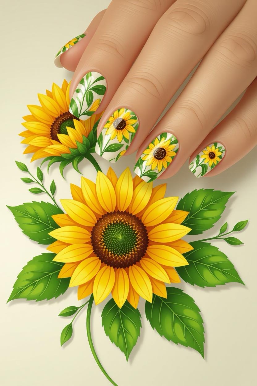 Add depth to your design with green leaves surrounding your sunflowers for a more nature-inspired manicure.