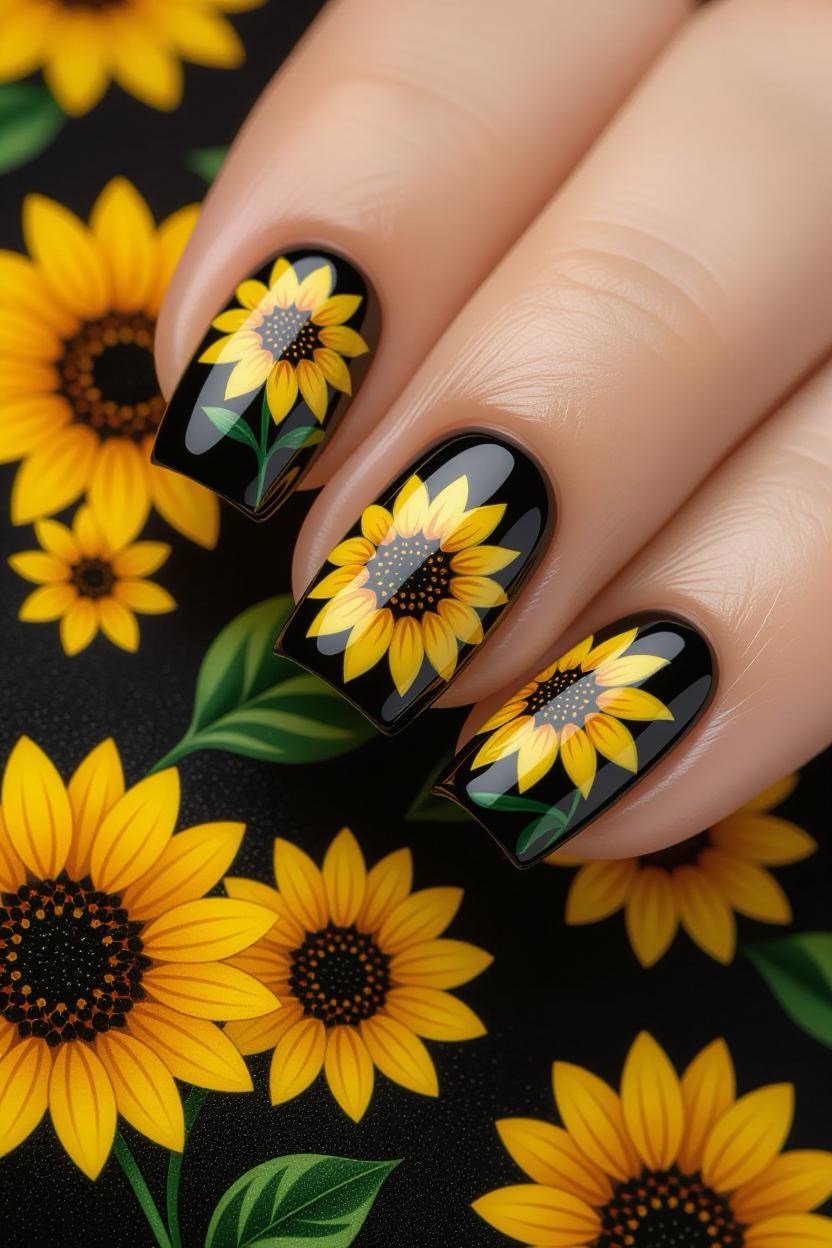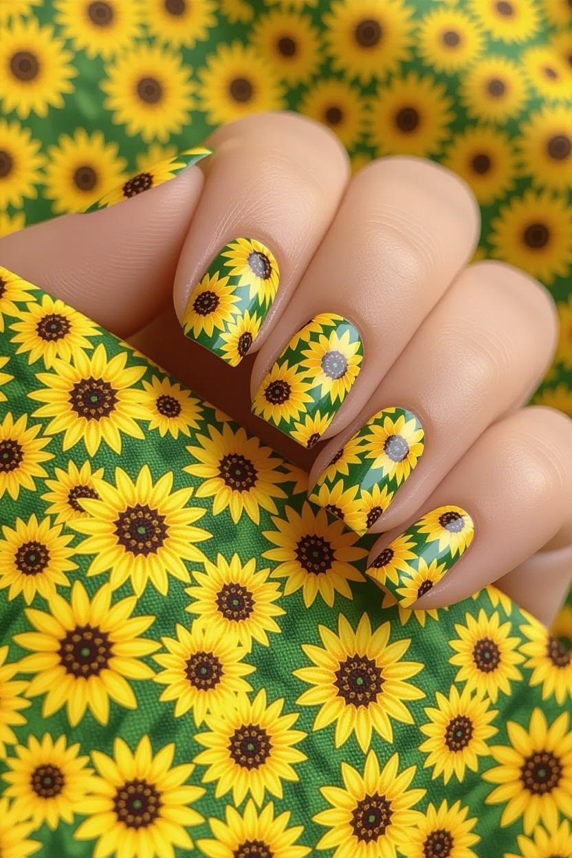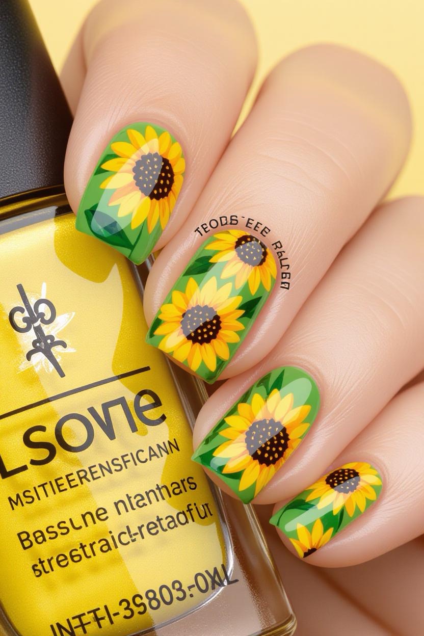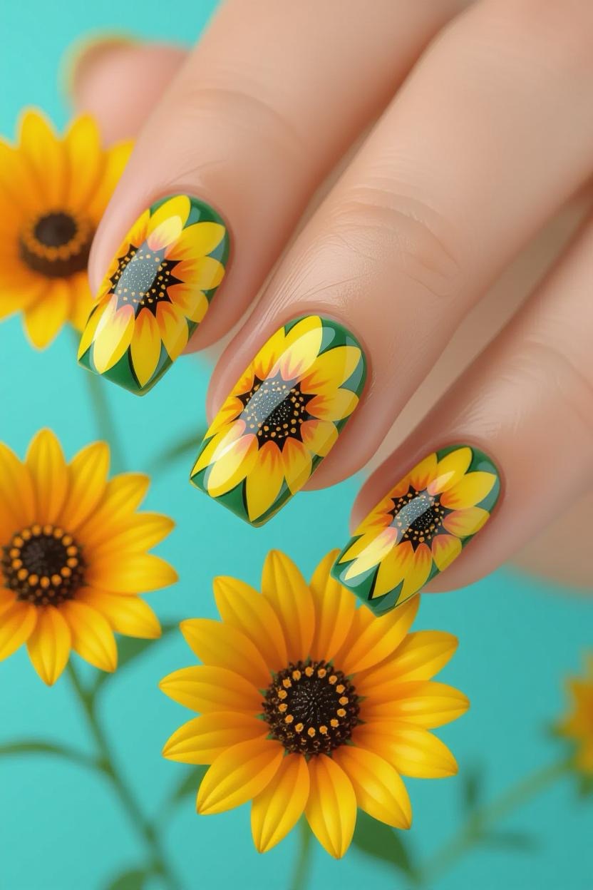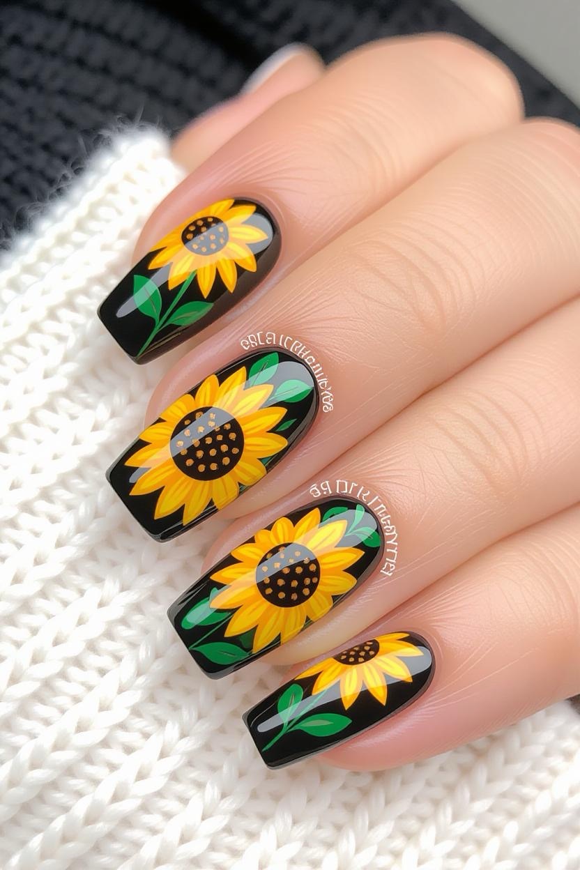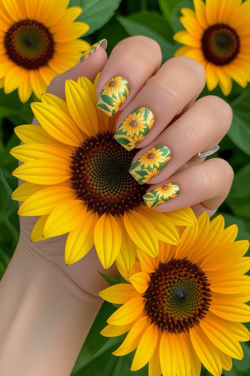 Add depth to your design with green leaves surrounding your sunflowers for a more nature-inspired manicure.