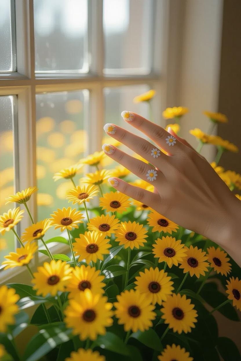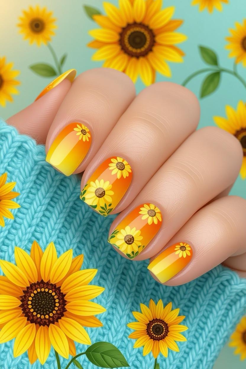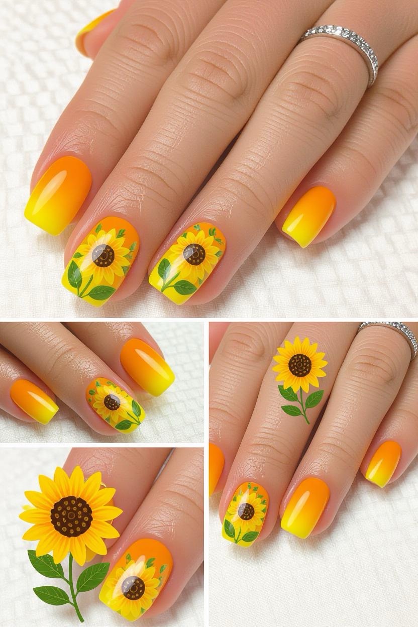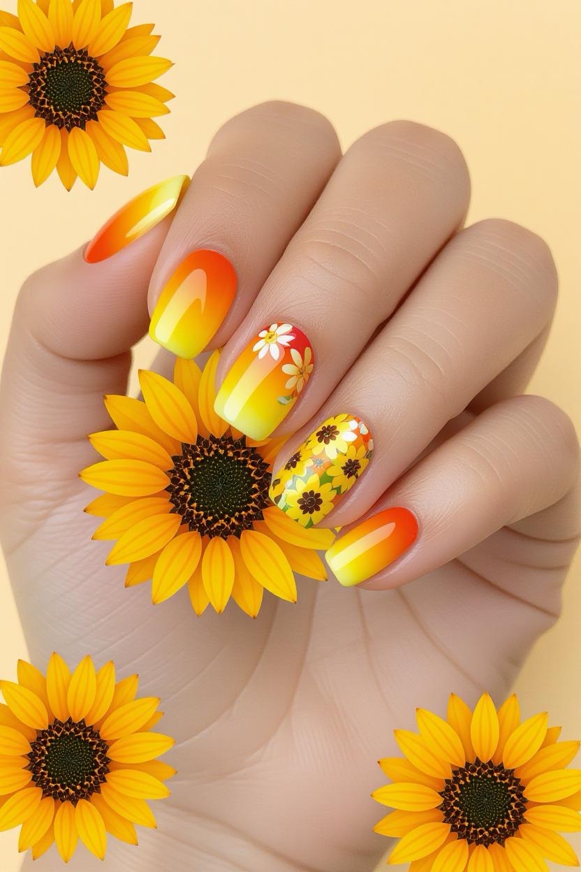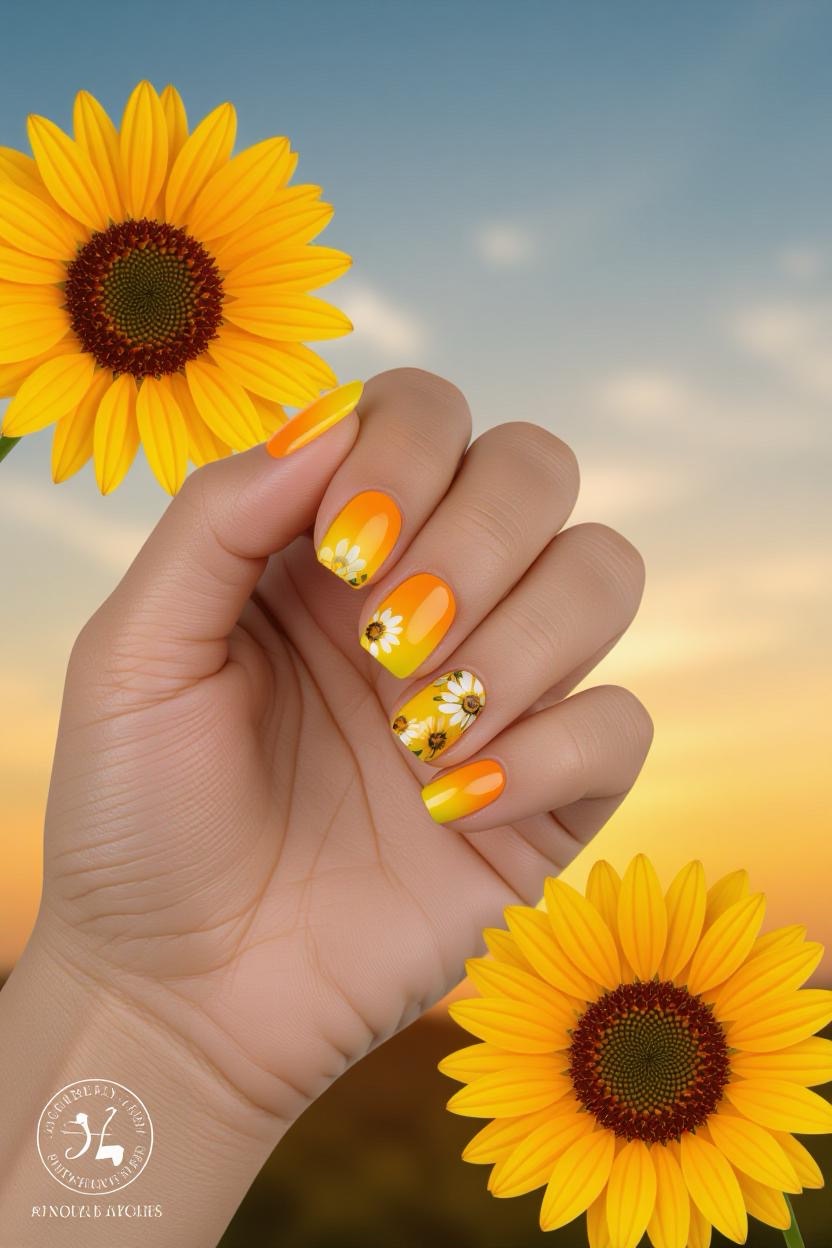Blend yellow and orange ombre nails with tiny sunflower details for a warm, gradient effect that looks like a sunset in bloom.