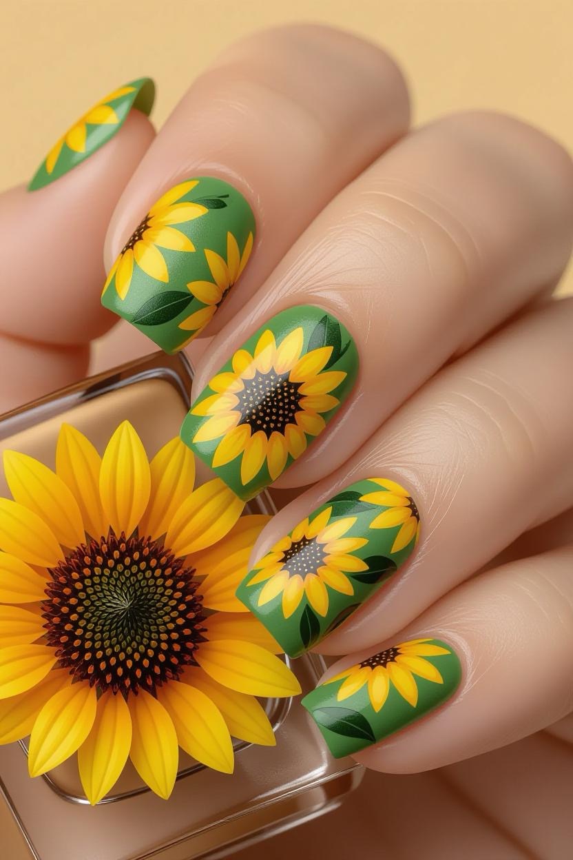 Opt for a matte finish in earthy tones with bold sunflower designs to create a trendy and modern nail look.