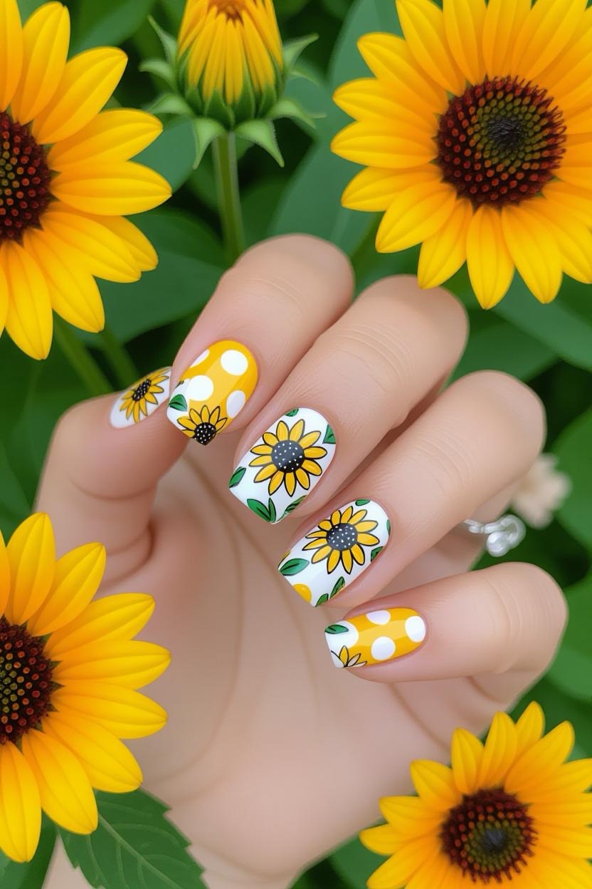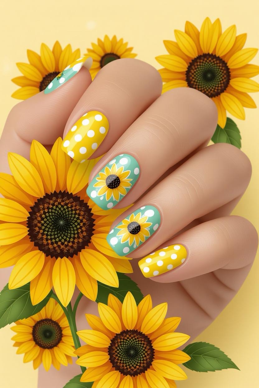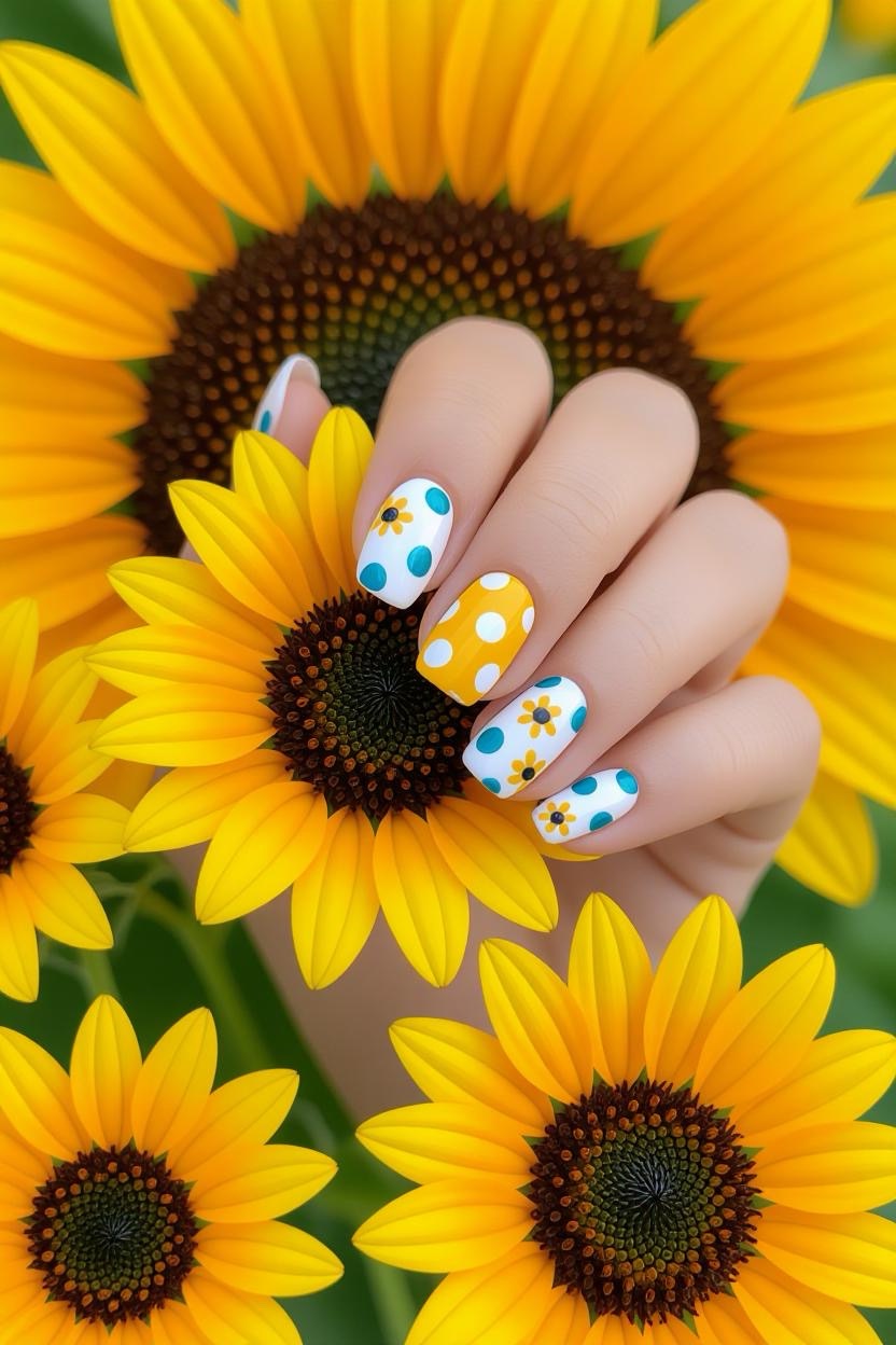 Mix playful white polka dots with vibrant sunflower accents for a retro, cute style that’s full of personality.