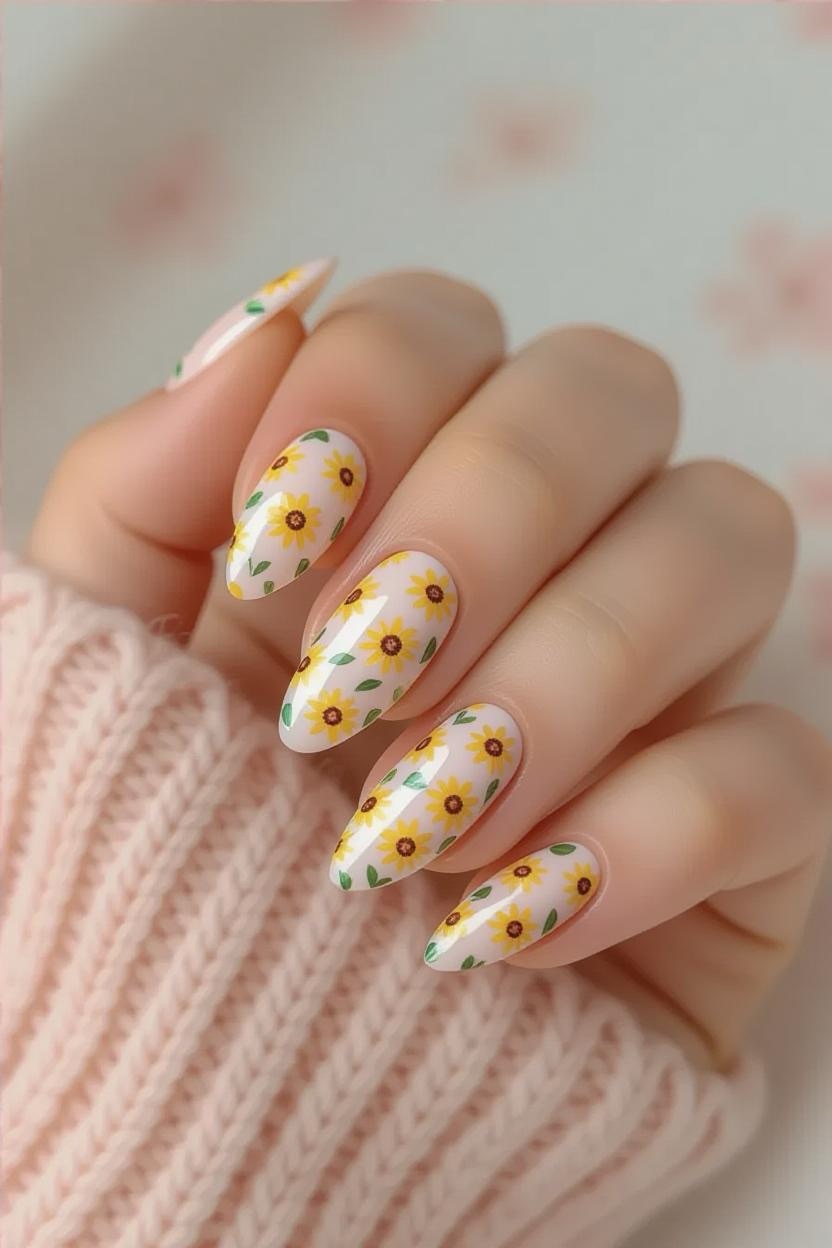 Keep it timeless with a delicate nude polish topped with hand-painted yellow sunflowers. This look is fresh, feminine, and perfect for both casual outings and special occasions.
