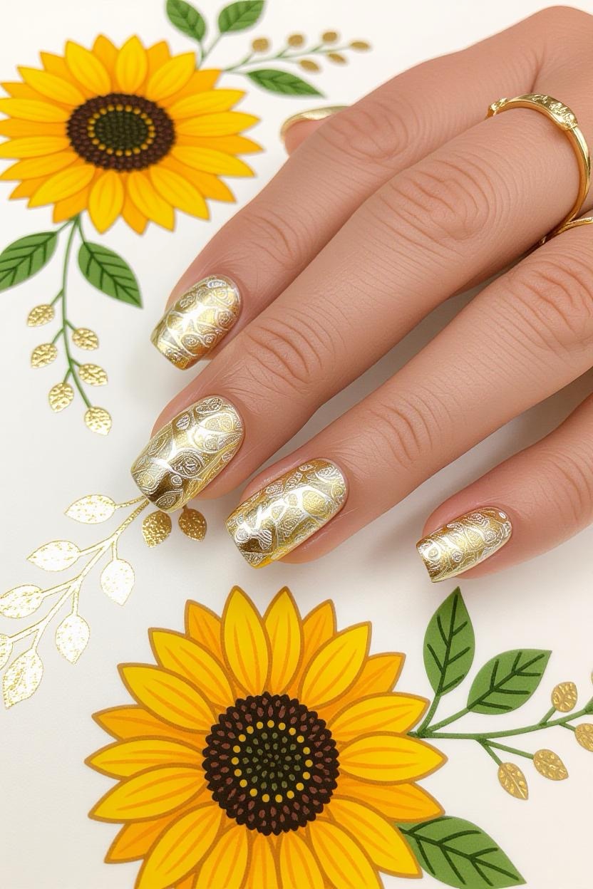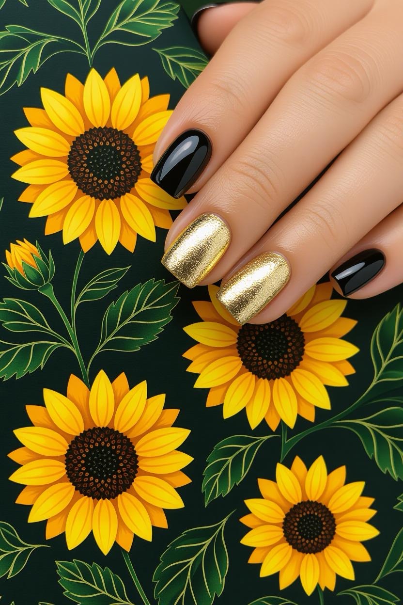 Elevate your look by pairing hand-painted sunflowers with delicate gold foil for an elegant, luxe finish.