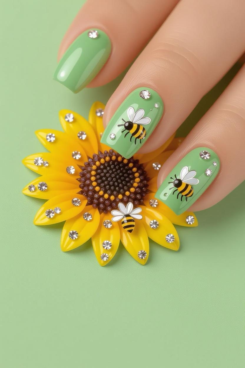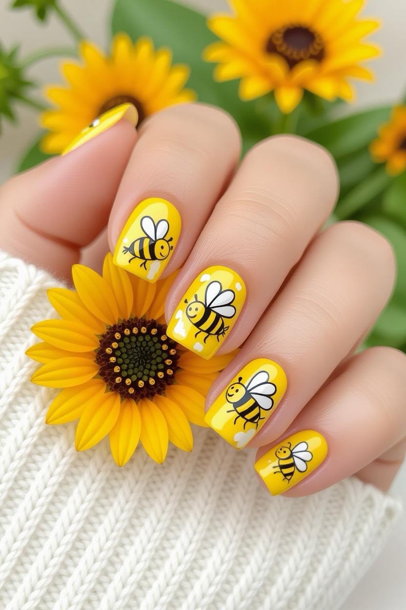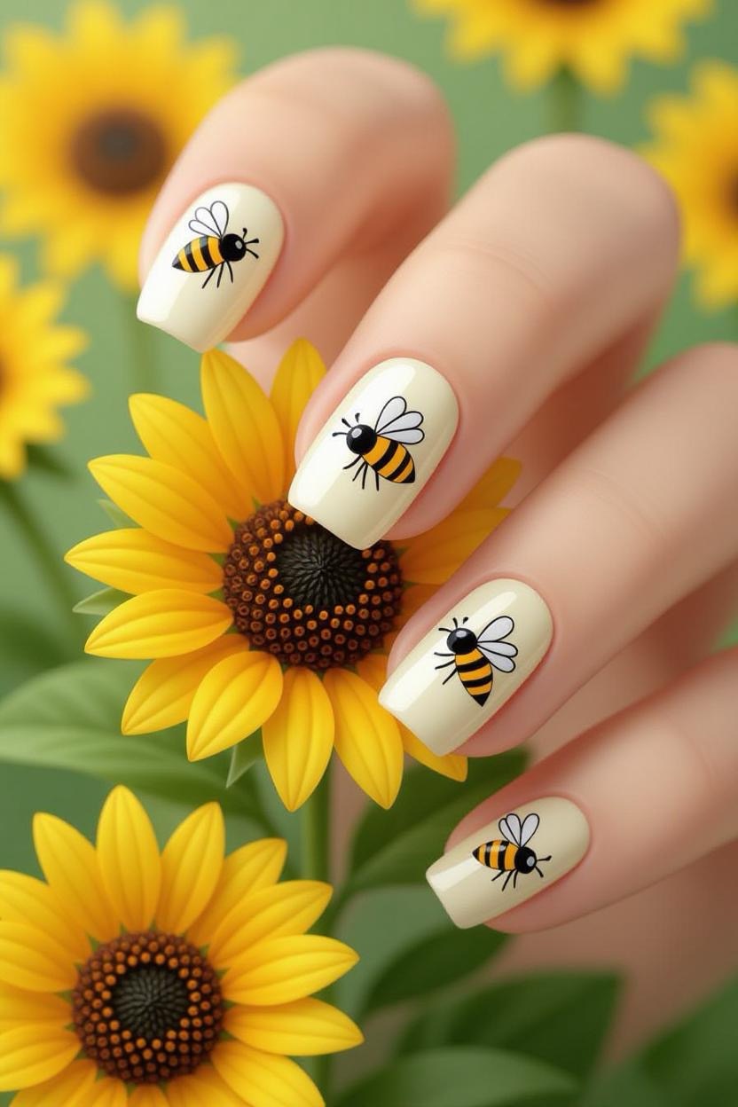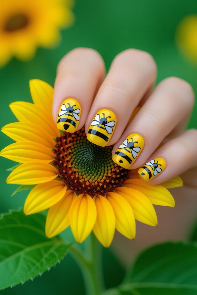 Bring your sunflower nails to life by adding cute little bees, a whimsical and nature-friendly detail.