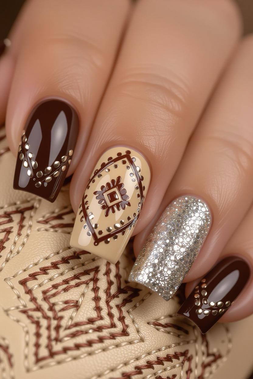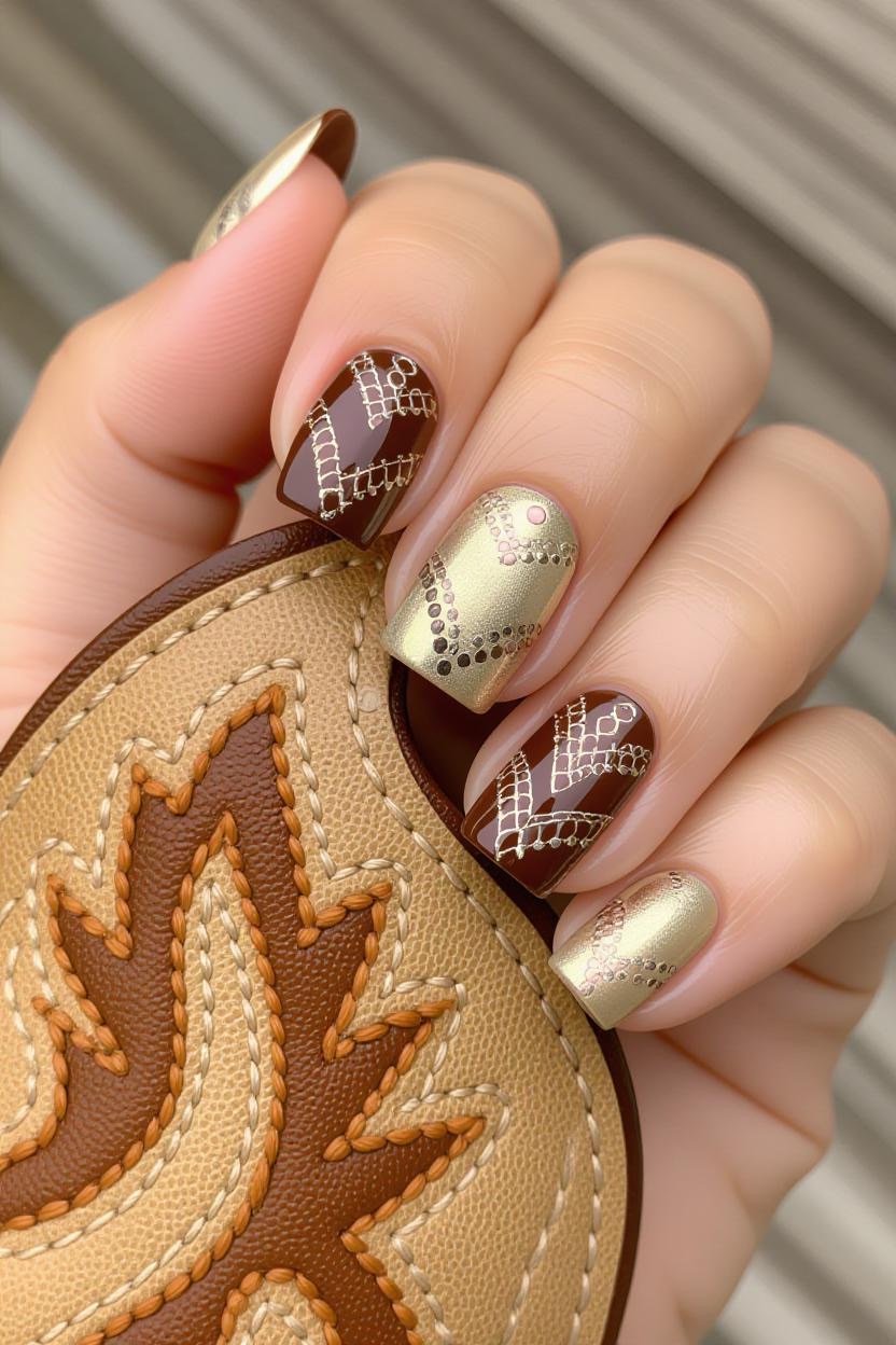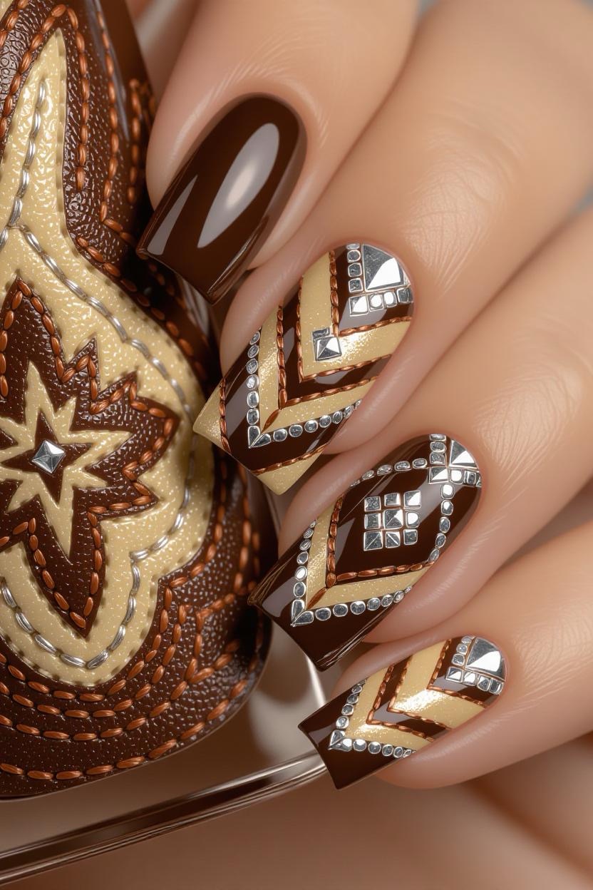 Take inspiration from classic cowgirl boots with intricate stitching and patterns painted directly on your nails. Pair brown, tan, and metallic shades to create a truly authentic Western-inspired design that feels both stylish and unique.