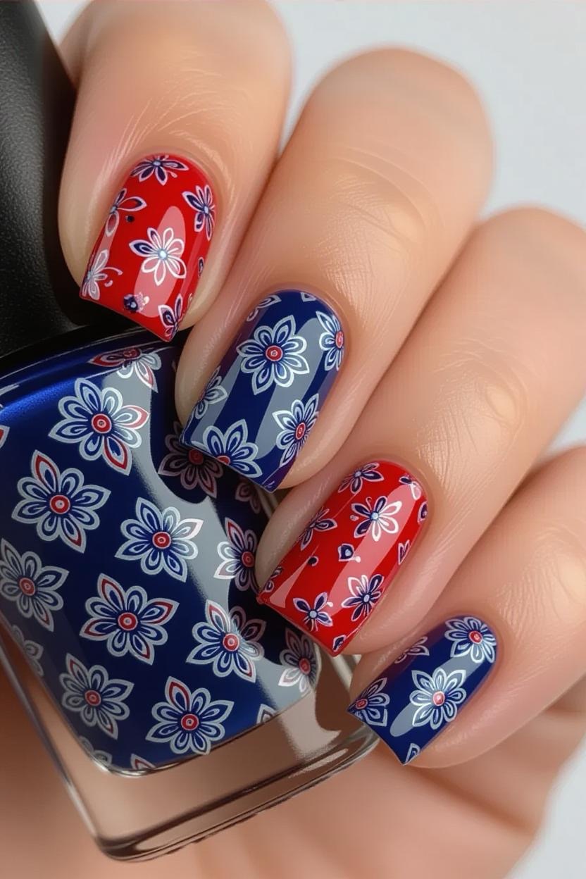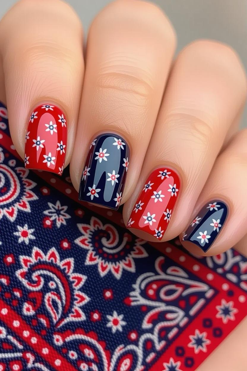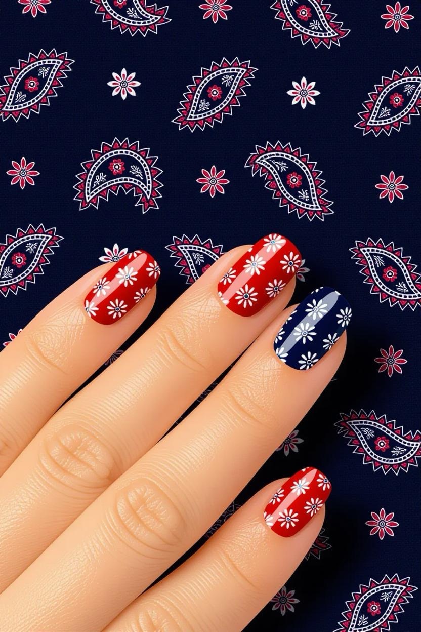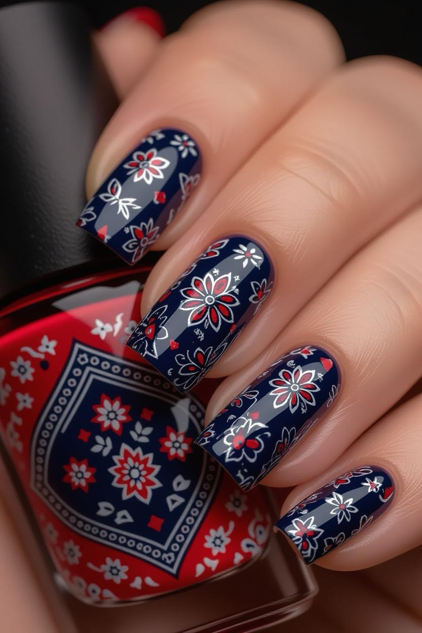Channel rodeo energy with paisley bandana-inspired nail art. This detailed design features tiny patterns in classic red, navy, or black backgrounds, giving a bold cowgirl statement that stands out.