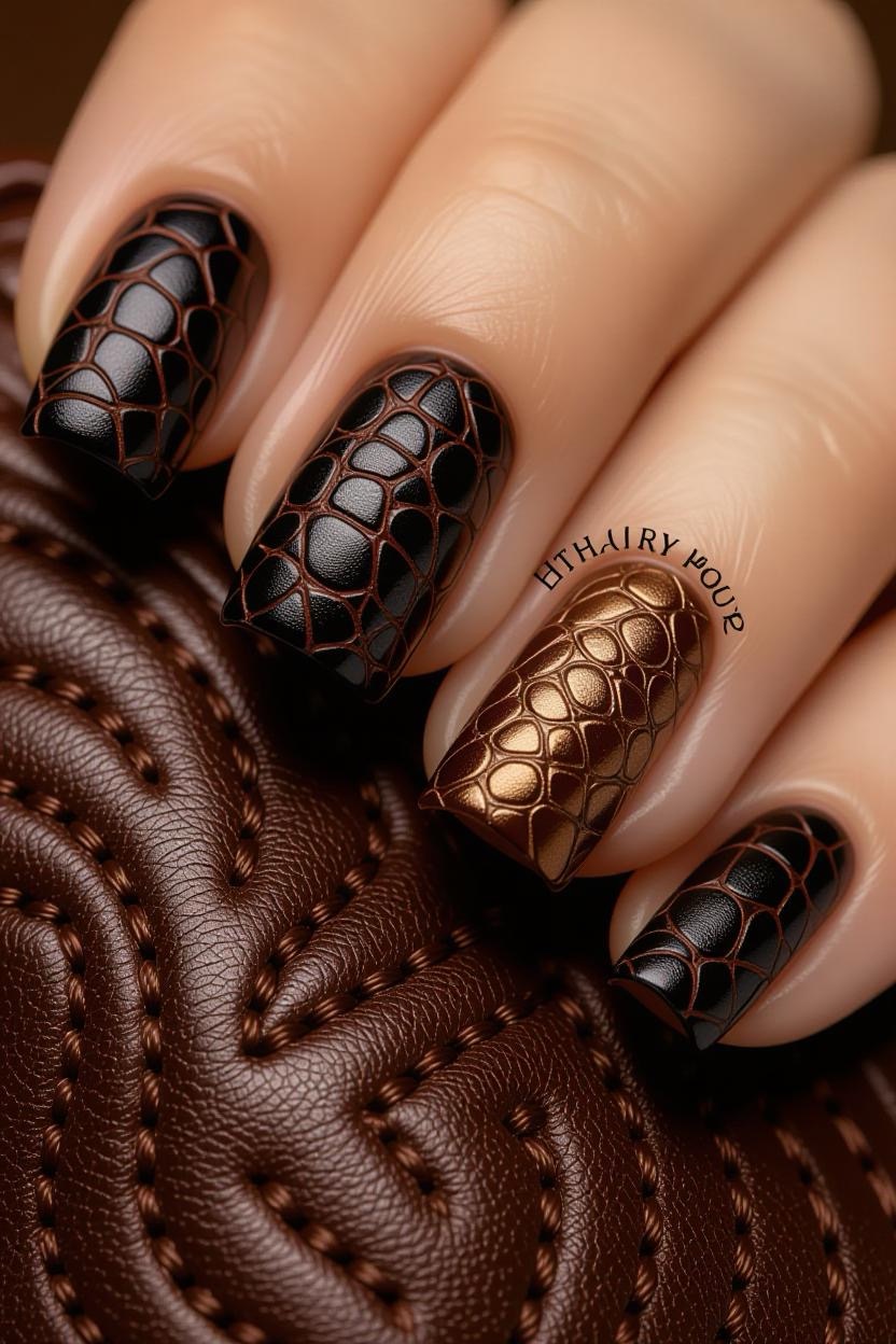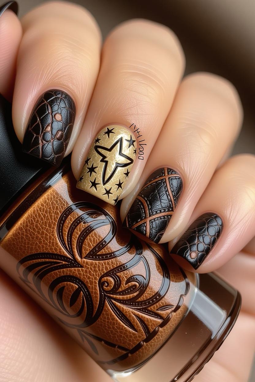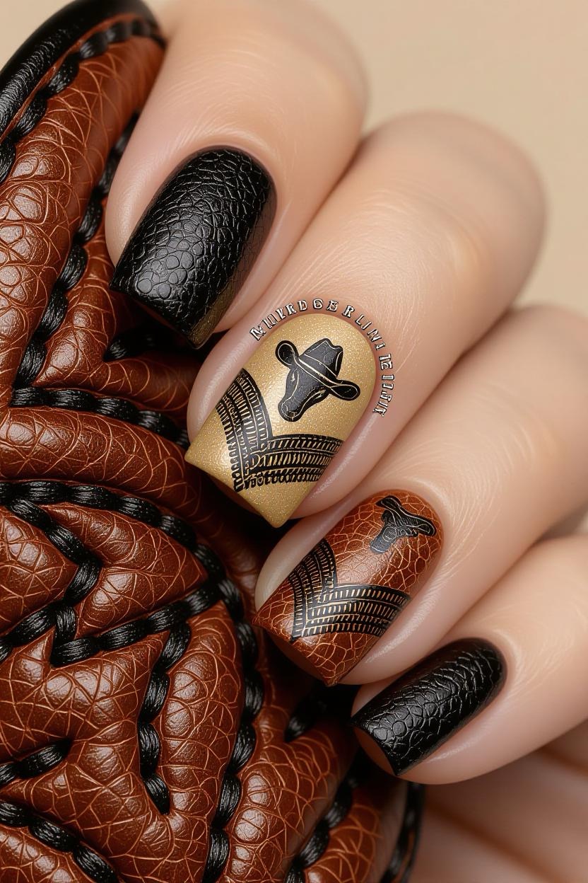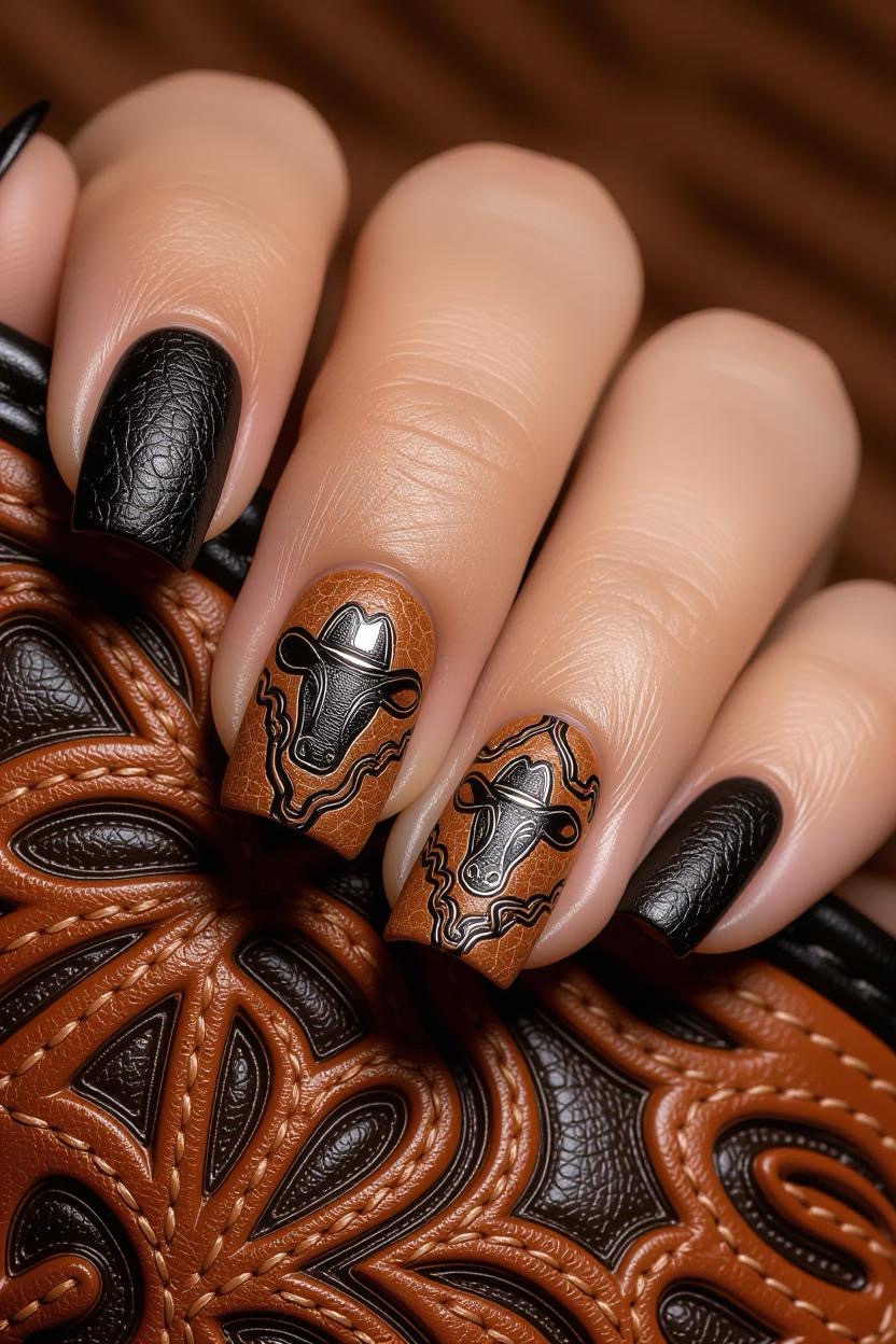 For a rugged yet stylish look, leather-textured nail designs in shades of brown and black give a bold Western aesthetic. Matte finishes and embossed details mimic the feel of real cowgirl boots or belts.