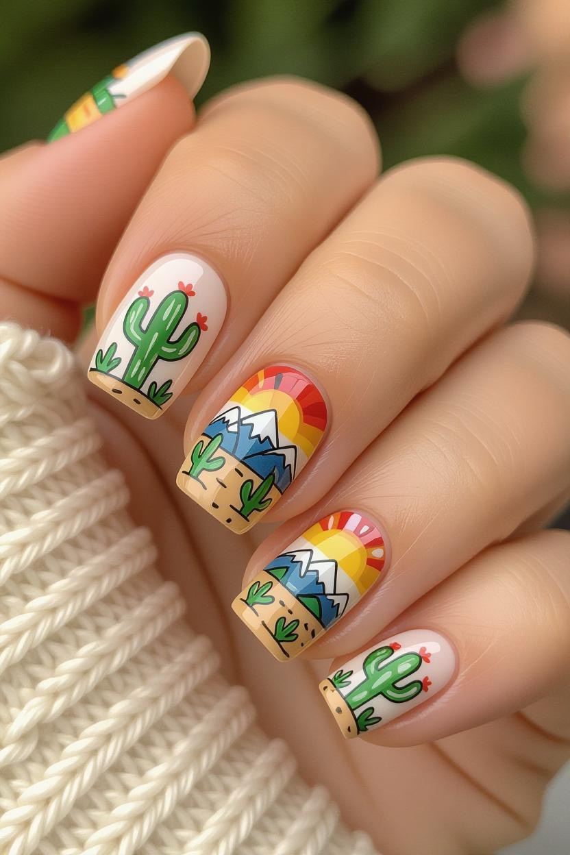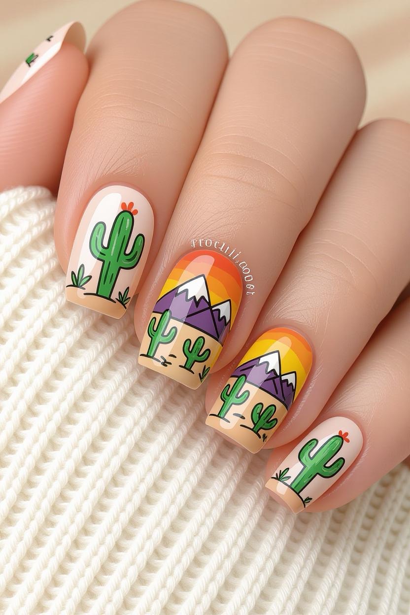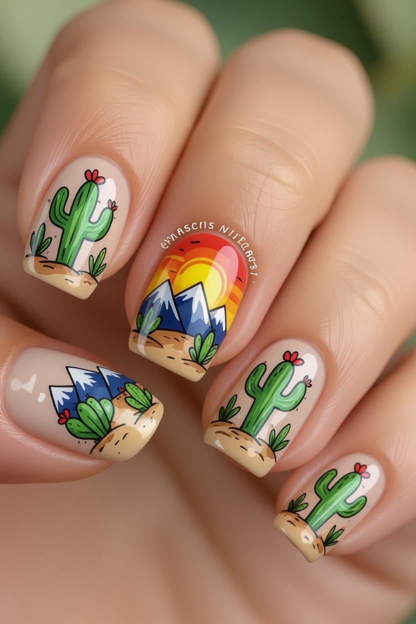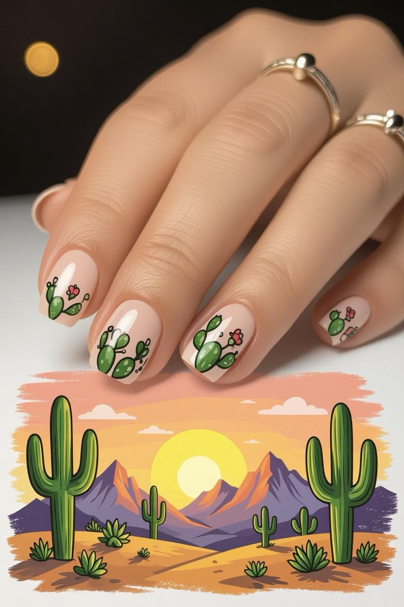 Nothing says “Western” like cactus nail art. Add little desert plants, mountains, or even sunset backdrops on neutral nails for a cowgirl look that’s fun, creative, and Instagram-ready.