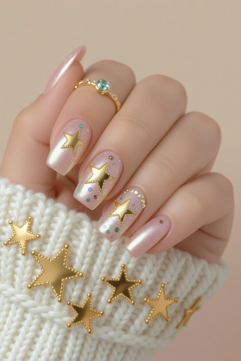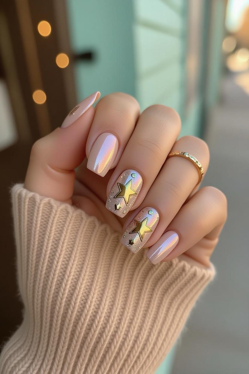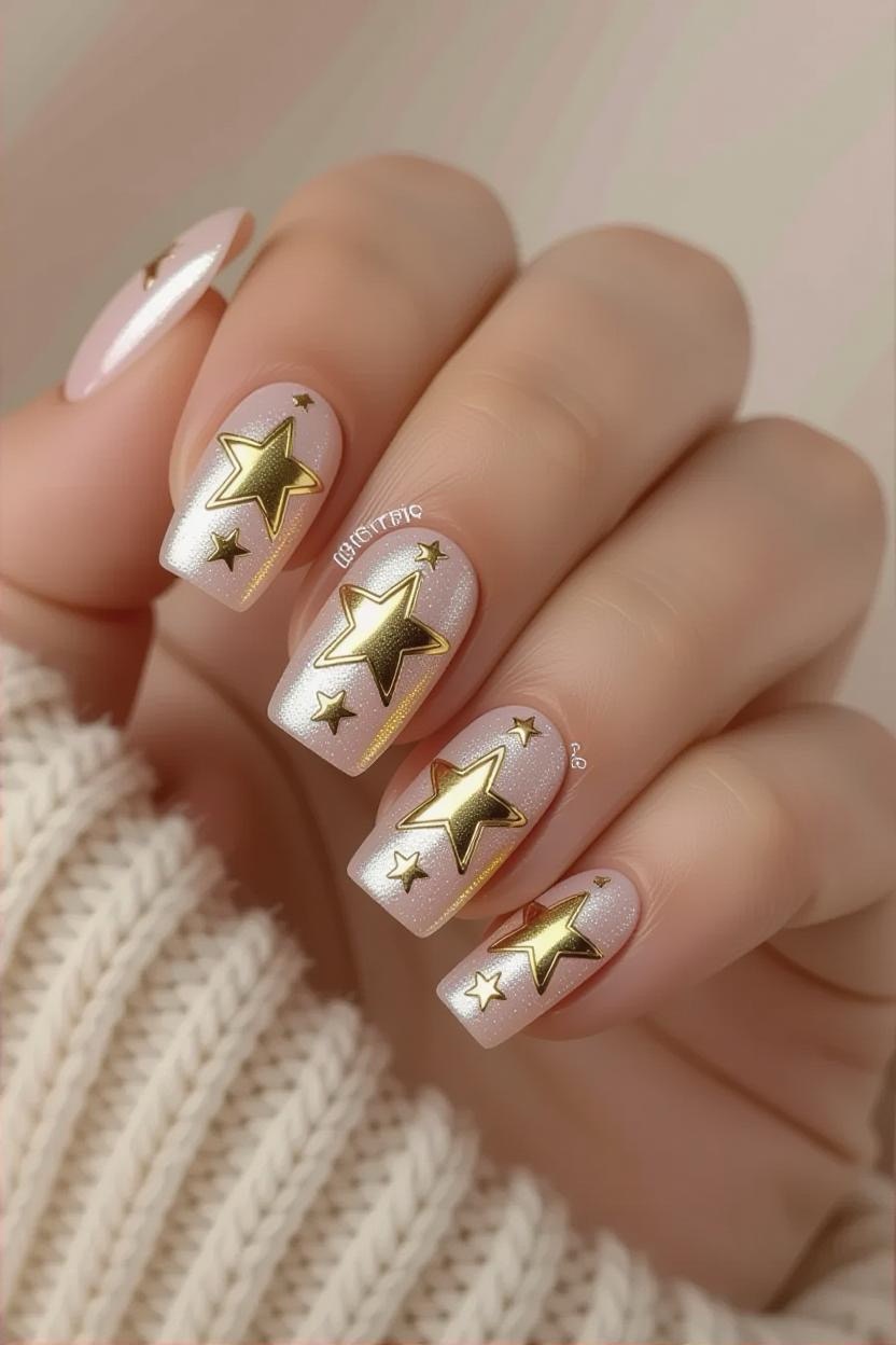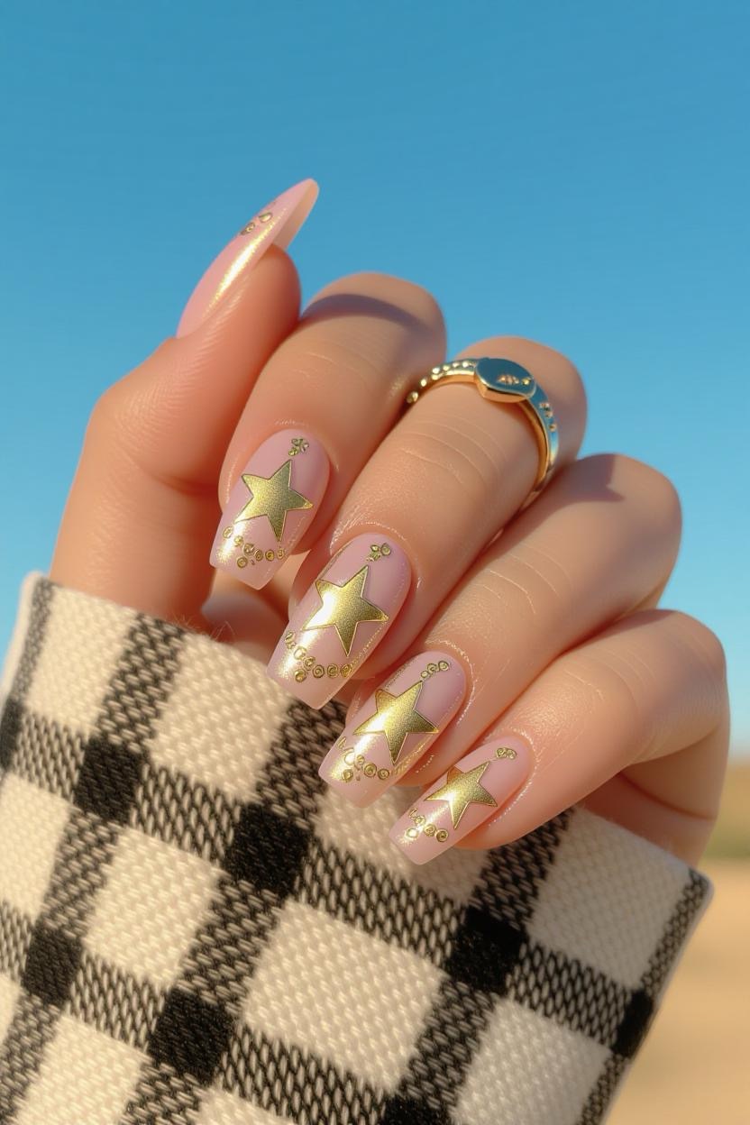 Go bold with metallic sheriff star stickers or hand-painted accents. This design works beautifully on a simple nude or pastel background, making the stars pop and giving your nails that rodeo sparkle.
