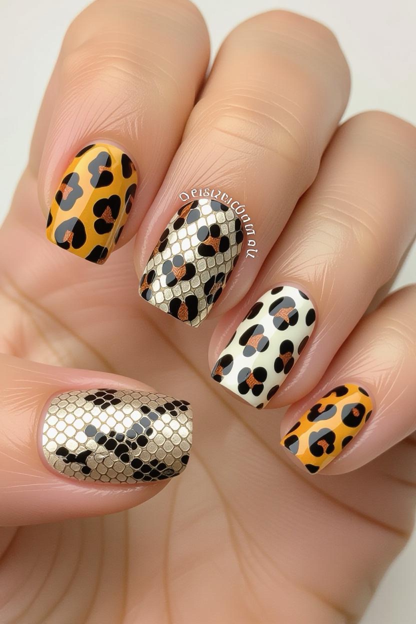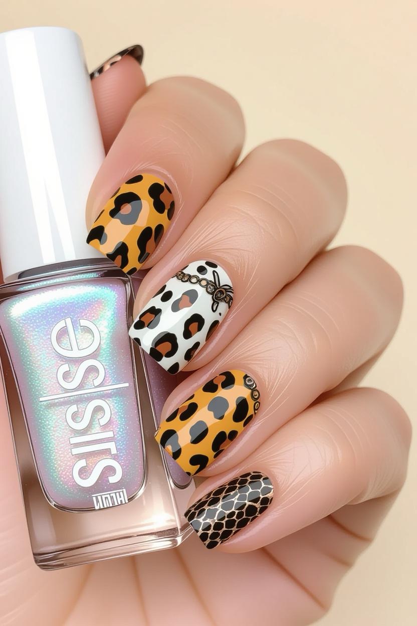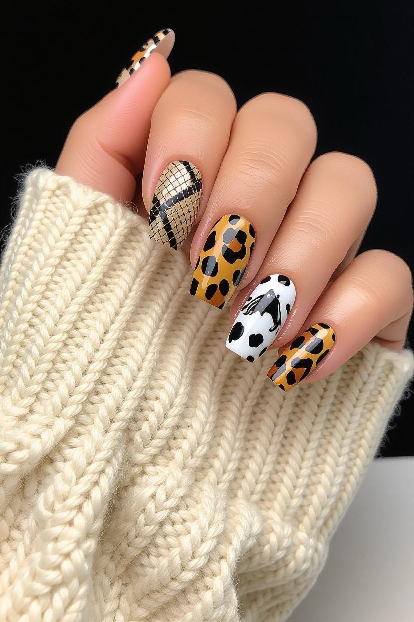 Step beyond cow spots and try a mix of Western-inspired animal prints like snakeskin, leopard, and even horse-inspired patterns. Combine them into one manicure for a truly adventurous cowgirl look.