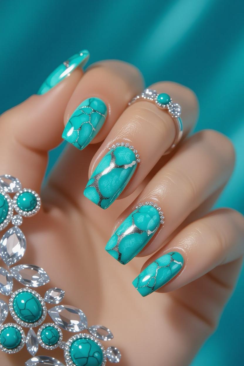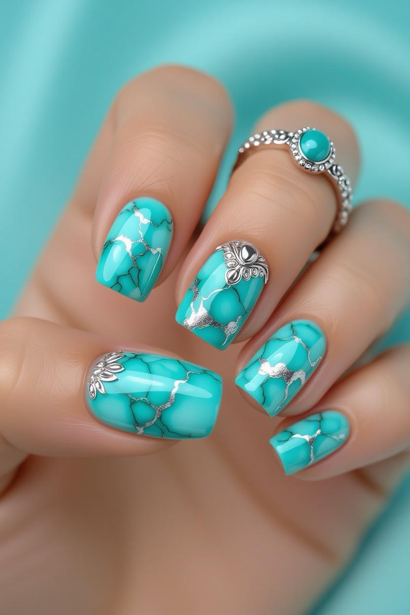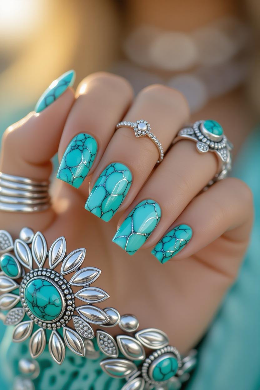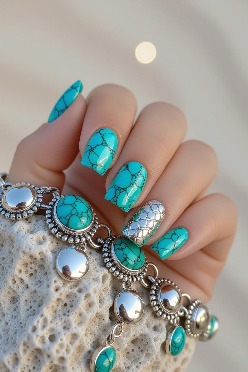 Turquoise jewelry is iconic in Western fashion. Capture its essence by painting your nails with turquoise marble art or adding stone-inspired accents. Pair with silver foil for a jewelry-inspired manicure.