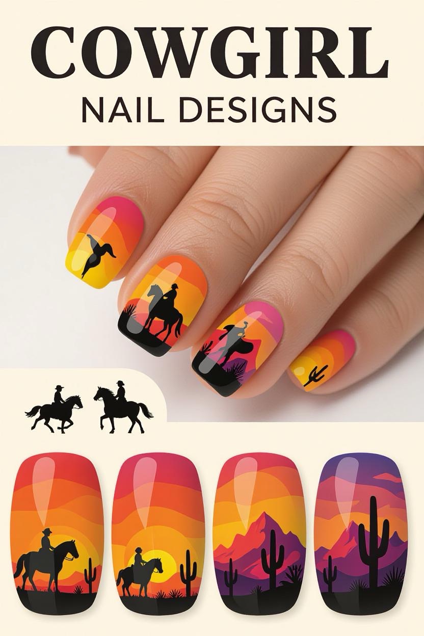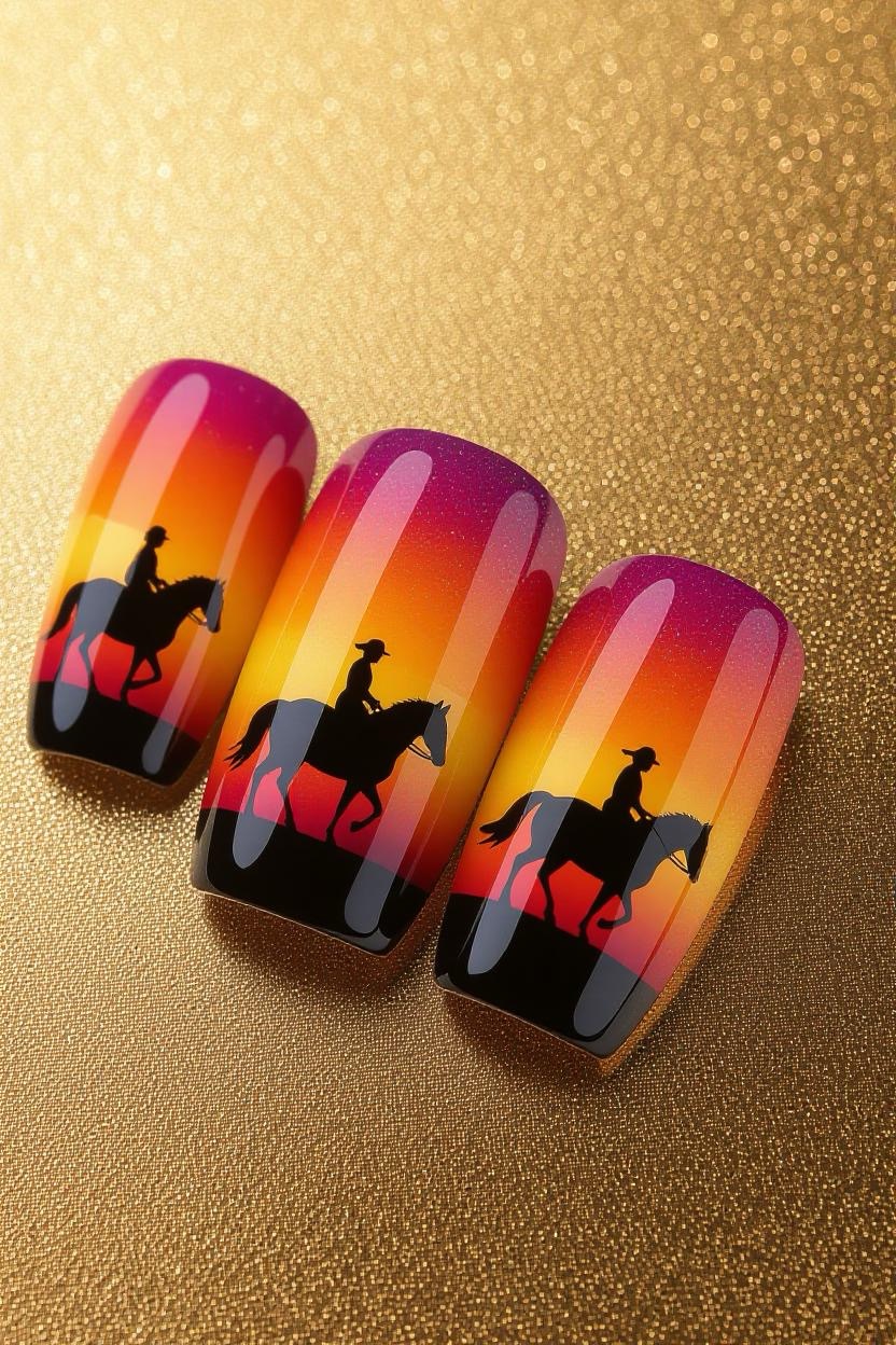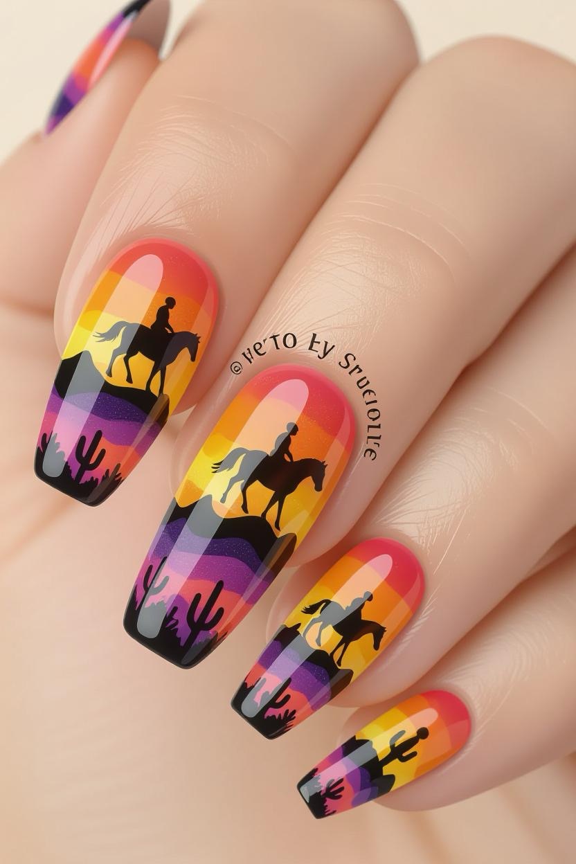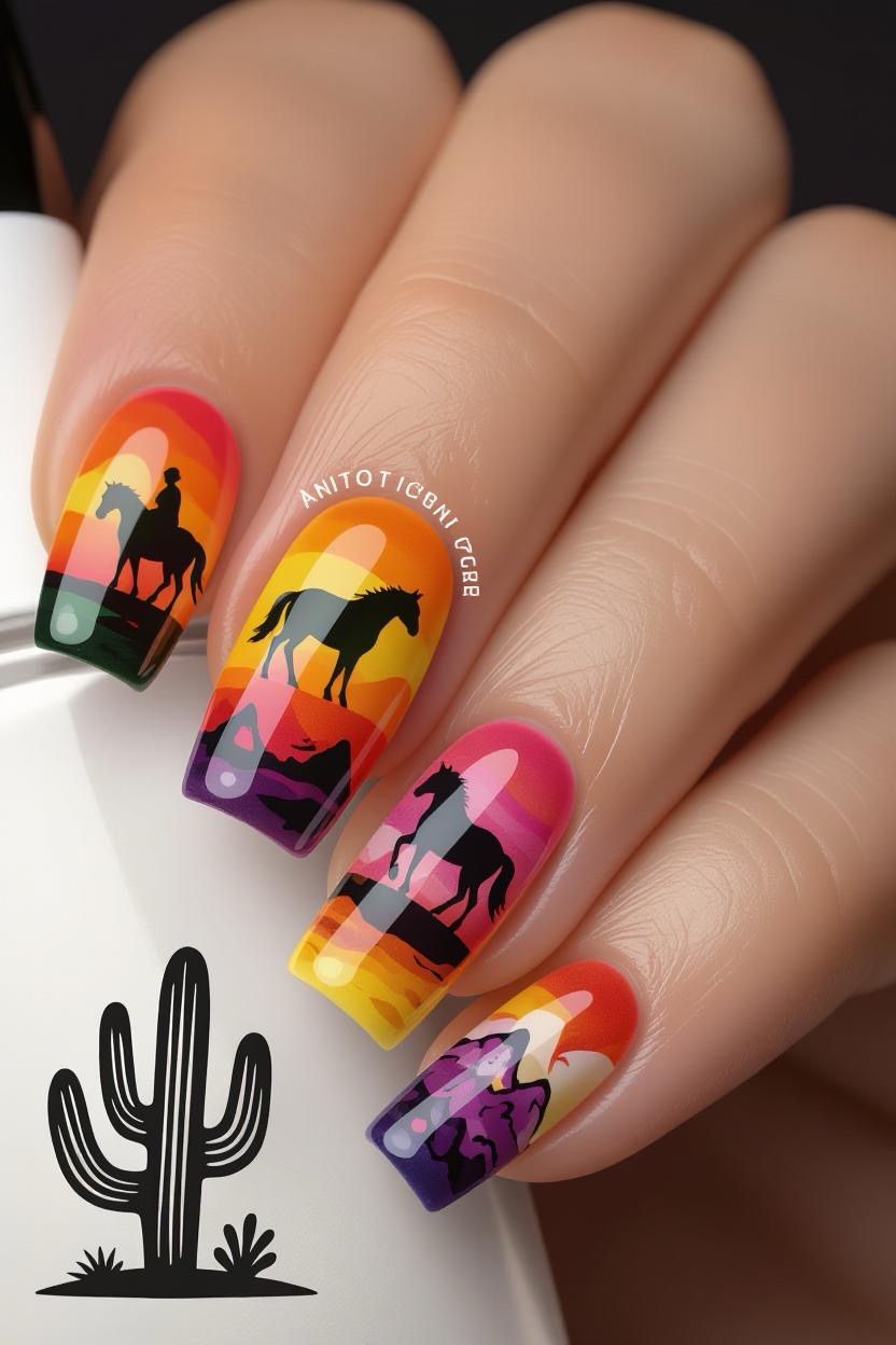Blend warm desert sunset colors, deep orange, coral, pink, and purple, into a stunning gradient design. Add silhouettes of horses, cacti, or mountains for a truly Western masterpiece.