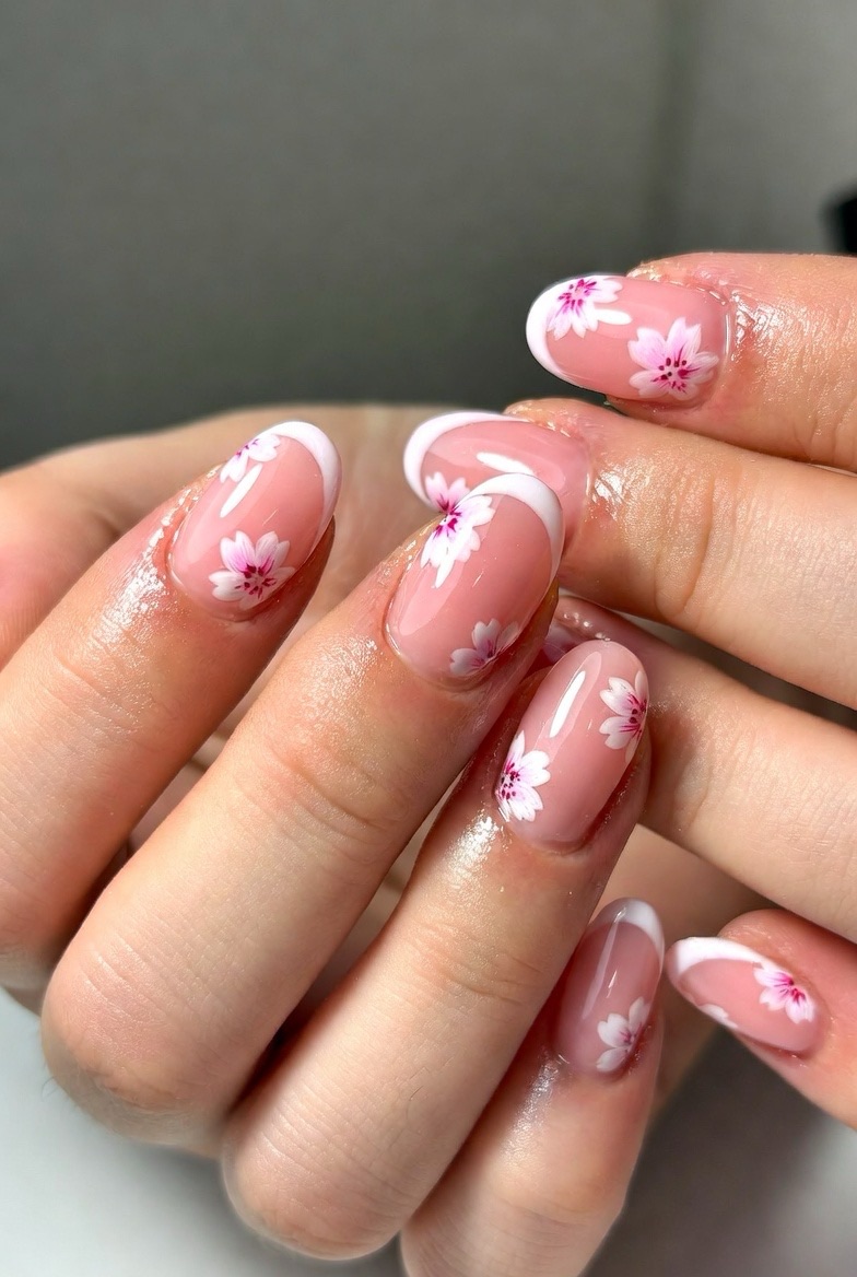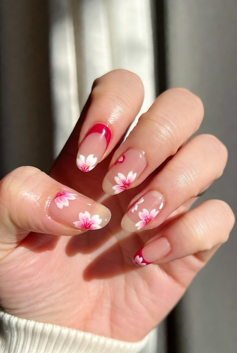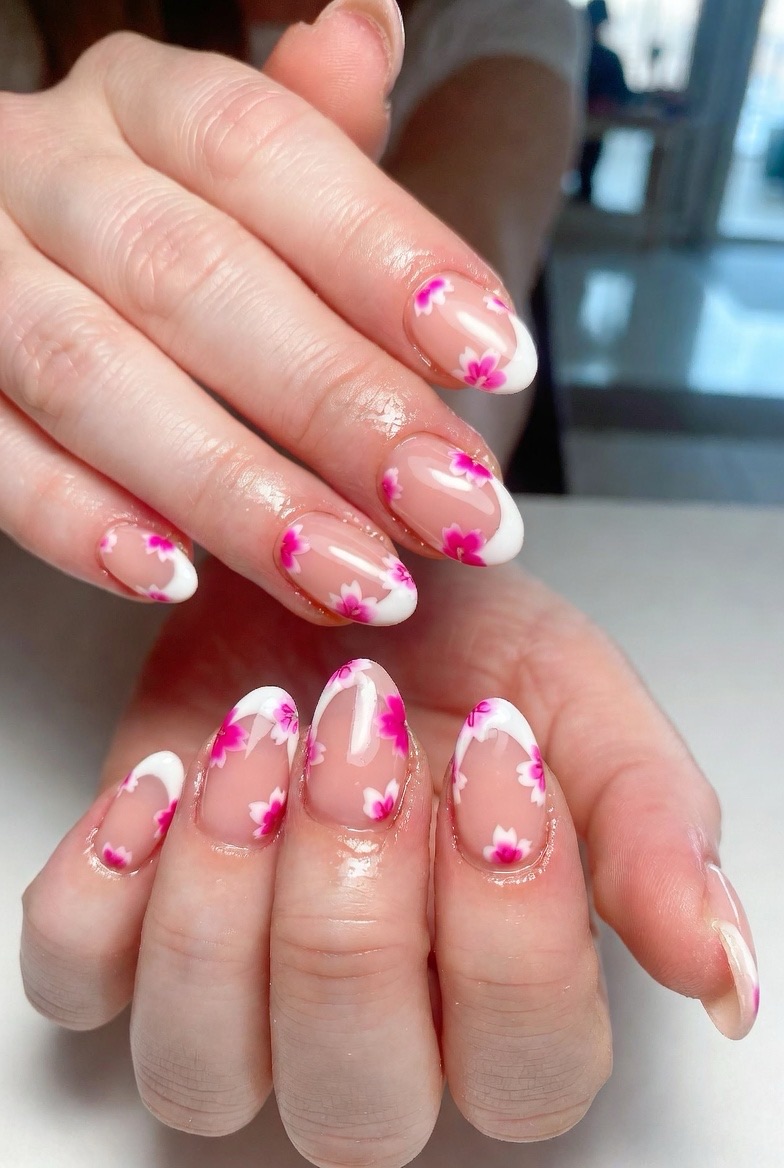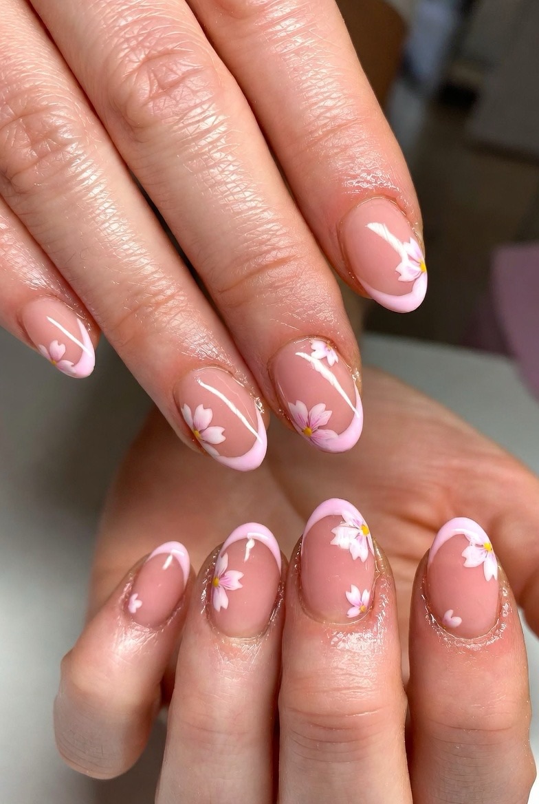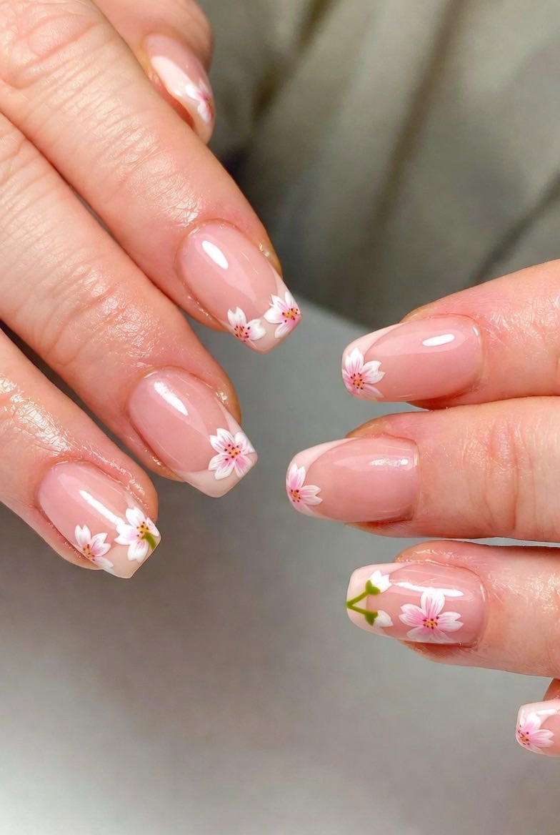 A classic take on cherry blossom nails, this look pairs gentle baby-pink tips with tiny hand-painted blossoms. The pastel French tip base softens the nails while the floral accents add charm and elegance. It’s perfect if you want something feminine yet simple enough for everyday wear.