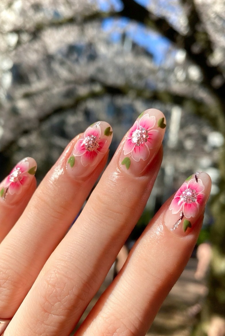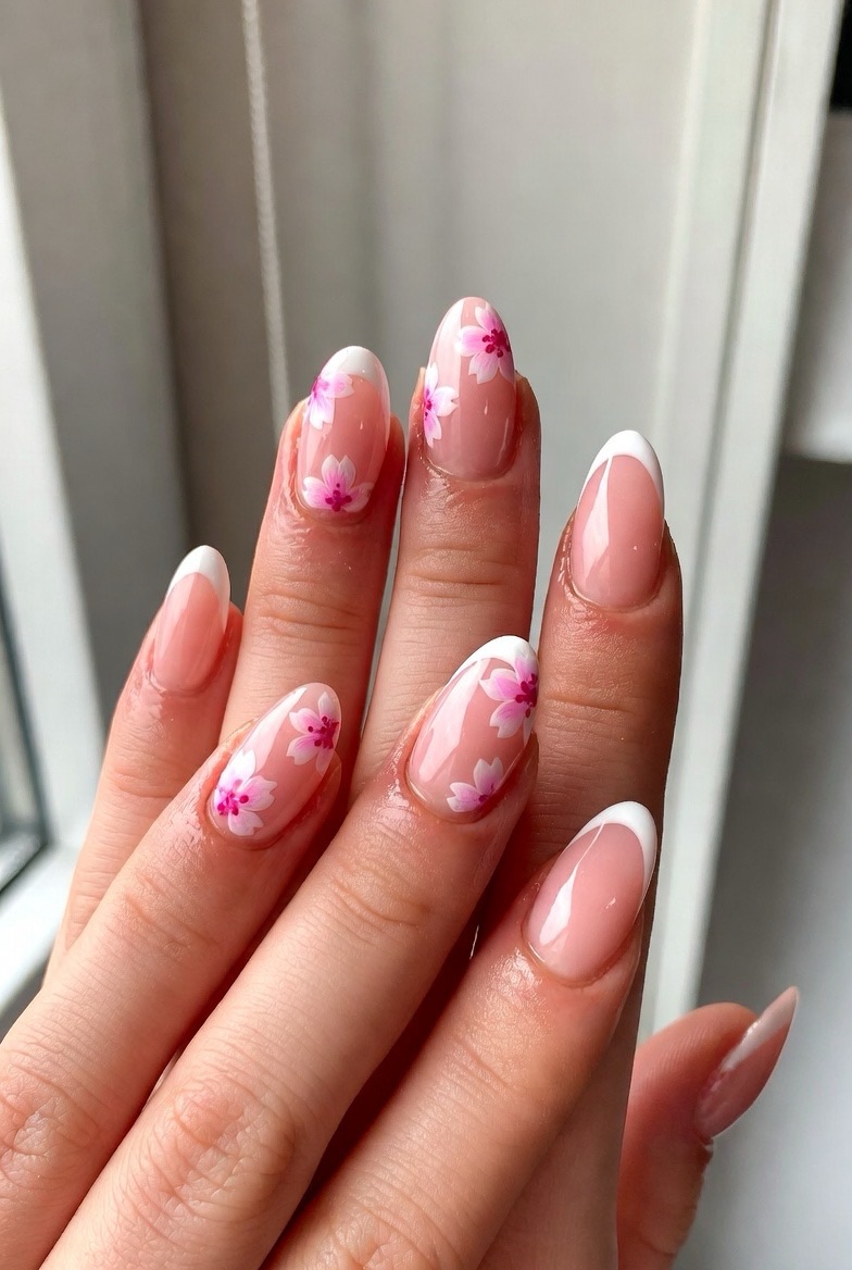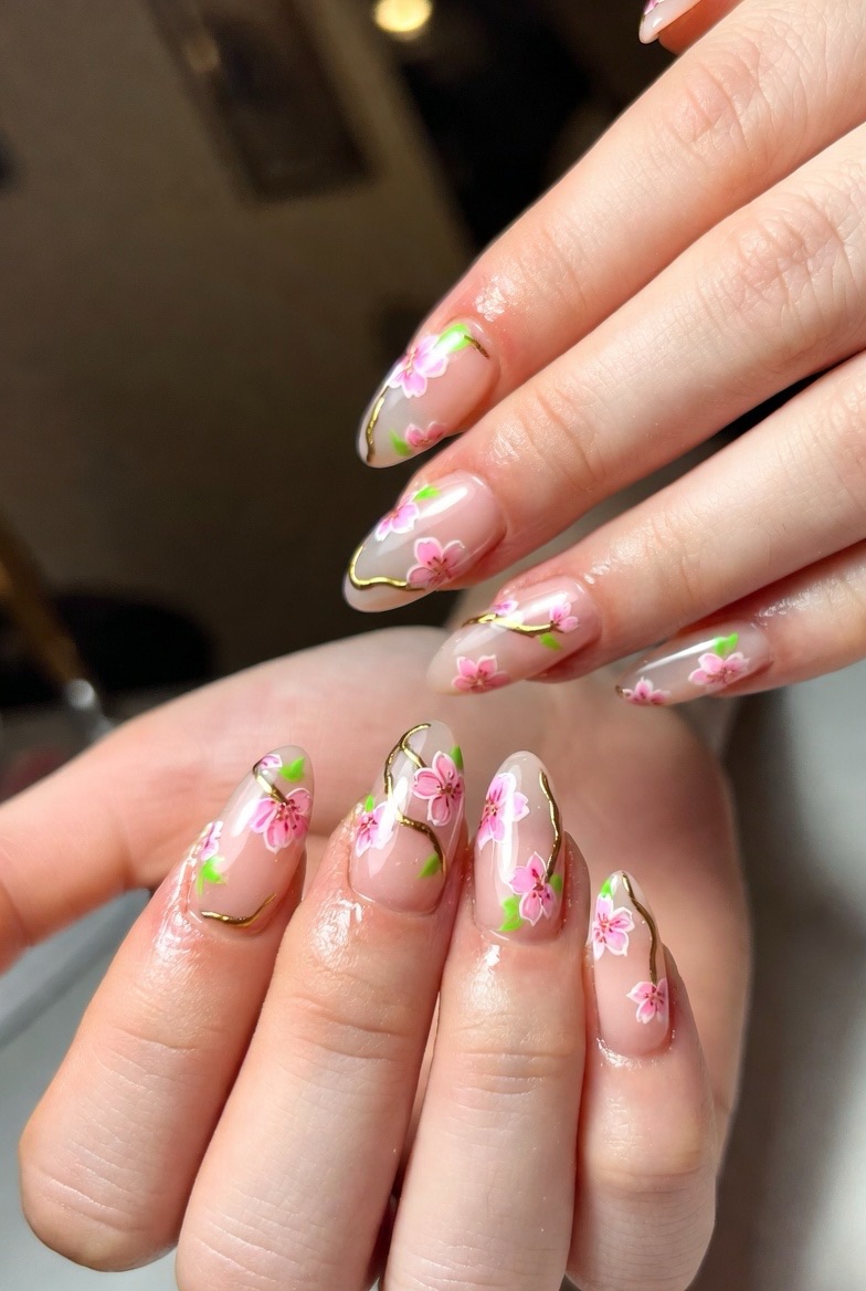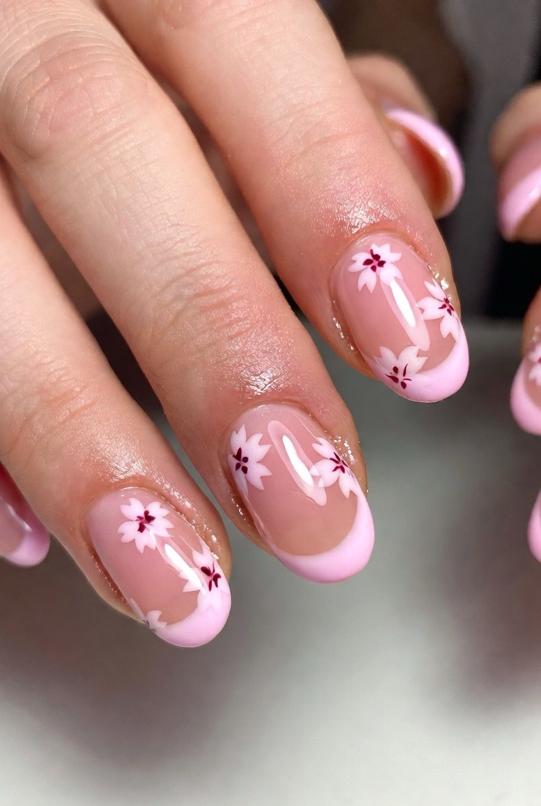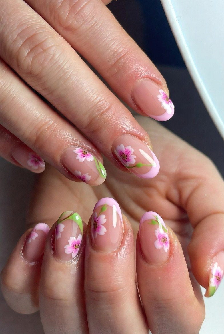 A classic take on cherry blossom nails, this look pairs gentle baby-pink tips with tiny hand-painted blossoms. The pastel French tip base softens the nails while the floral accents add charm and elegance. It’s perfect if you want something feminine yet simple enough for everyday wear.